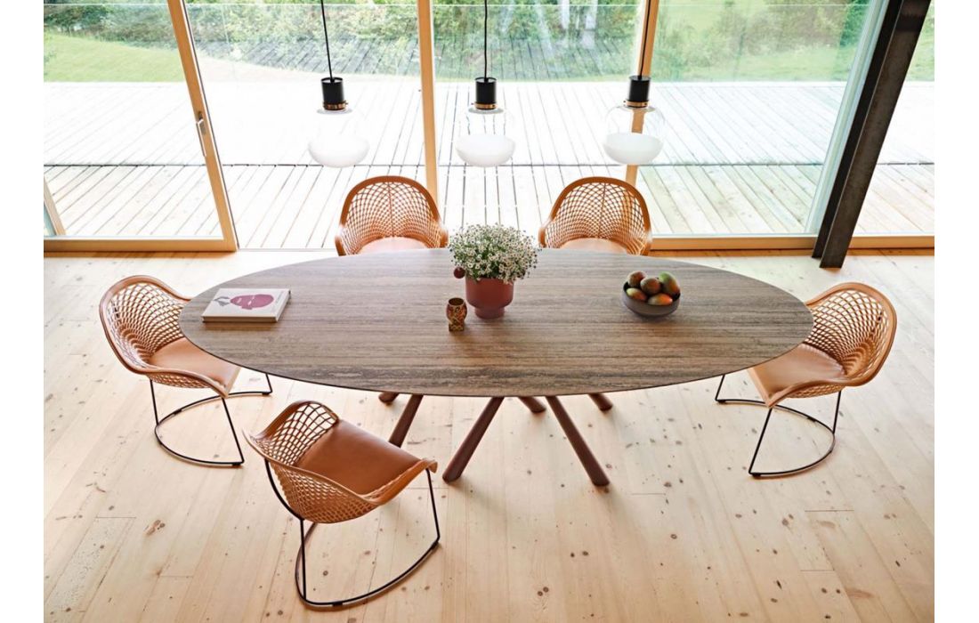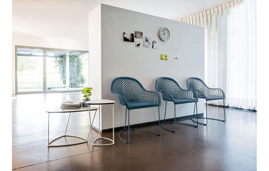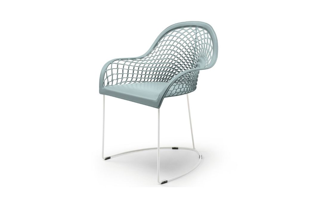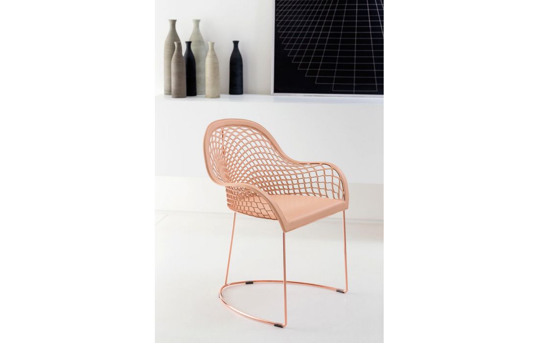 Cadeirão com base trenó, estrutura em metal com assento e encosto em couro.Destinatário :