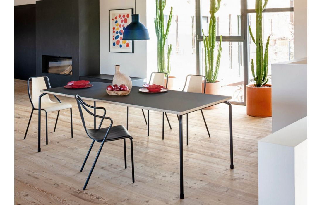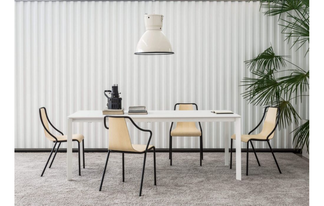 Cadeira com estrutura em metal lacado e concha em madeira.