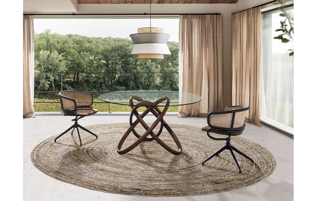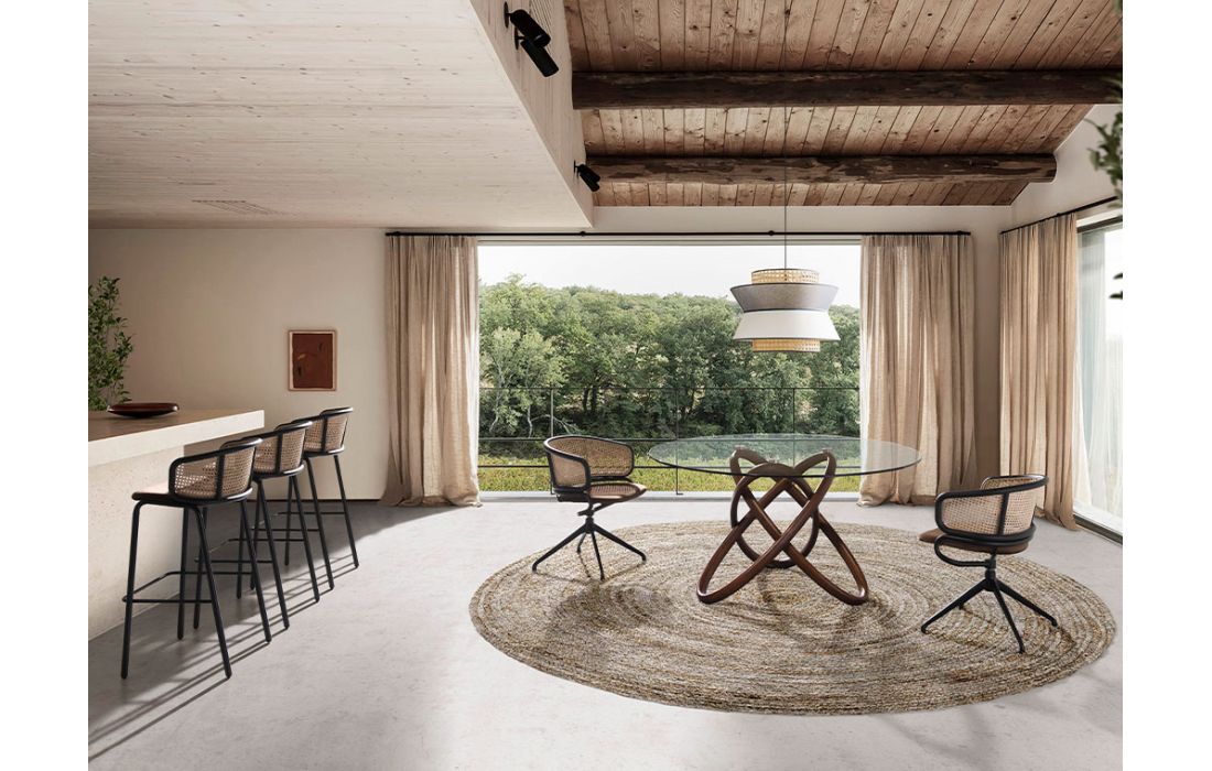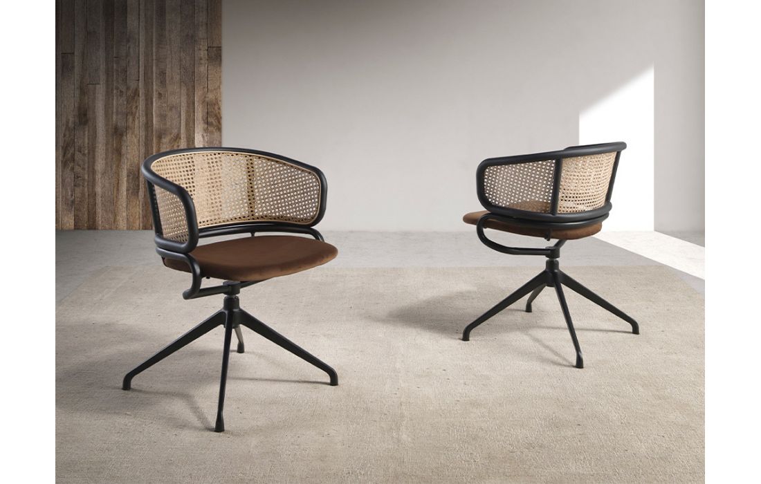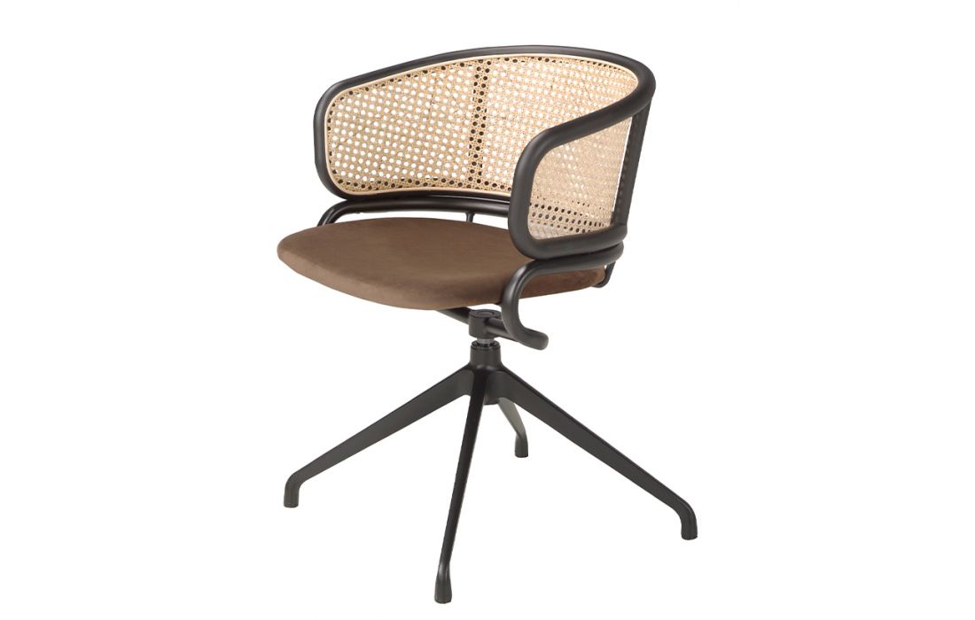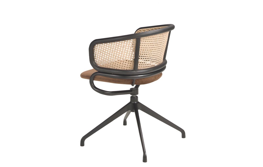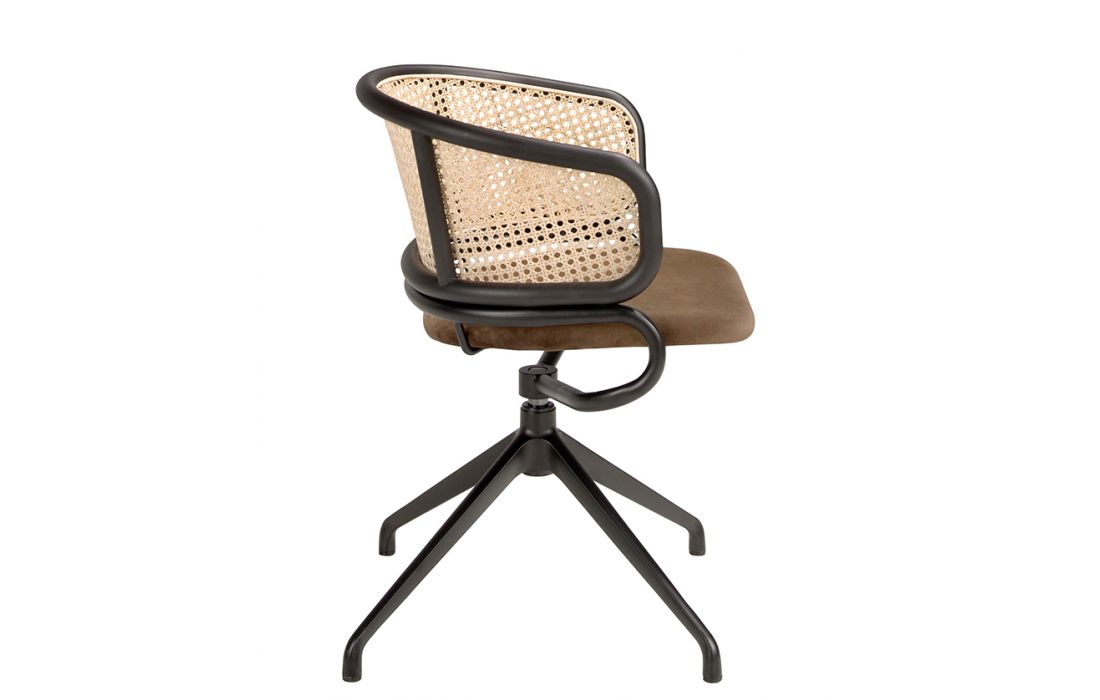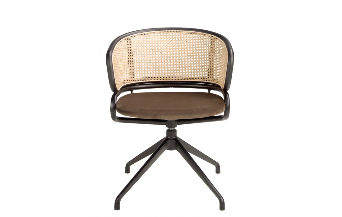 Cadeira giratória de braços, estofada em tecido aveludado castanho e encosto em palhinha natural com estrutura em aço inoxidável preto