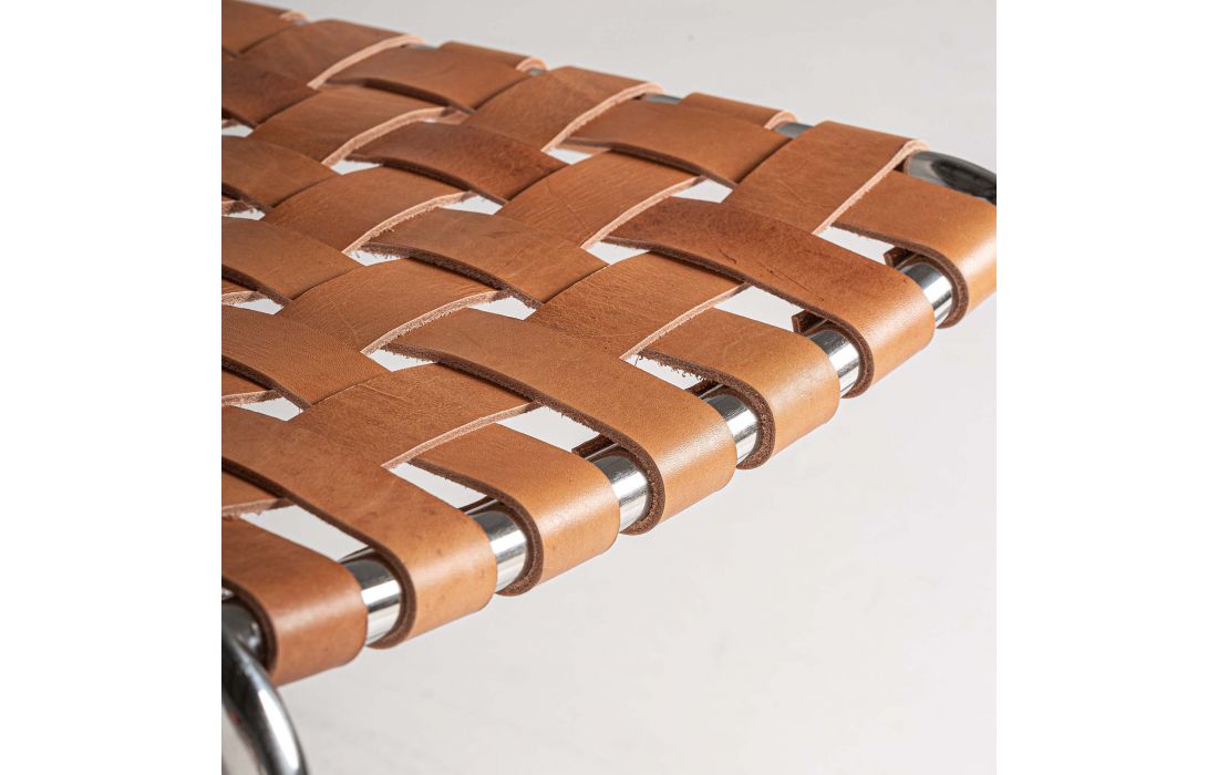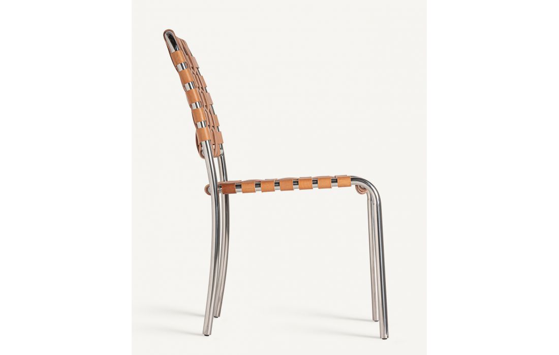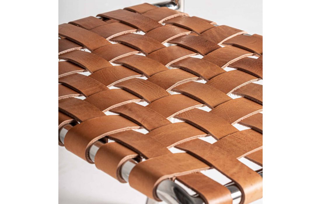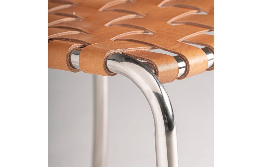 Cadeira de aço prata, assento e costa em pele cor castanha