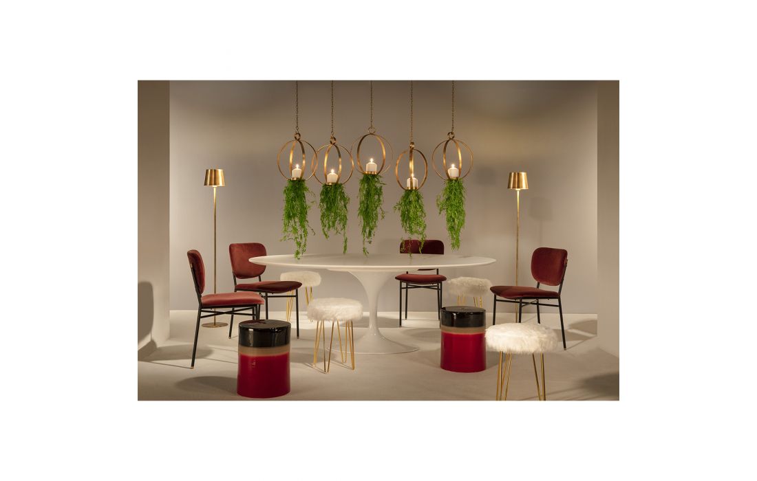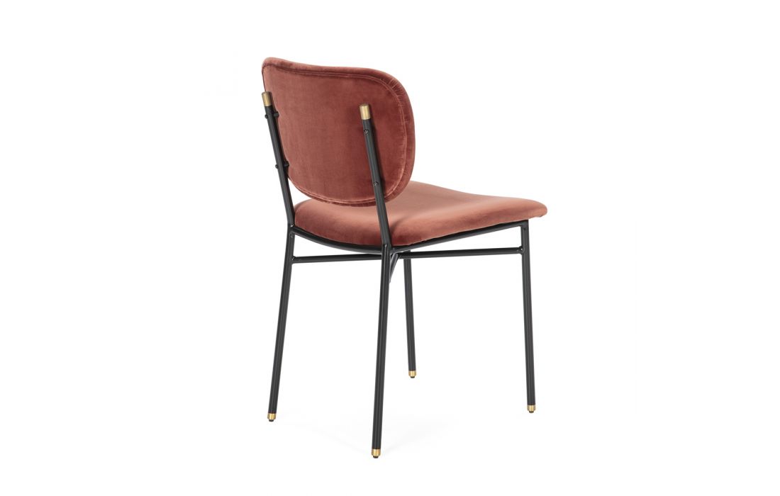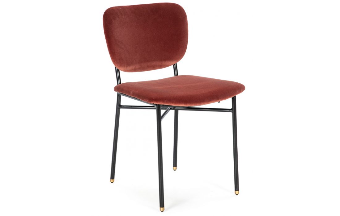Cadeira em metal preto com tecido em aveludado vermelho.