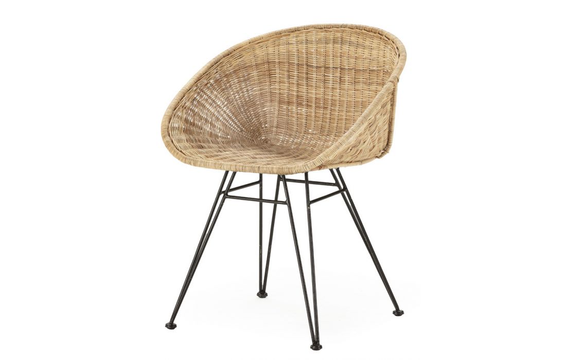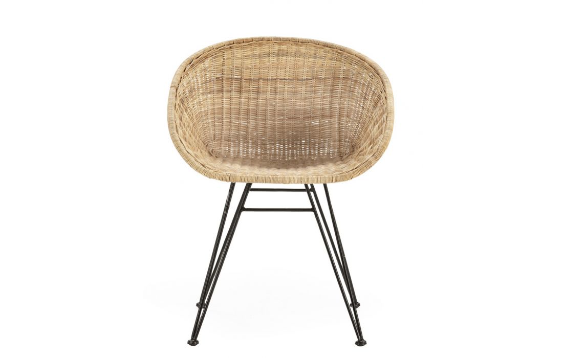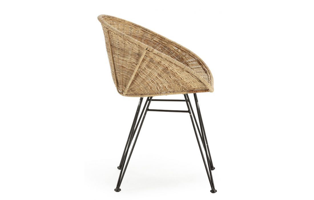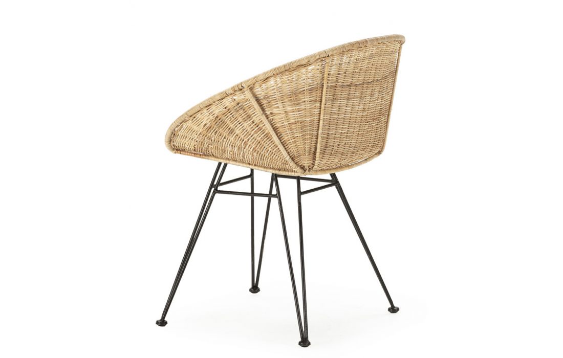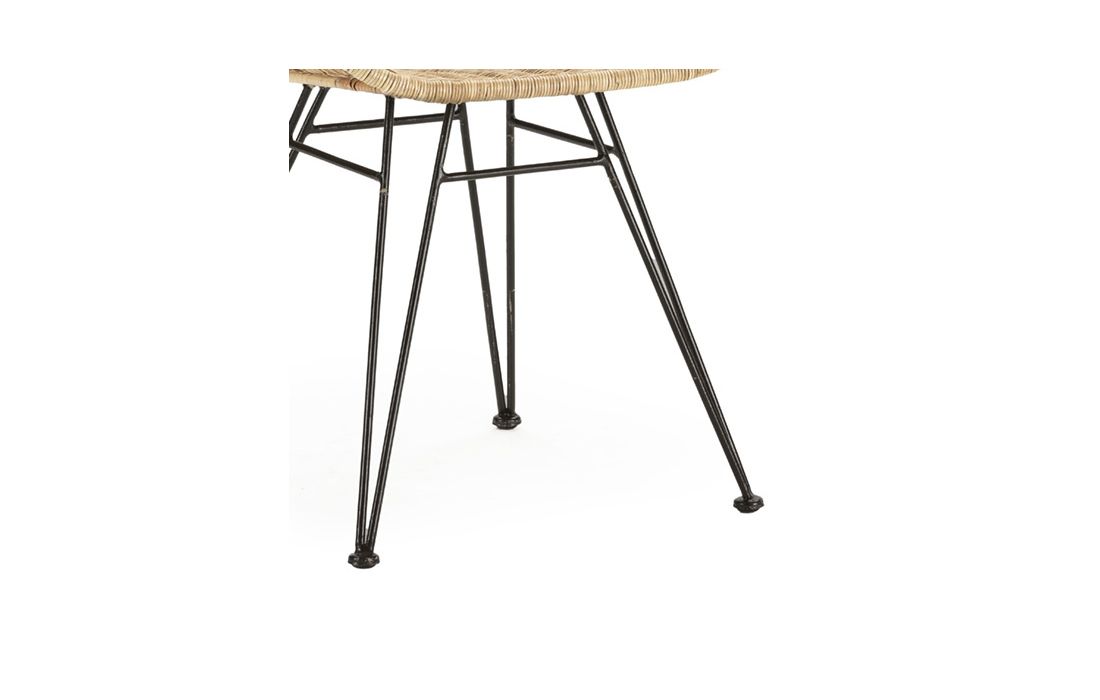 Cadeira com estrutura de metal preto, assento e costa em vime cor natural