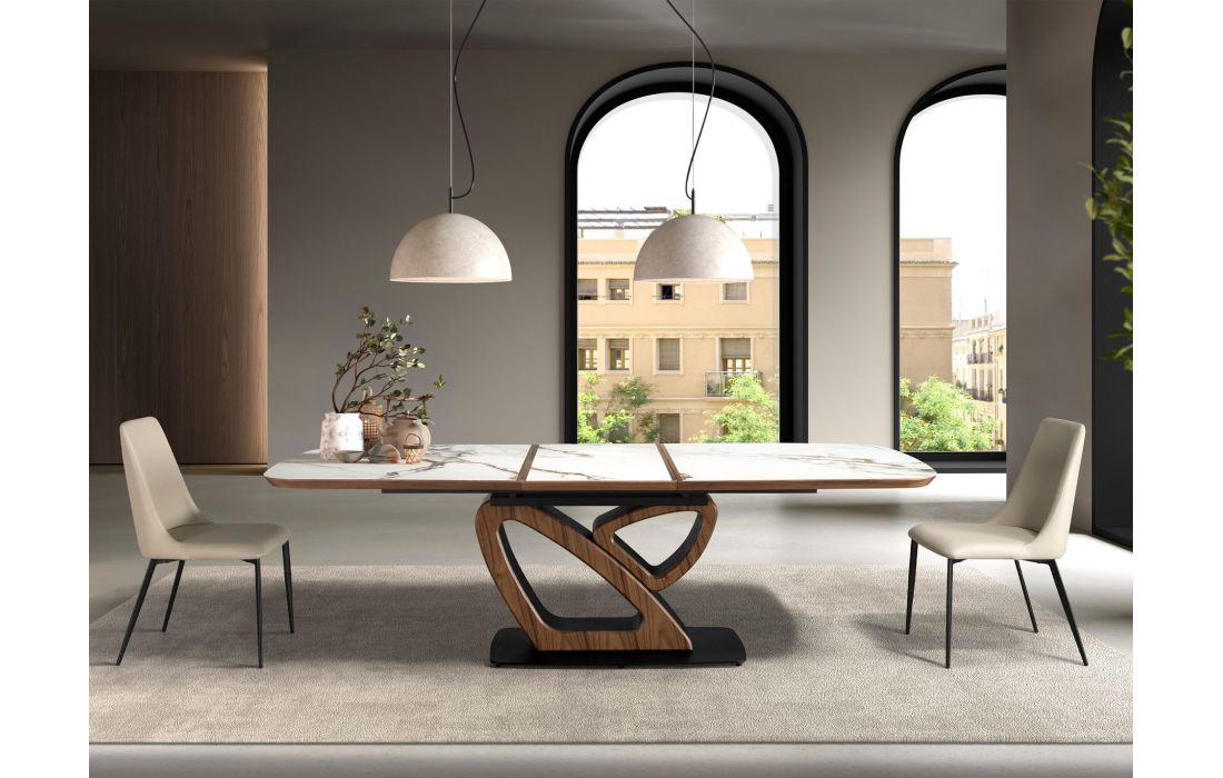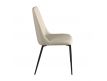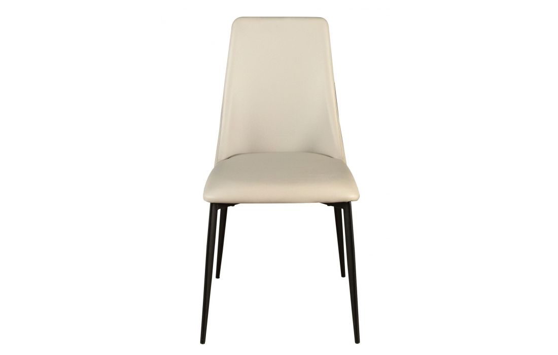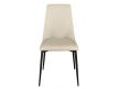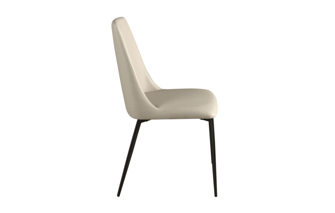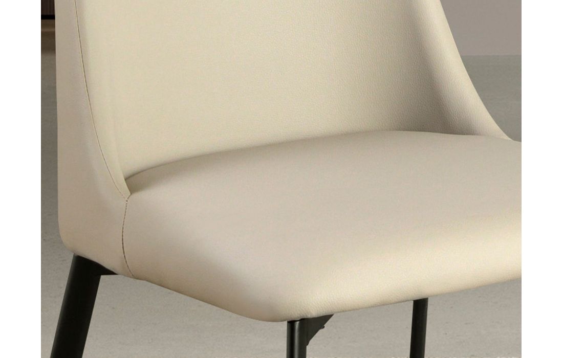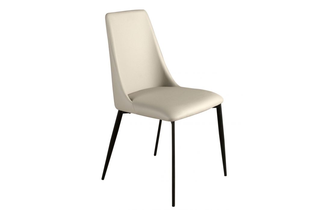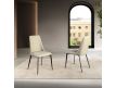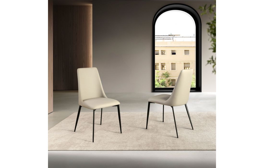 Cadeira de design moderno com assento e encosto estofados em couro sintético cor de areia e as suas pernas em aço inoxidável , com um estilo vanguardista mas intemporalDestinatário :