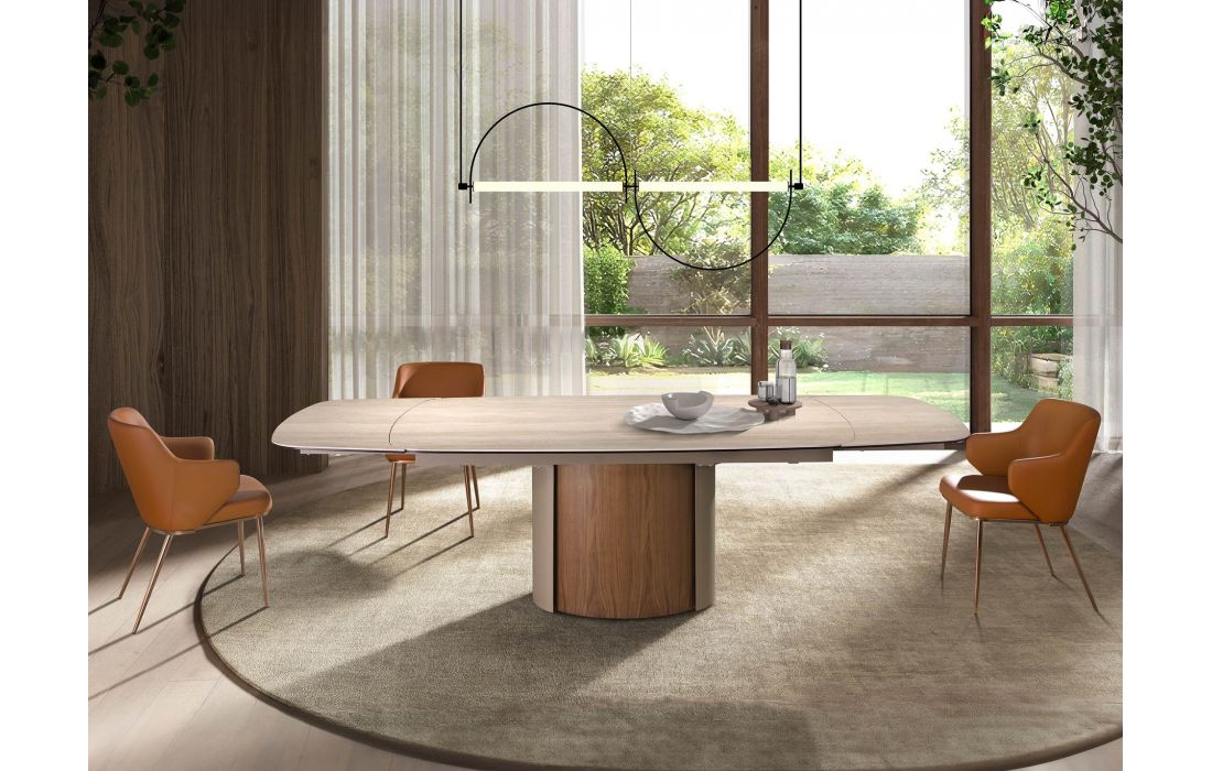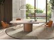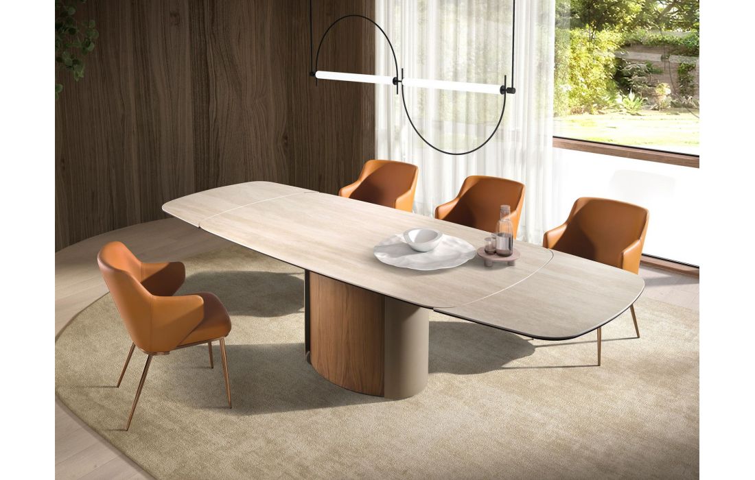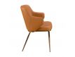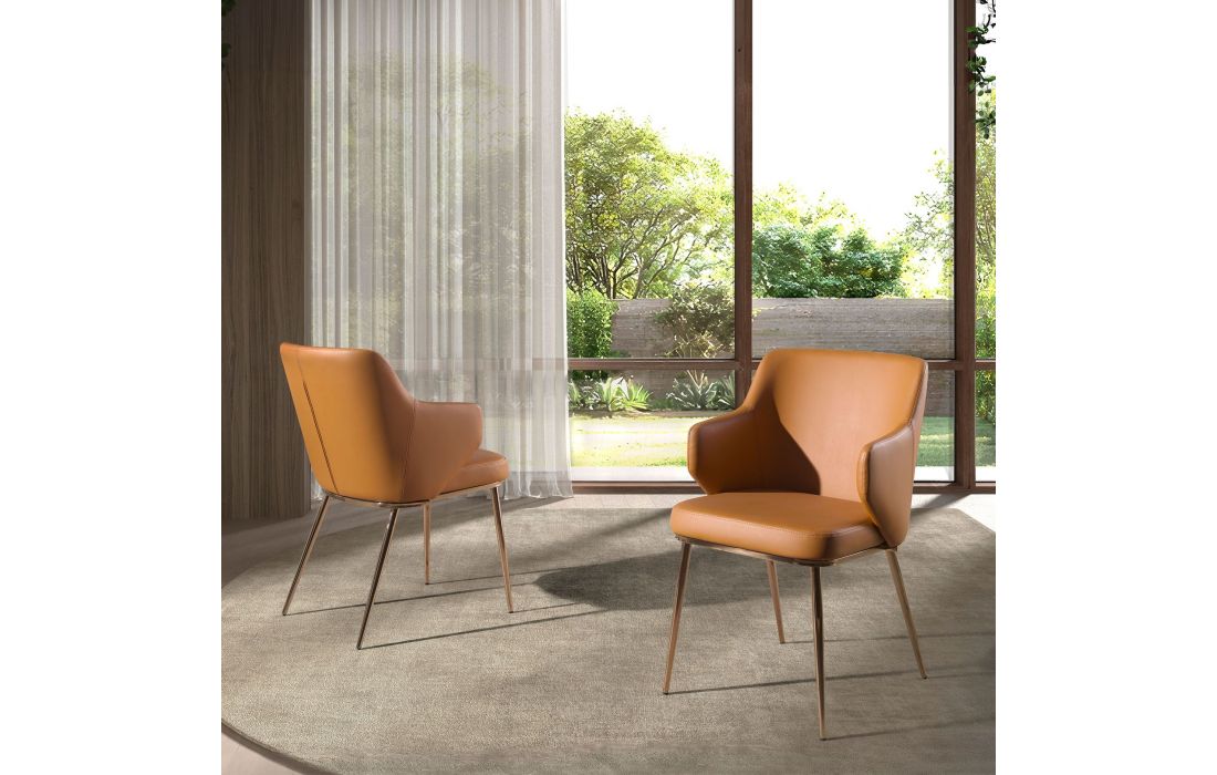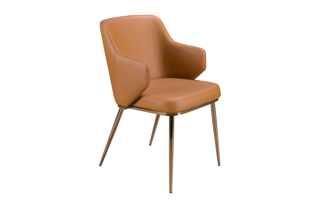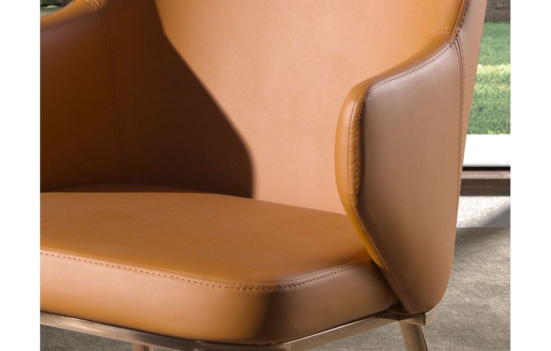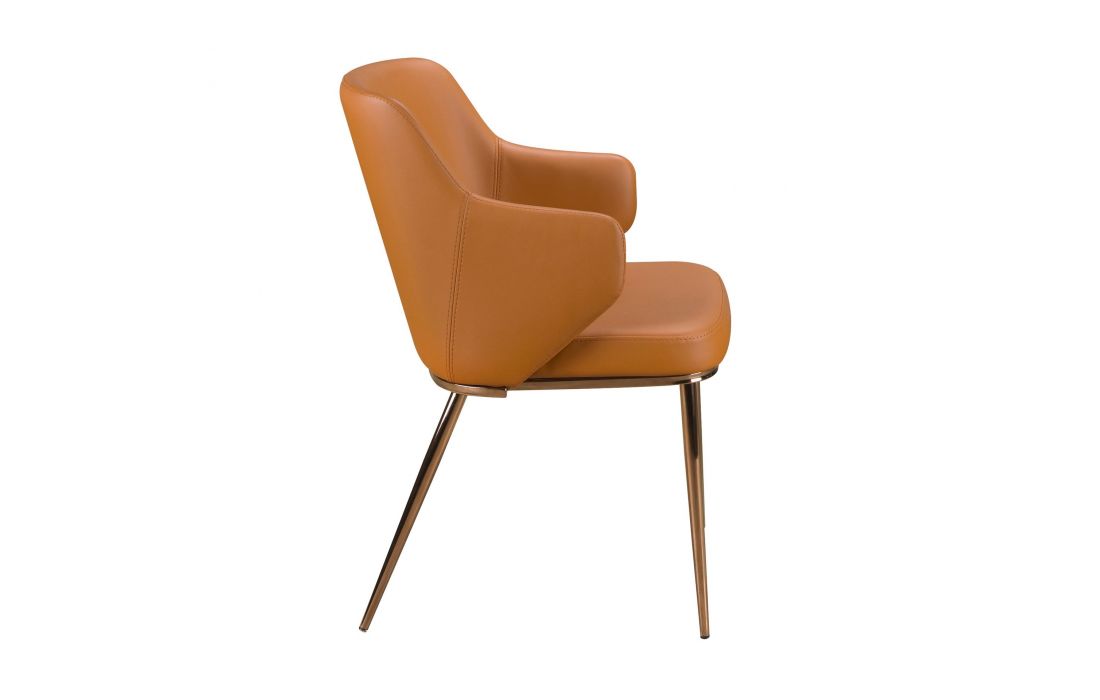 Cadeira com braços de design moderno com assento e encosto estofados em couro sintético e as suas pernas em aço inoxidável cromado em cor de ouro rosa com um estilo vanguardista, mas intemporalDestinatário :
