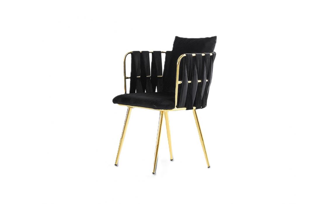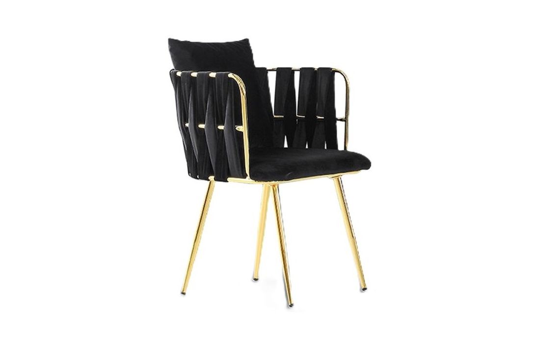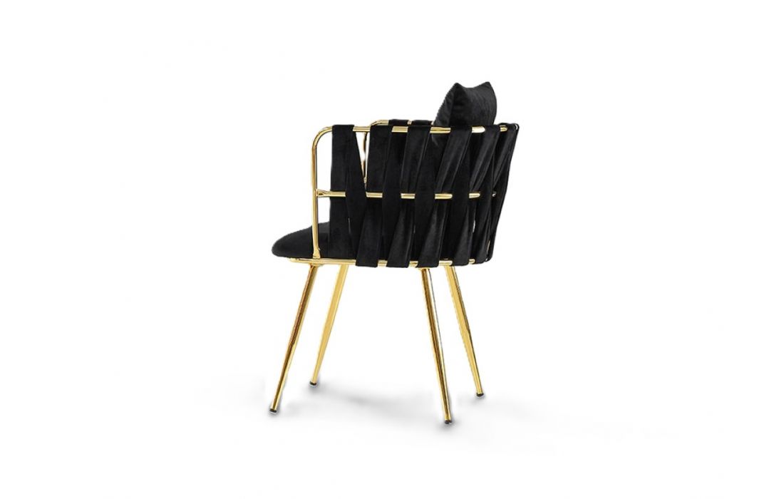 Cadeira fabricada em metal e com assento estofado em veludo encosto com faixas entrelaçadas do mesmo tecidoDestinatário :