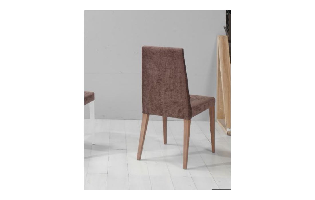 Cadeira moderna com estofo em pele sintética ou tecido, pode ser acabada em lacado alto brilho, mate ou folha de madeira.
