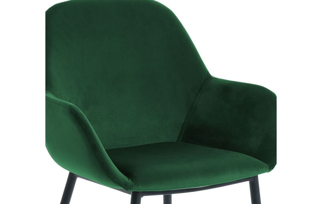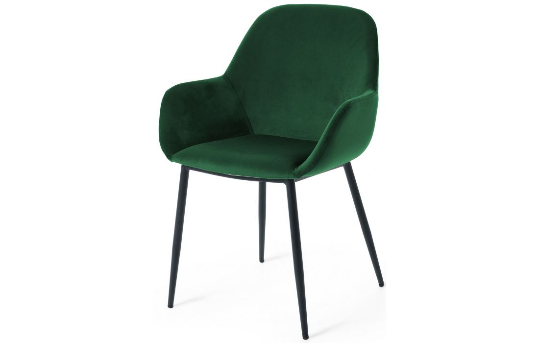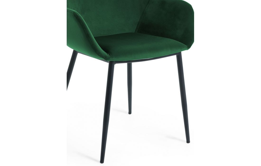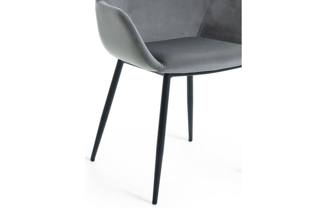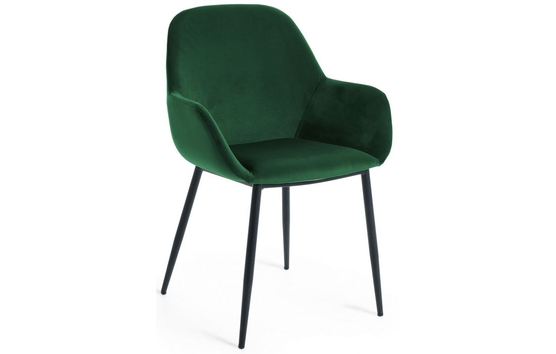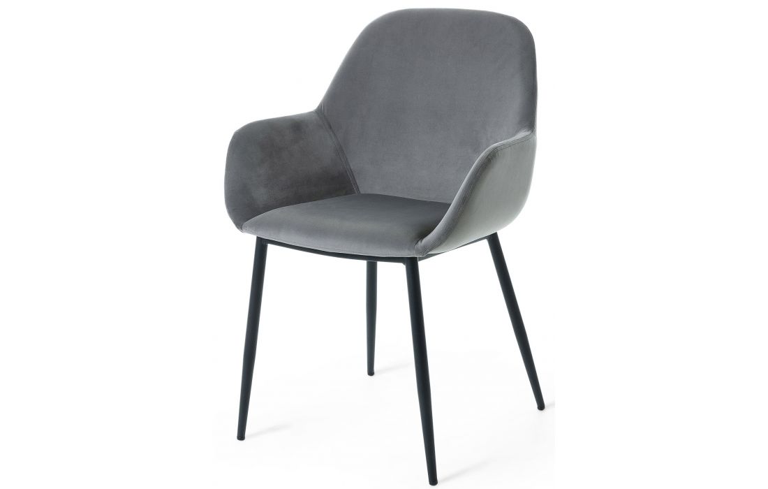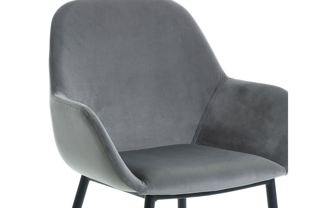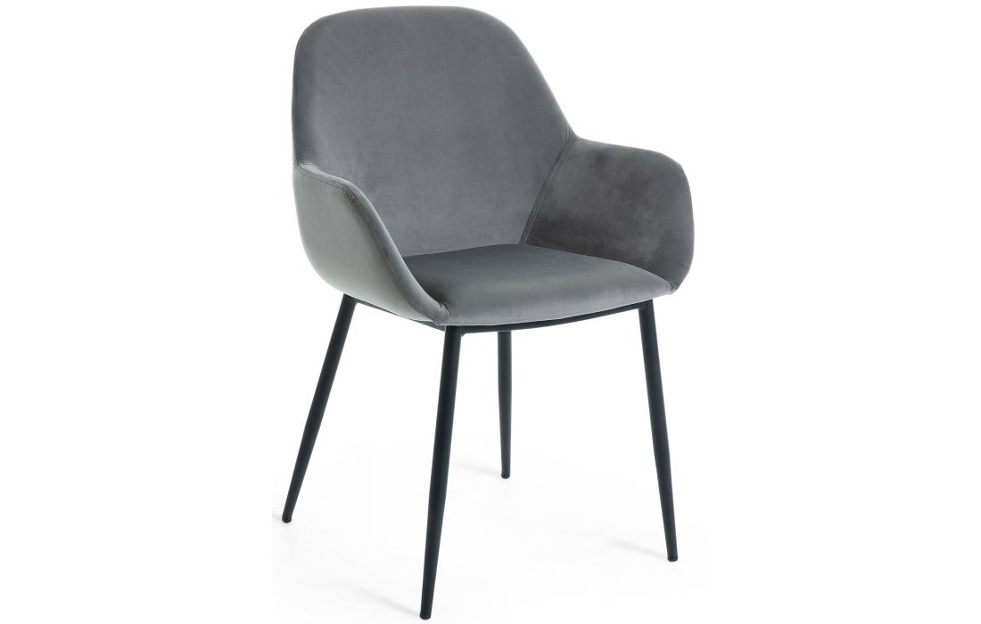 Cadeira com braços, estofada em tecido de veludo de cor cinza ou verde. Pés em metal preto.