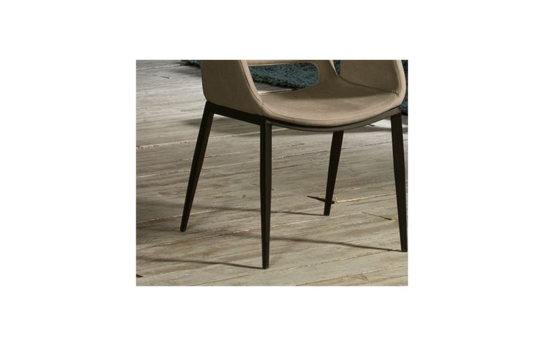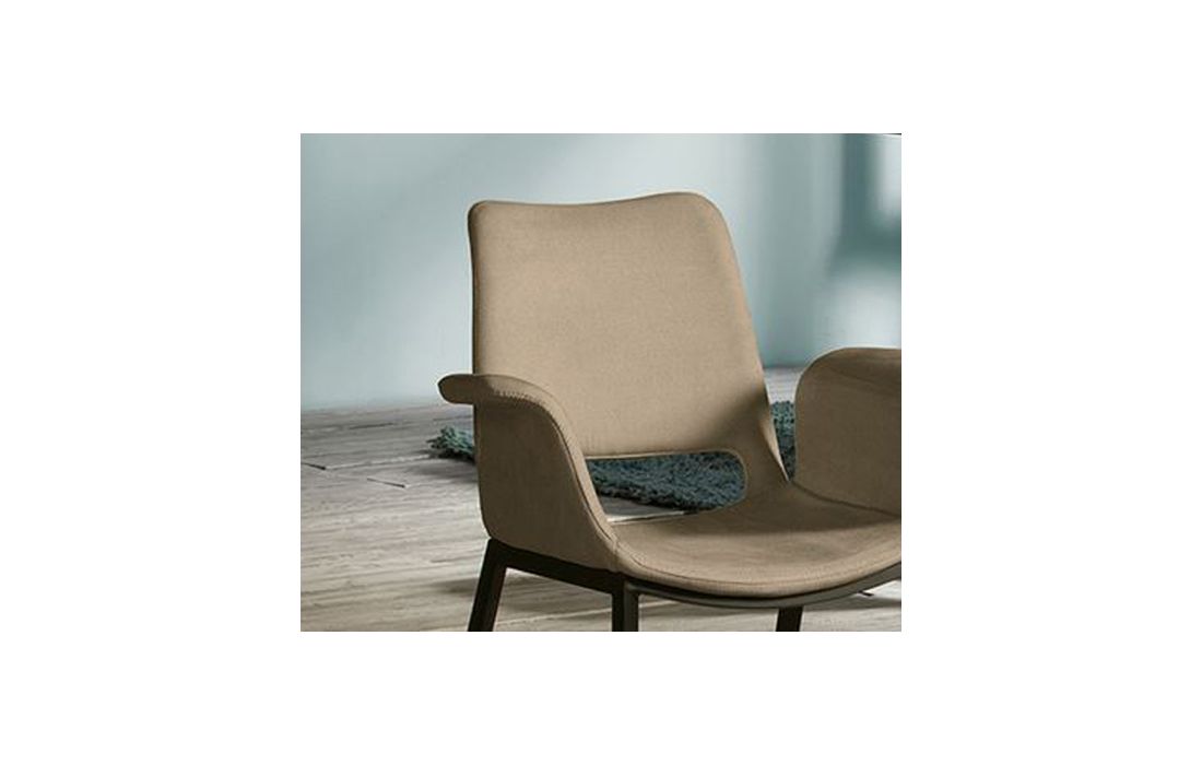 Cadeirão em metal com acabamento em preto mate. Assento e encosto de madeira contraplacada e espuma. Forro em tecido de poliéster em cor beje, com pesponto decorativo.