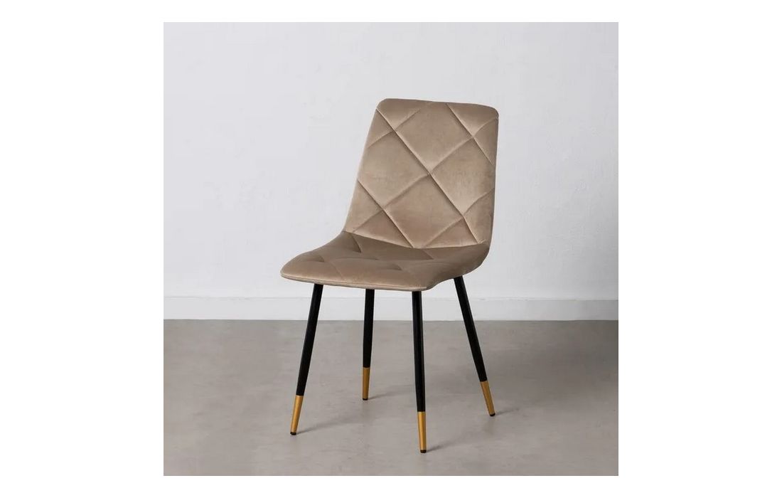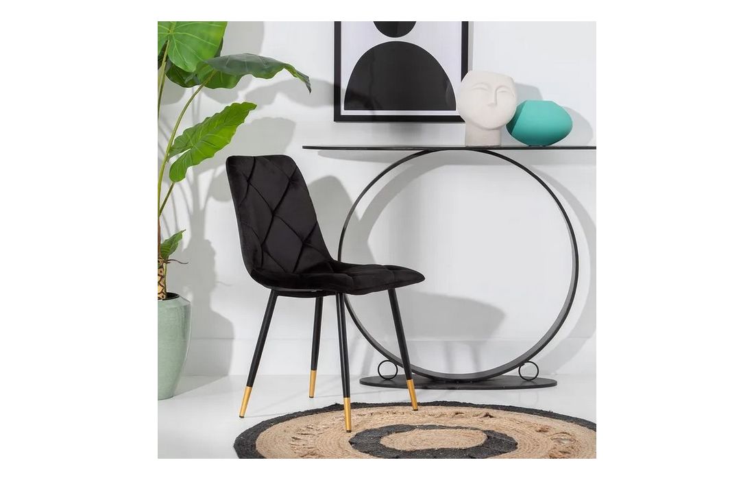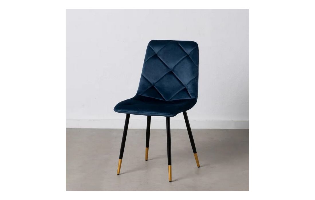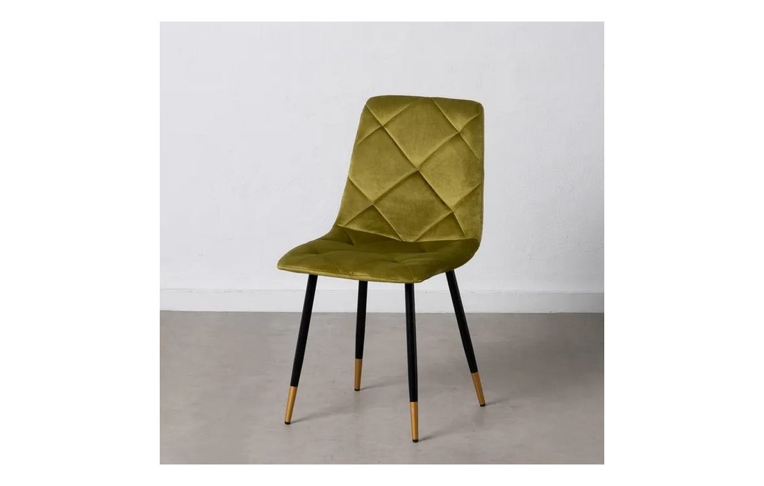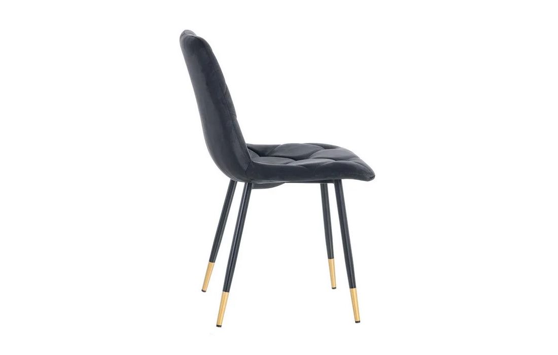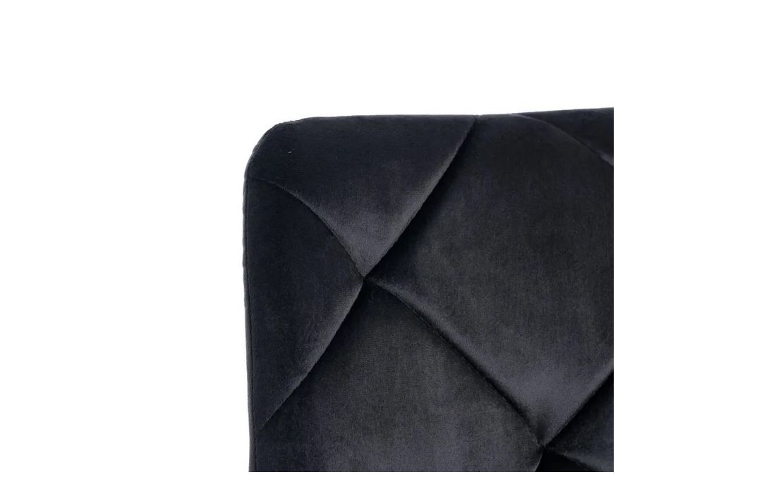 Cadeira feita em metal preto com pormenor dourado nas pernas e em tecido de veludo.
