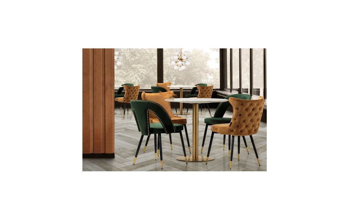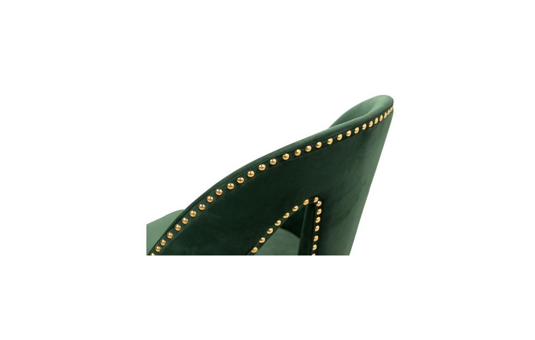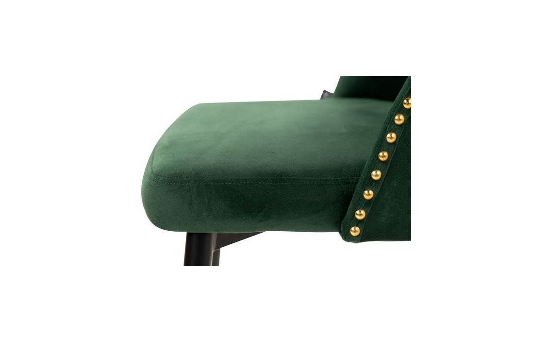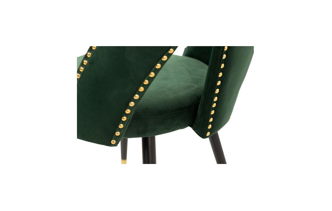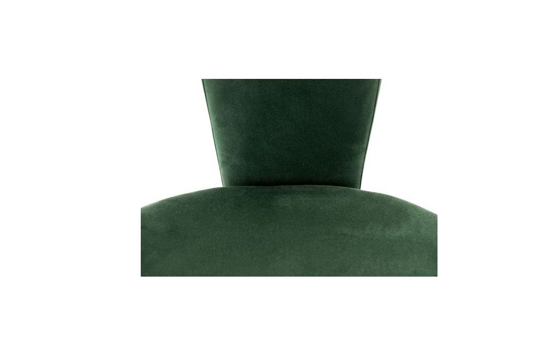 Cadeira em veludo de cor verde com os pés em ferro pintados em preto e detalhes dourados