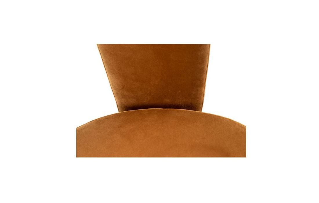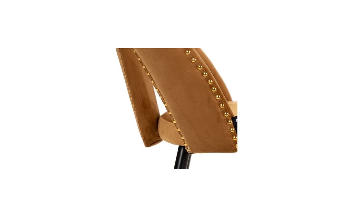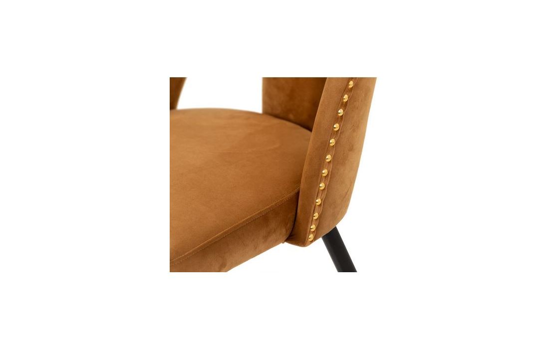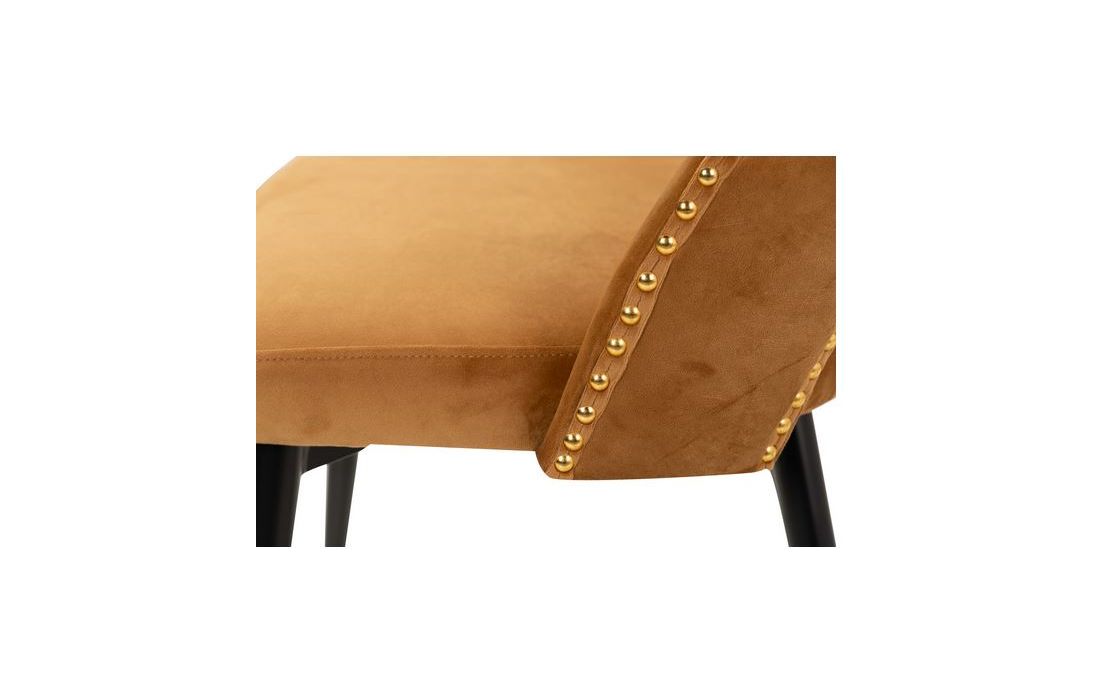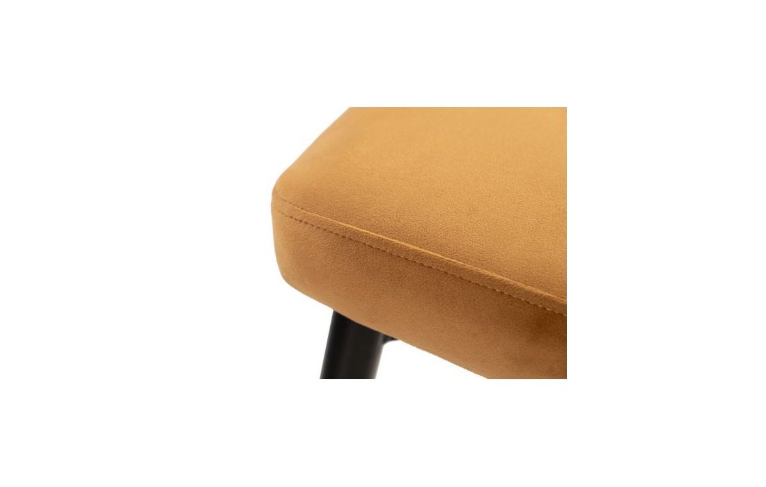 Cadeira em veludo de cor amarelo com os pés em ferro pintados em preto e detalhes dourados