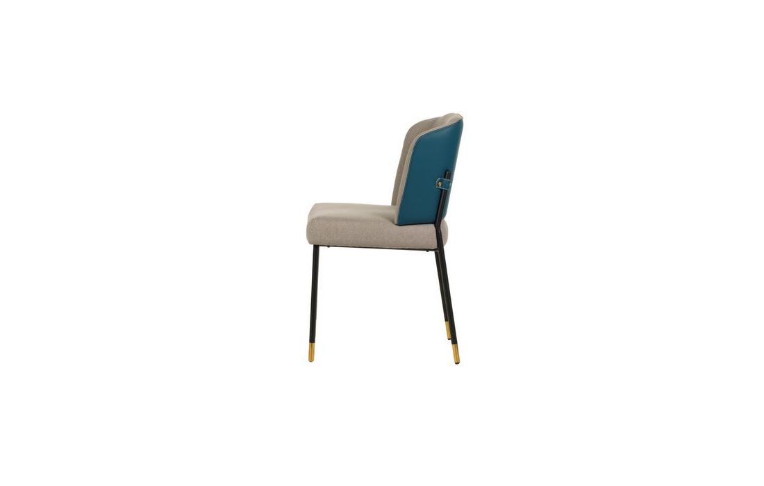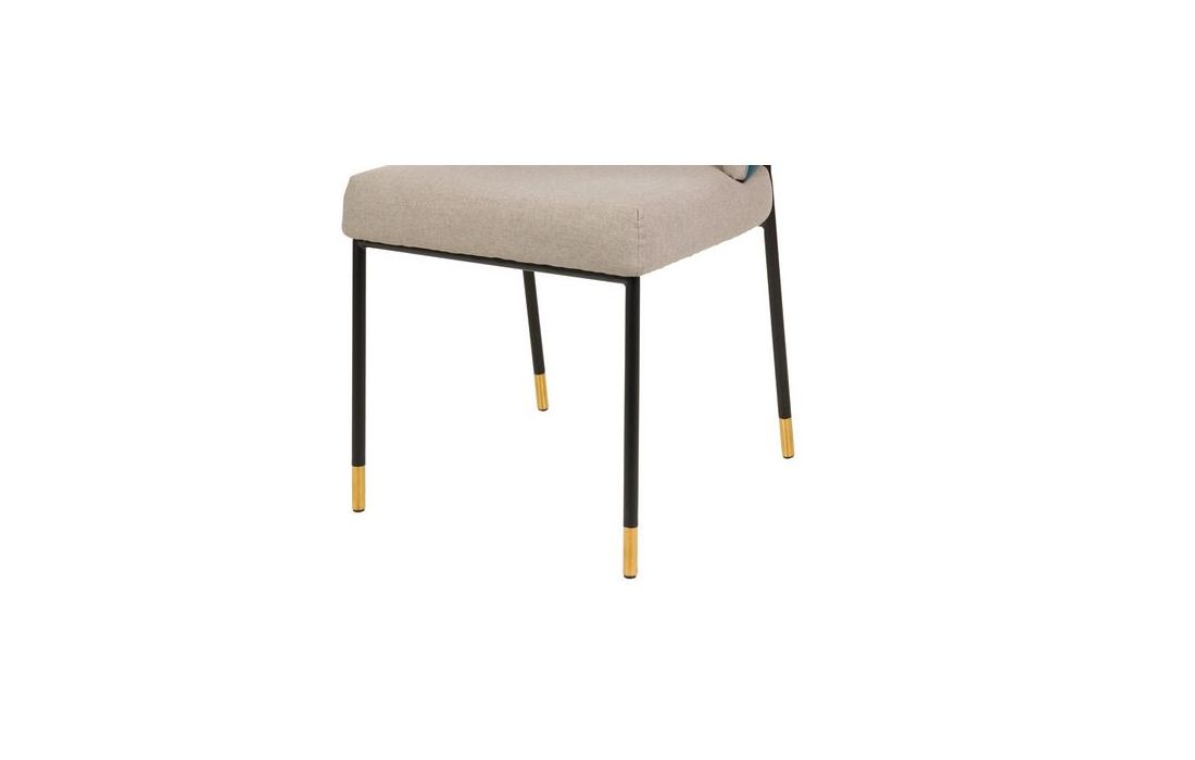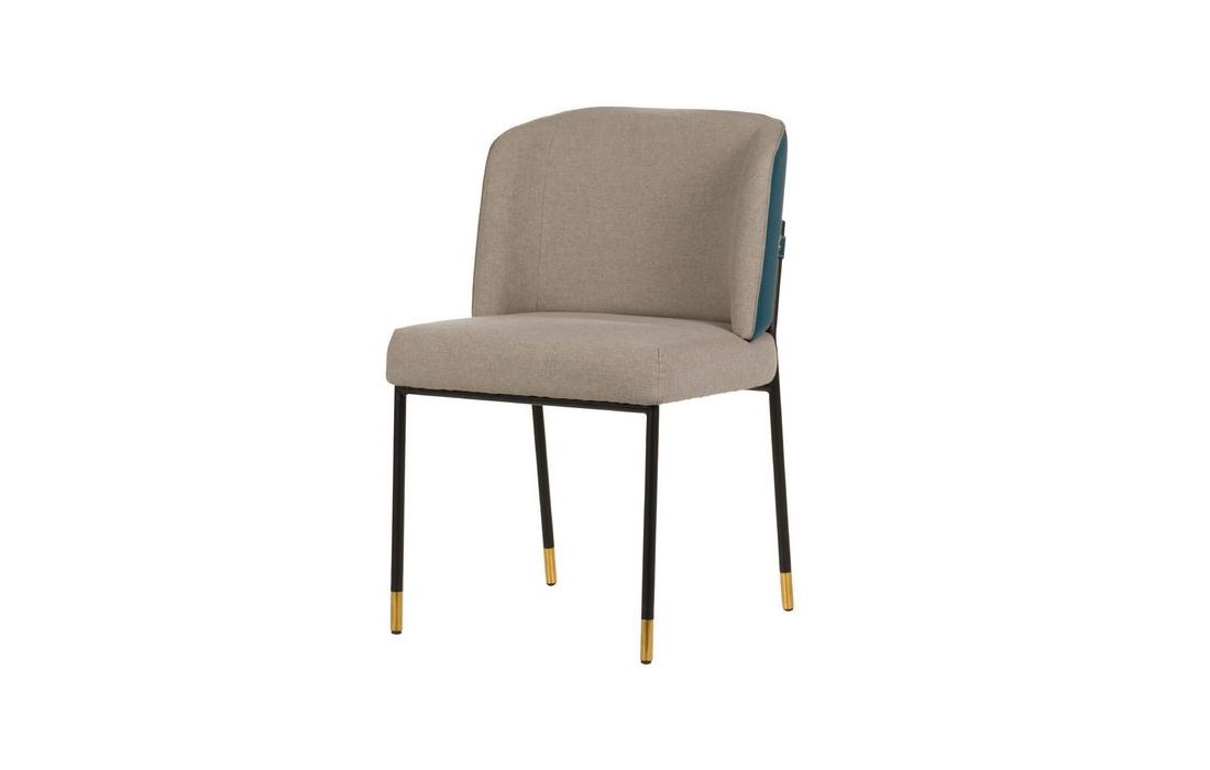 Cadeira em tecido cinza com as costas em azul e os pés pintados a preto com detalhes dourados