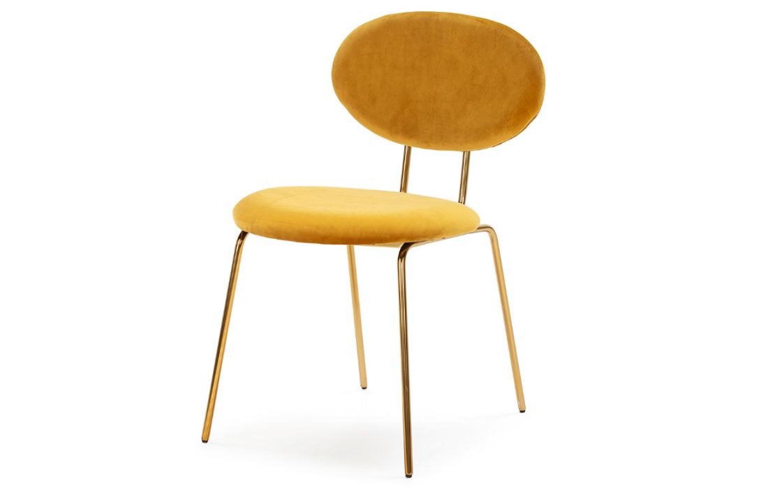 Cadeira em metal dourado com tecido aveludado amarelo.