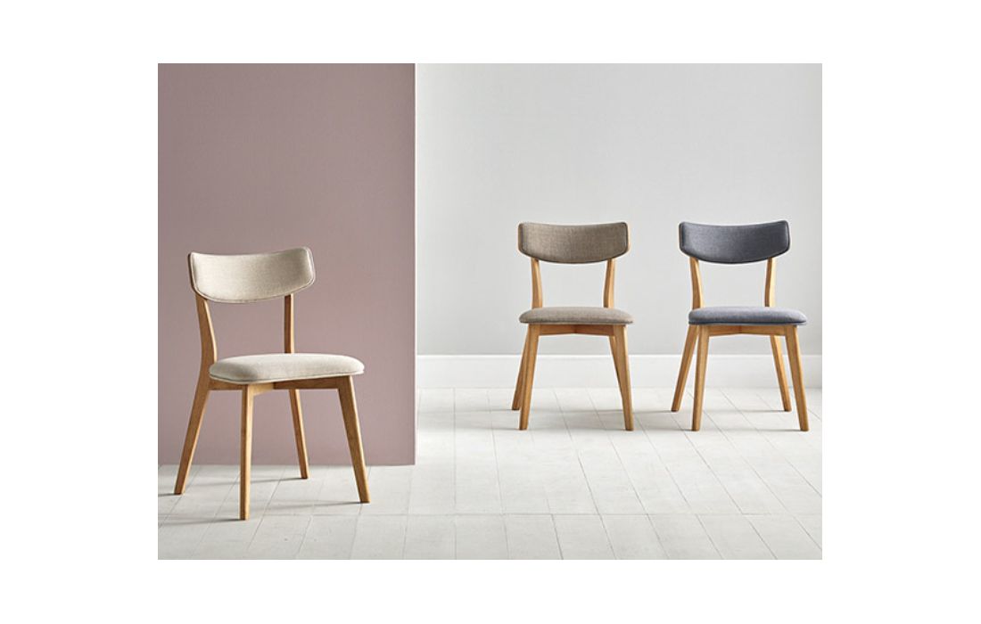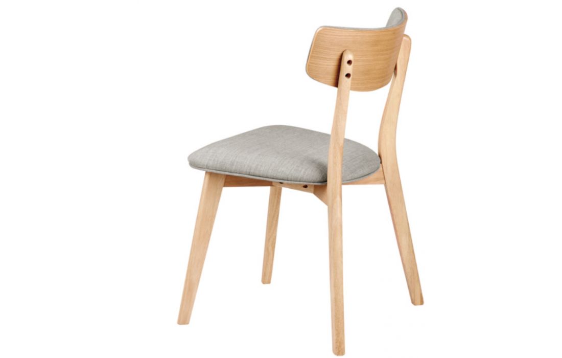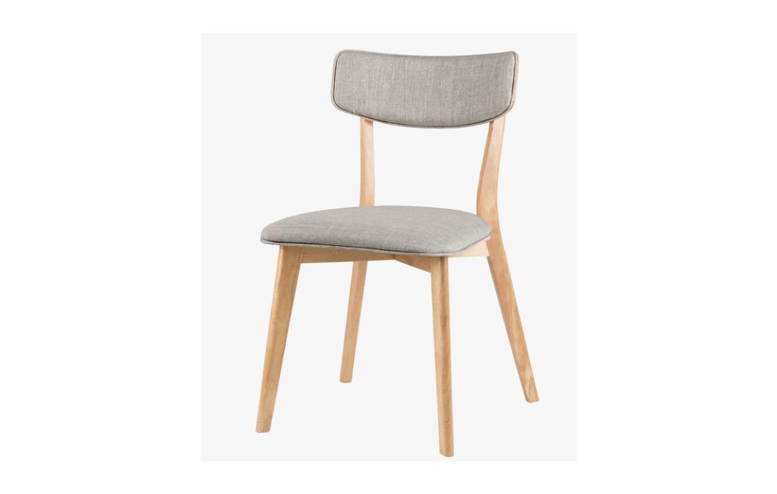 Cadeira de madeira combinada em carvalho e tecido cinza claro.