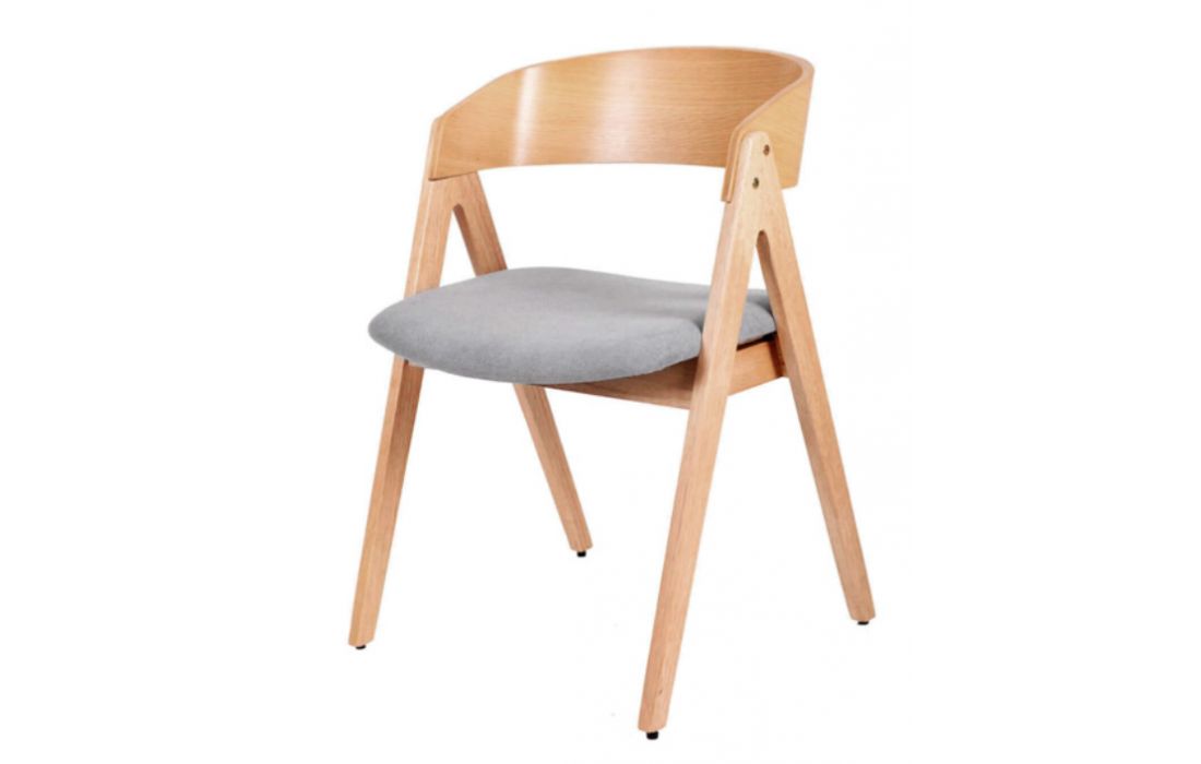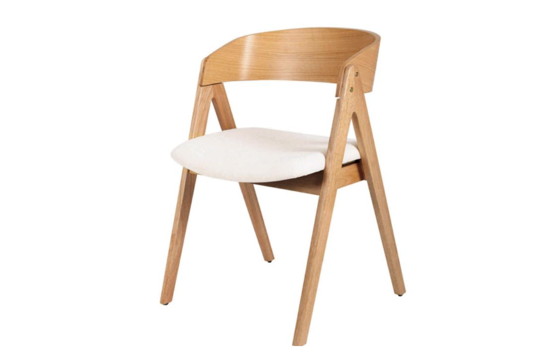 Cadeira de madeira combinada em carvalho e tecido bege.