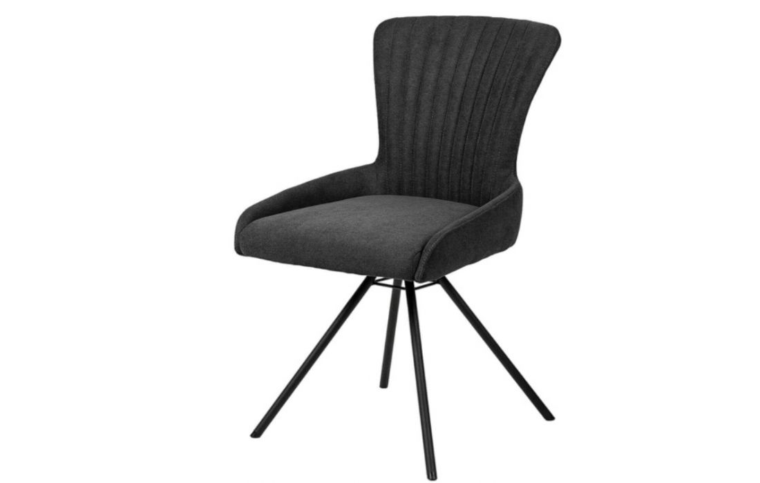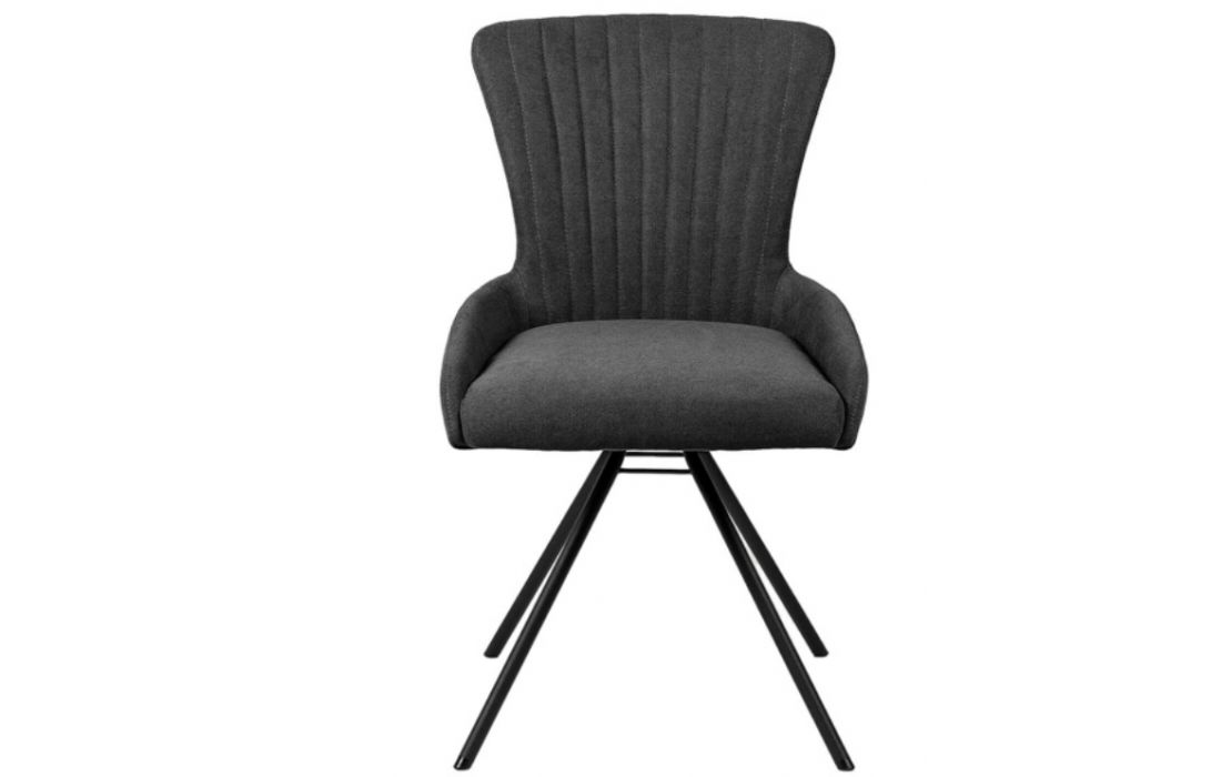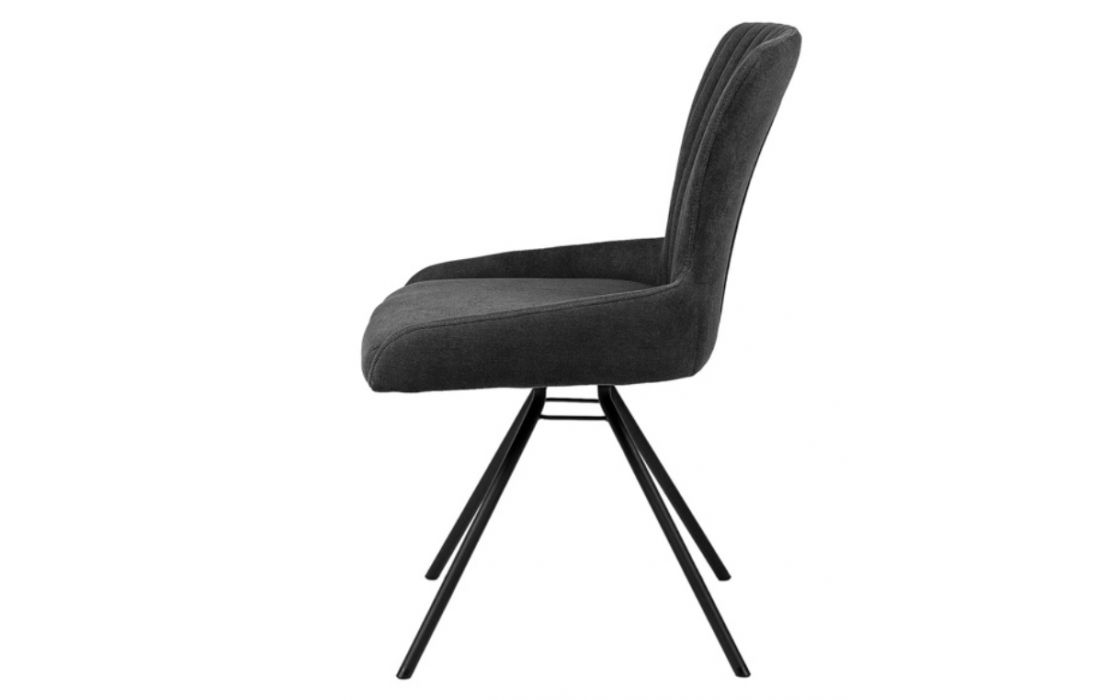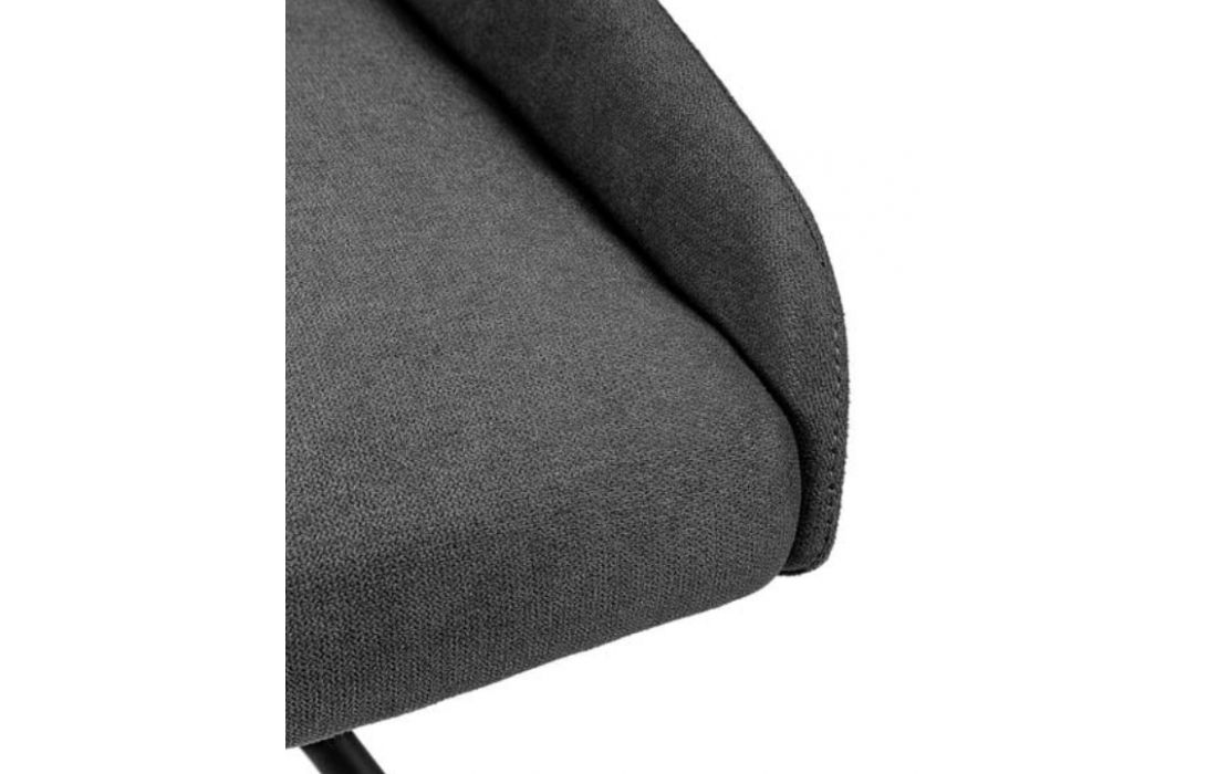 Cadeira com estofo cinza escuro e pés em metal preto.