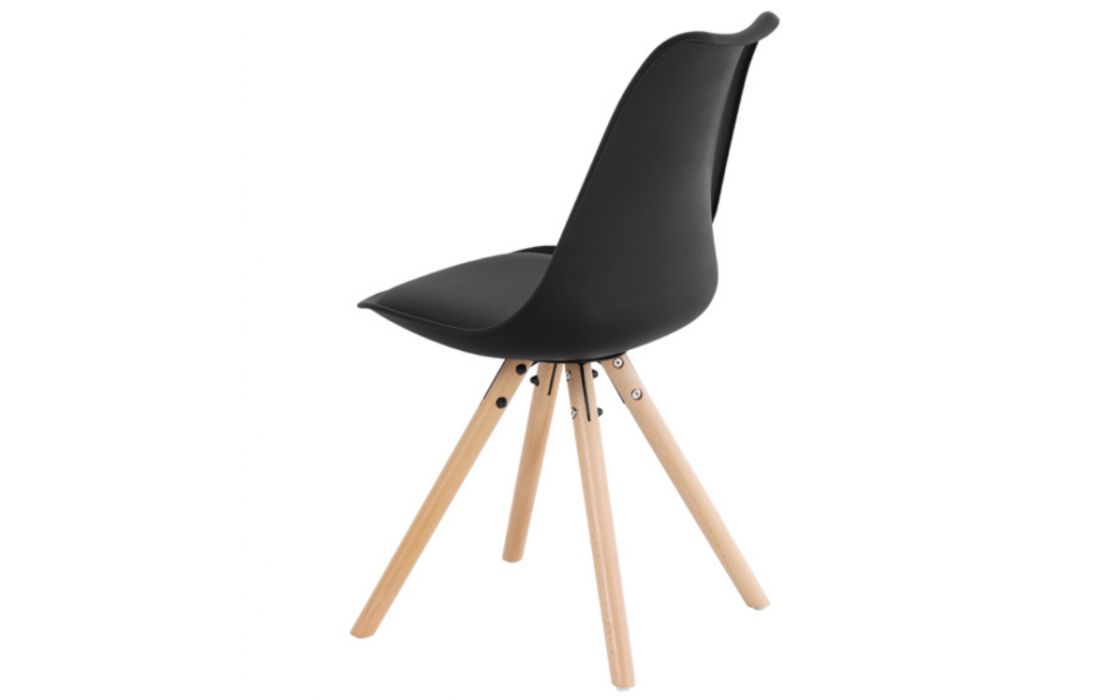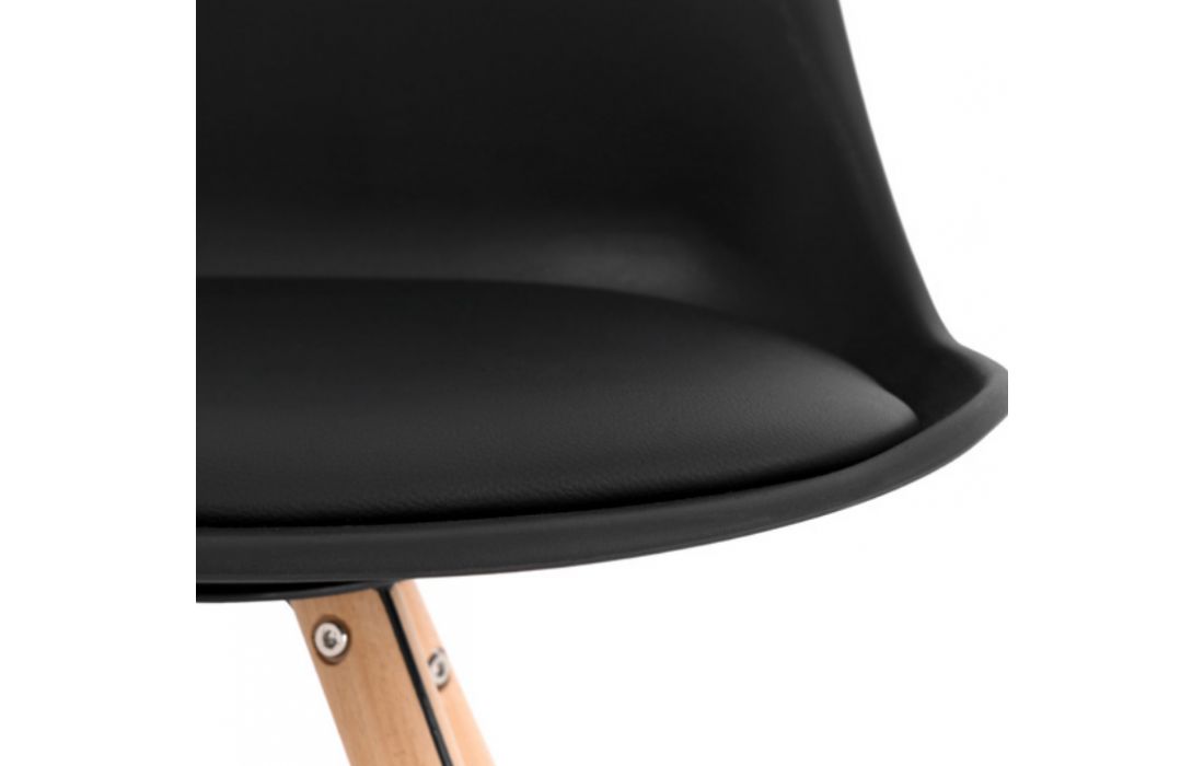 Cadeira com pés de madeira e estrutura em polipropileno com assento acolchoado em PU.