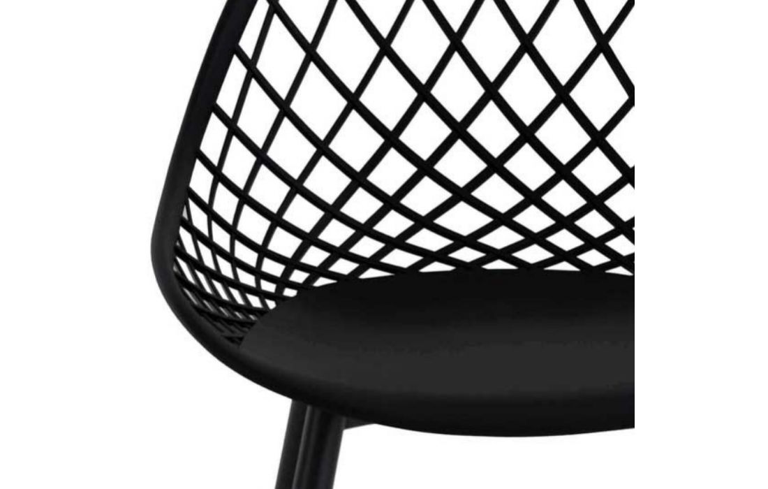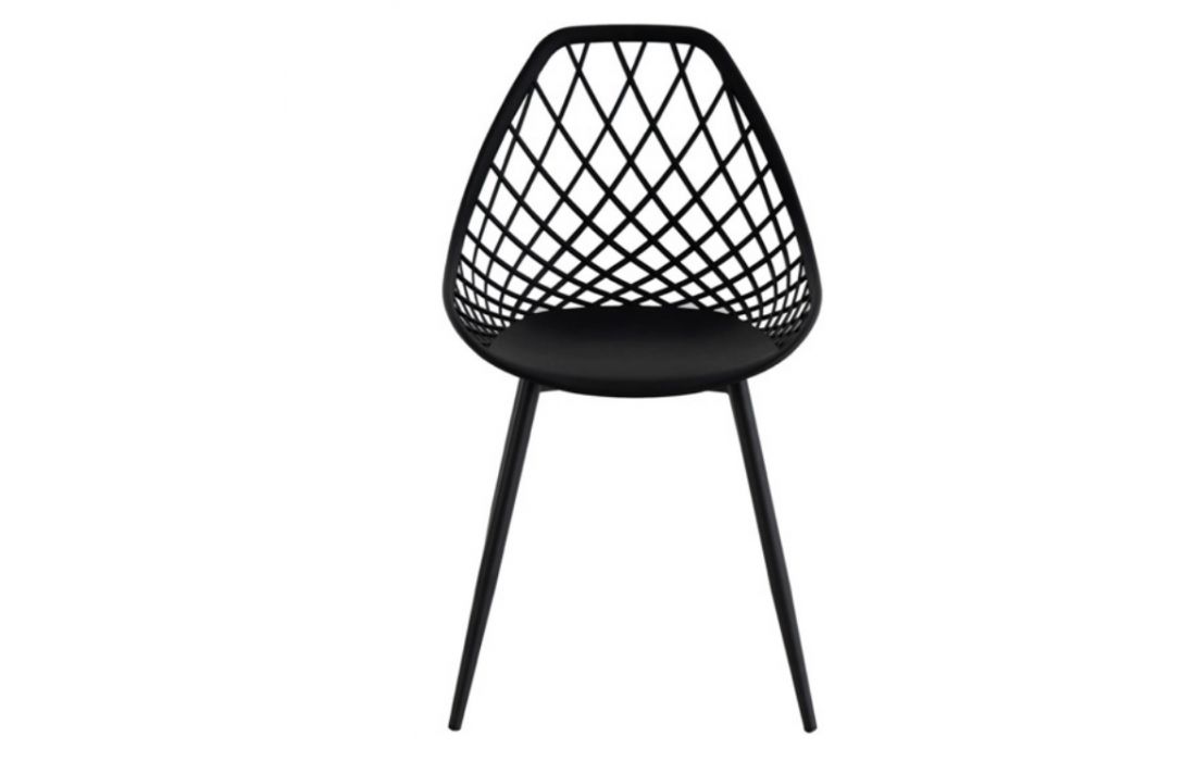 Cadeira de estilo moderno com assento em polipropileno e pés em metal.