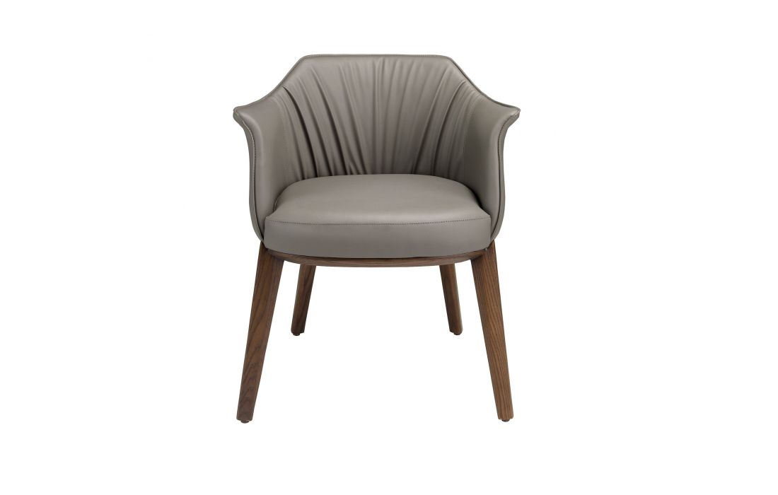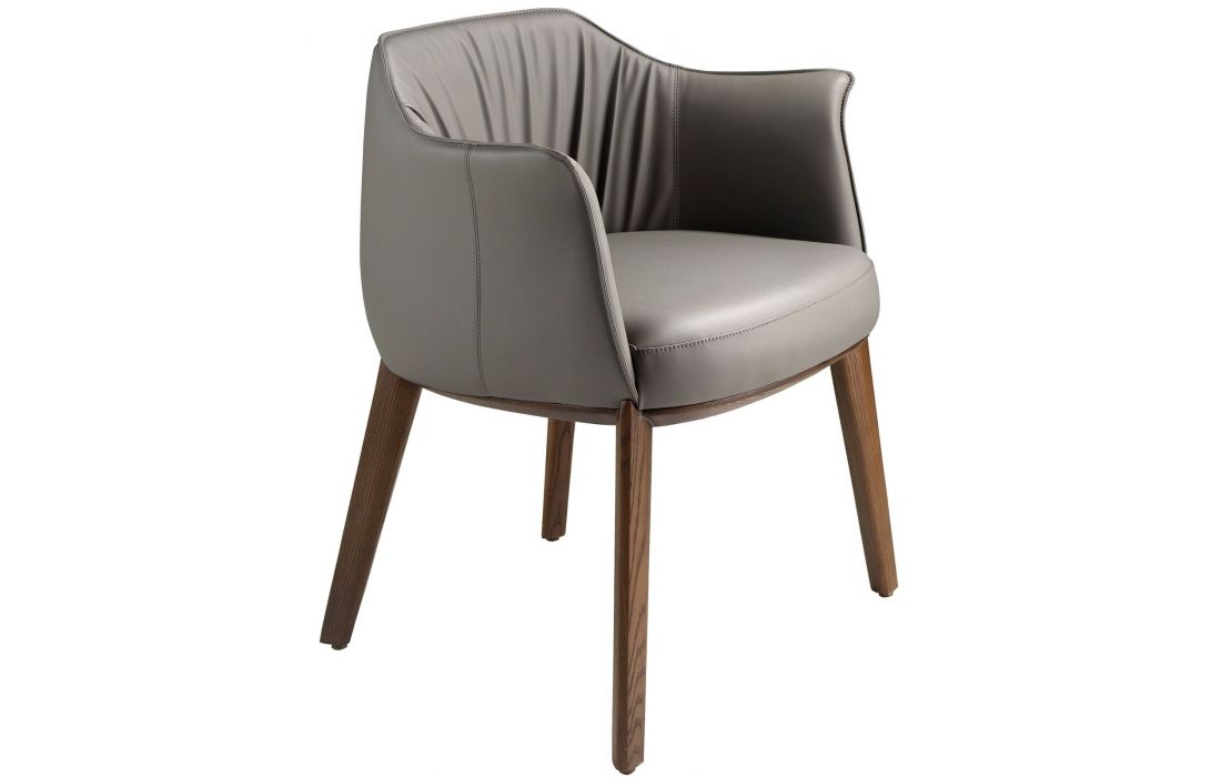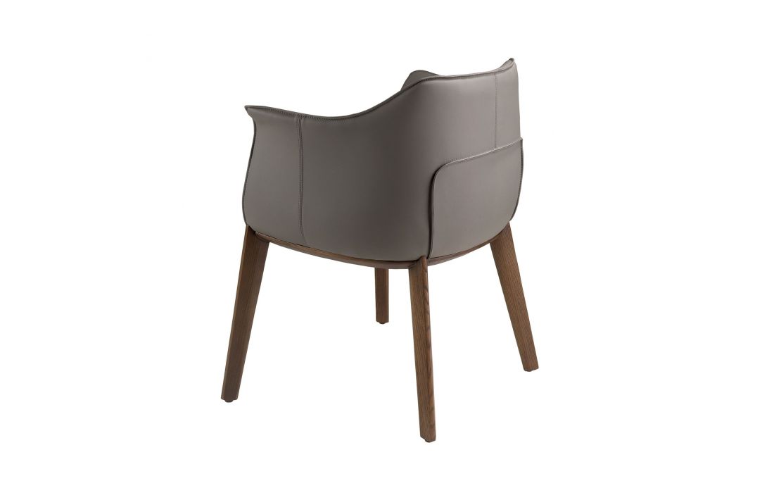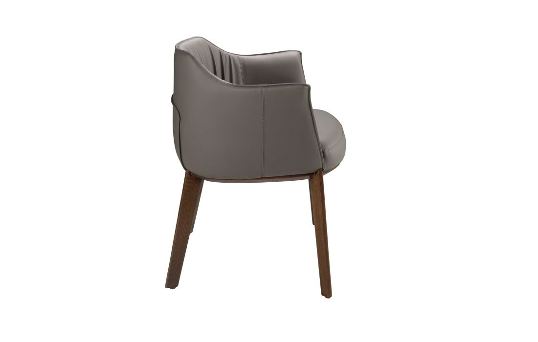 Cadeira de design moderno com braços, assento e encosto estofados em pele sintética e as suas pernas de madeira na cor nogueira, com o seu estilo vanguardista e intemporalDestinatário :