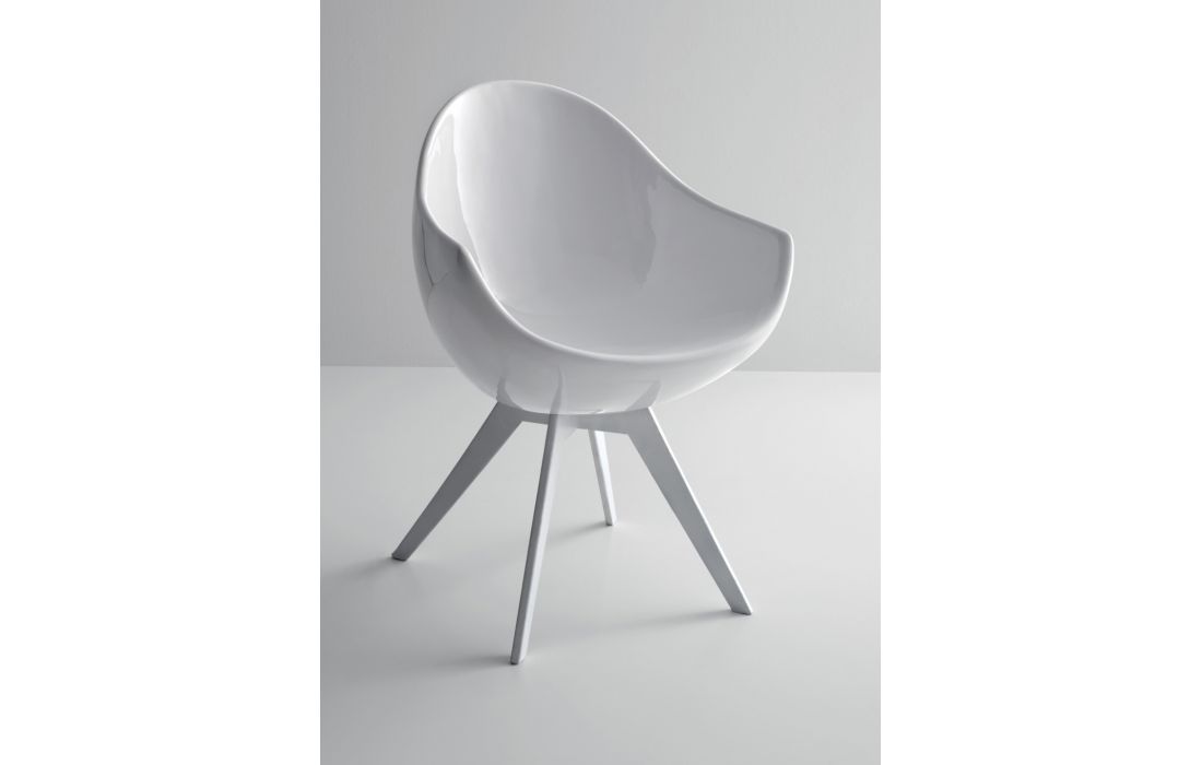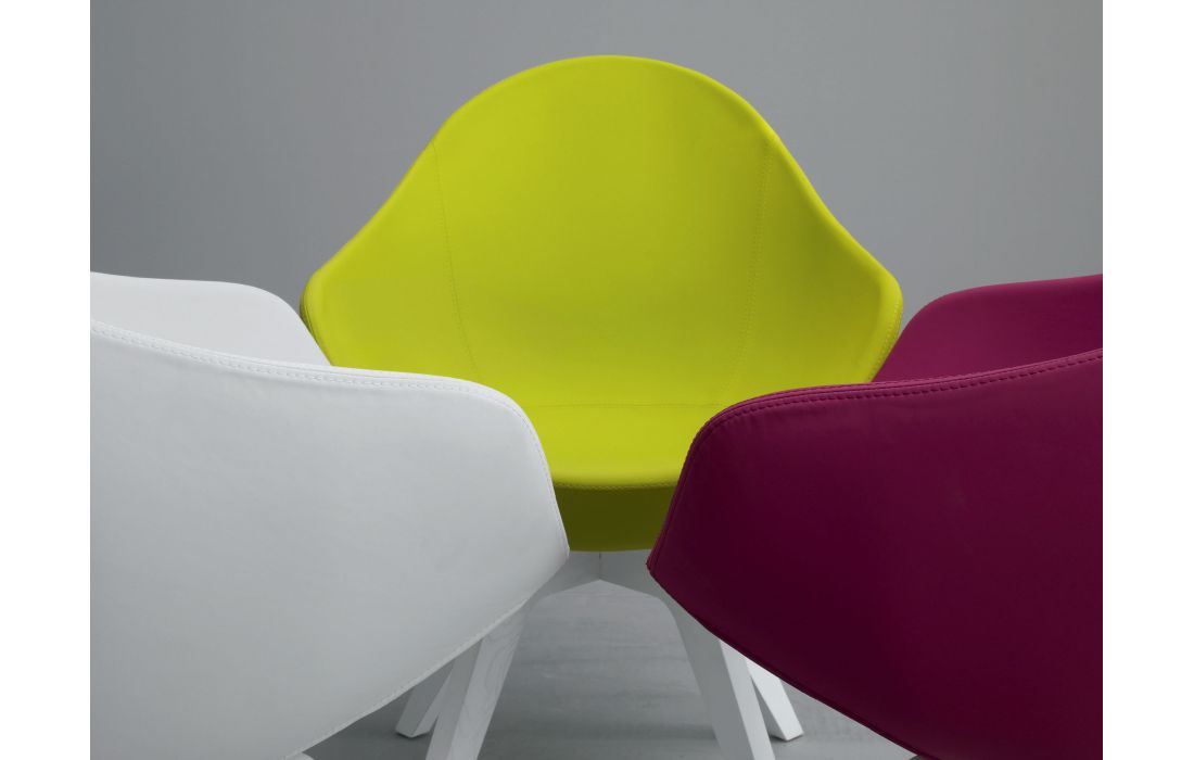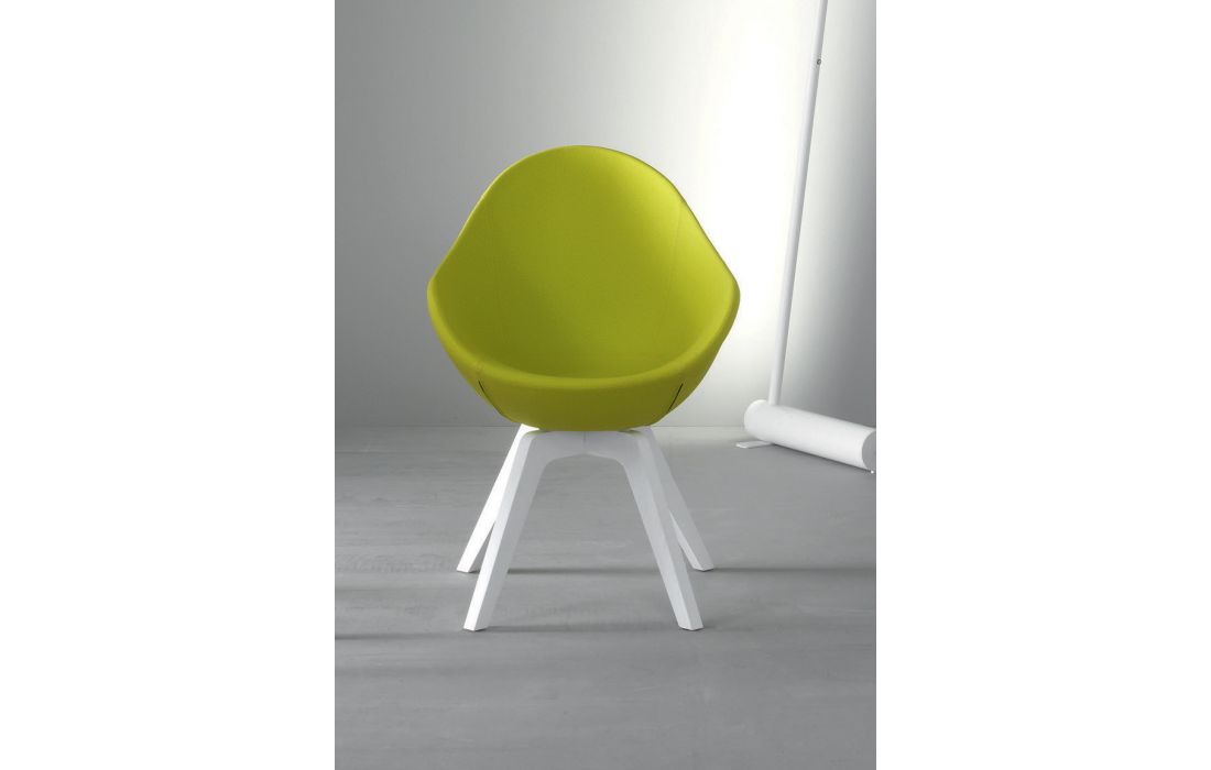 Cadeirão com assento em poliuretano revestido em tecido ou pele sintética com pés em nogueira ou lacado branco