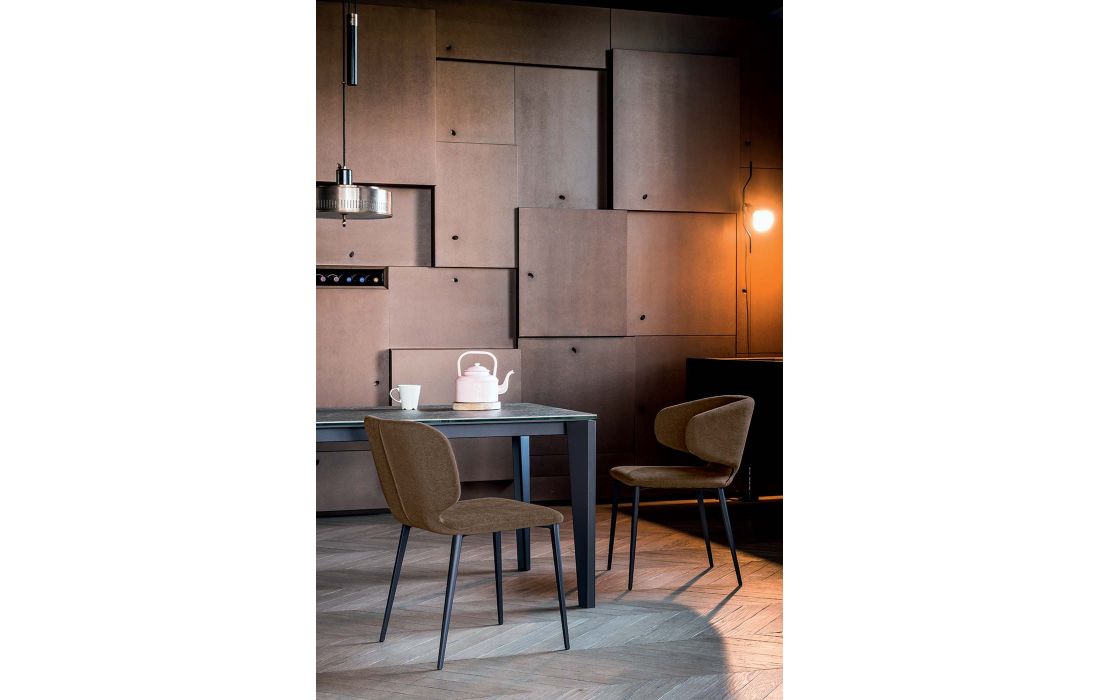 Cadeira com estofo em veludo com 2 cores disponiveis, castanho e bege e com pés em aço de cor preto.Dimensões em cmL 53 P 58 A 73Prazo de Entrega05 a 15 dias