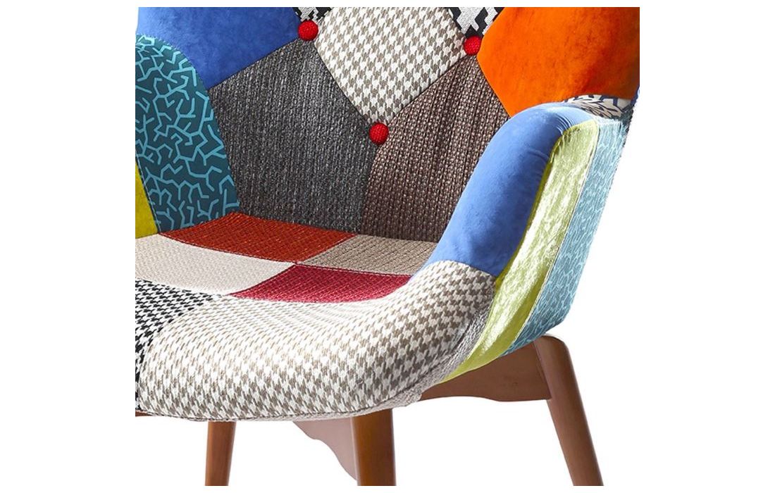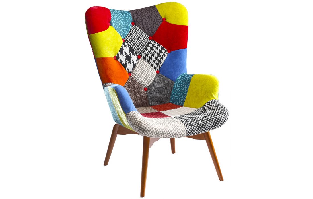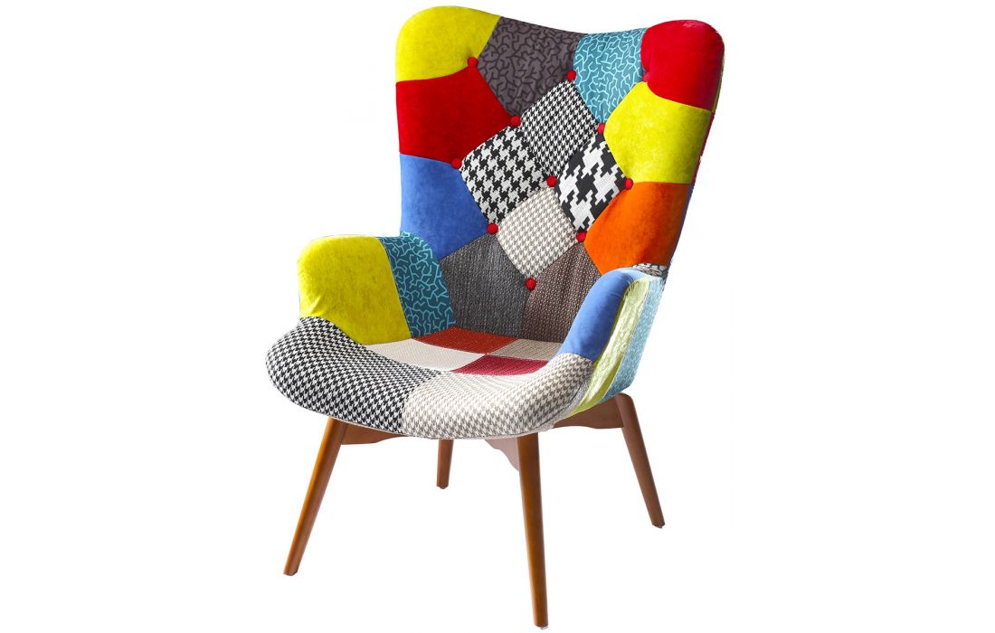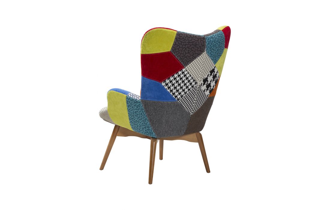 Poltrona com estofo em tecido multicolour com pés em madeira maciça de freixo