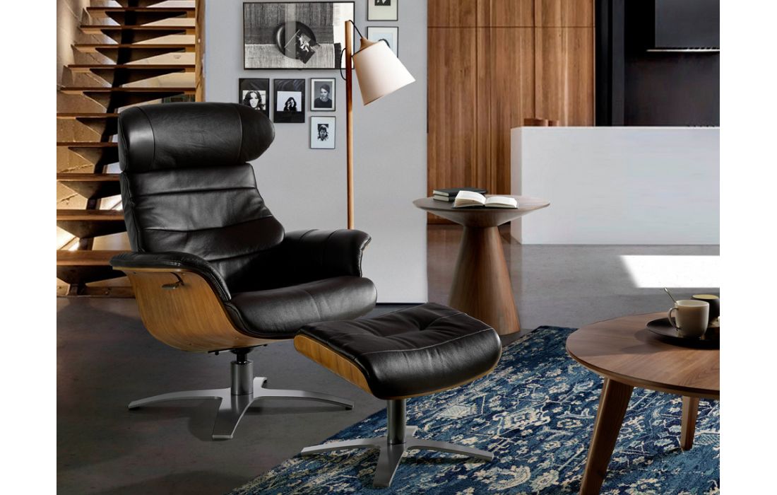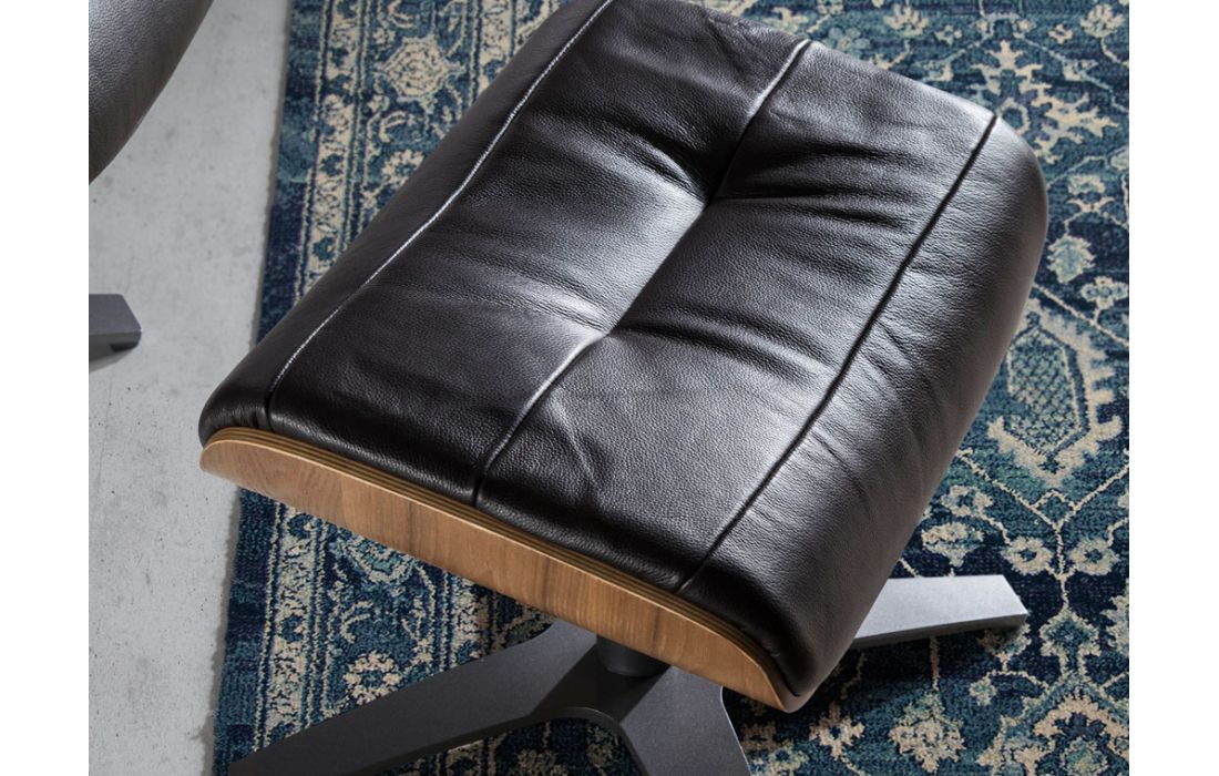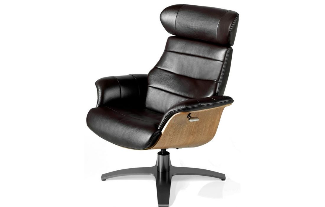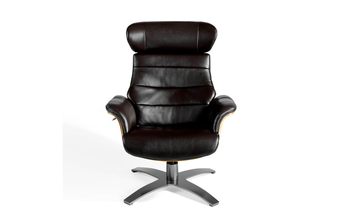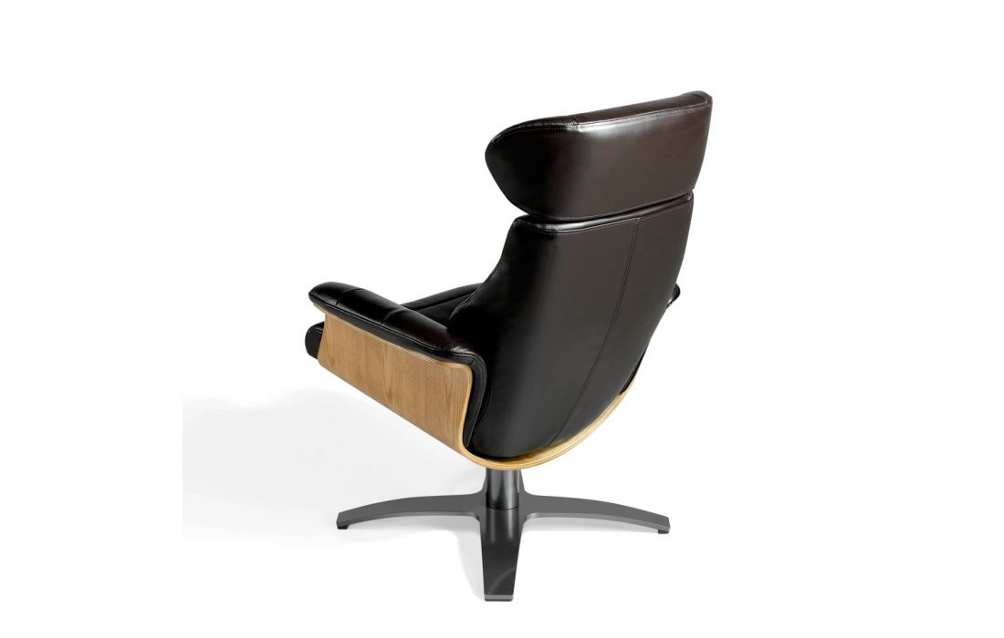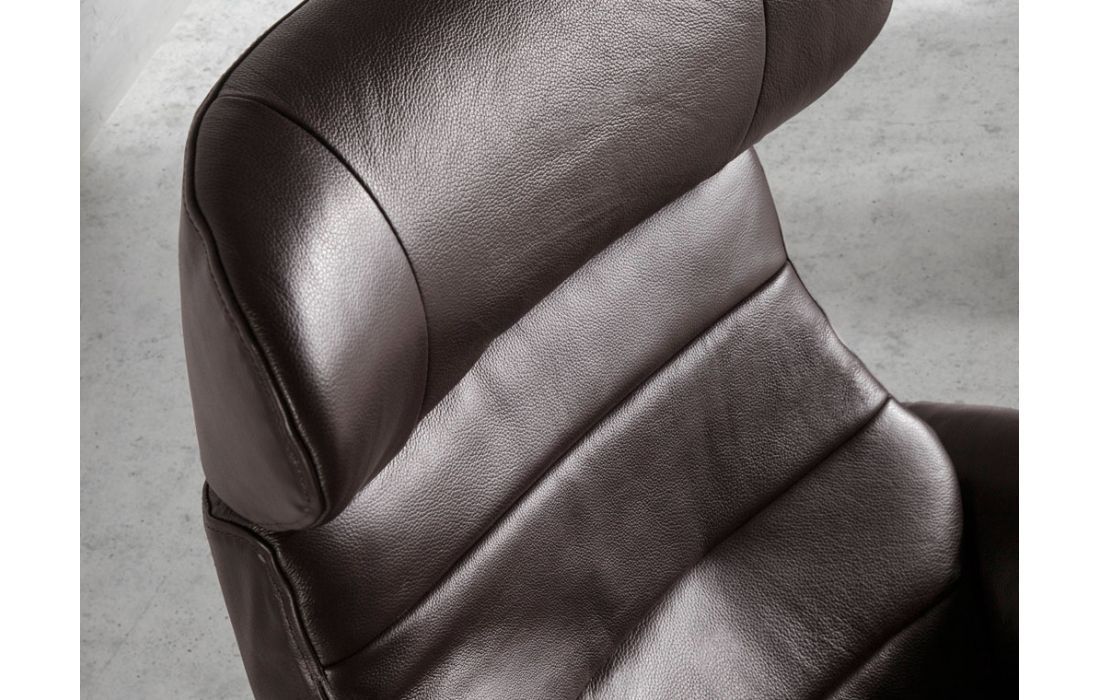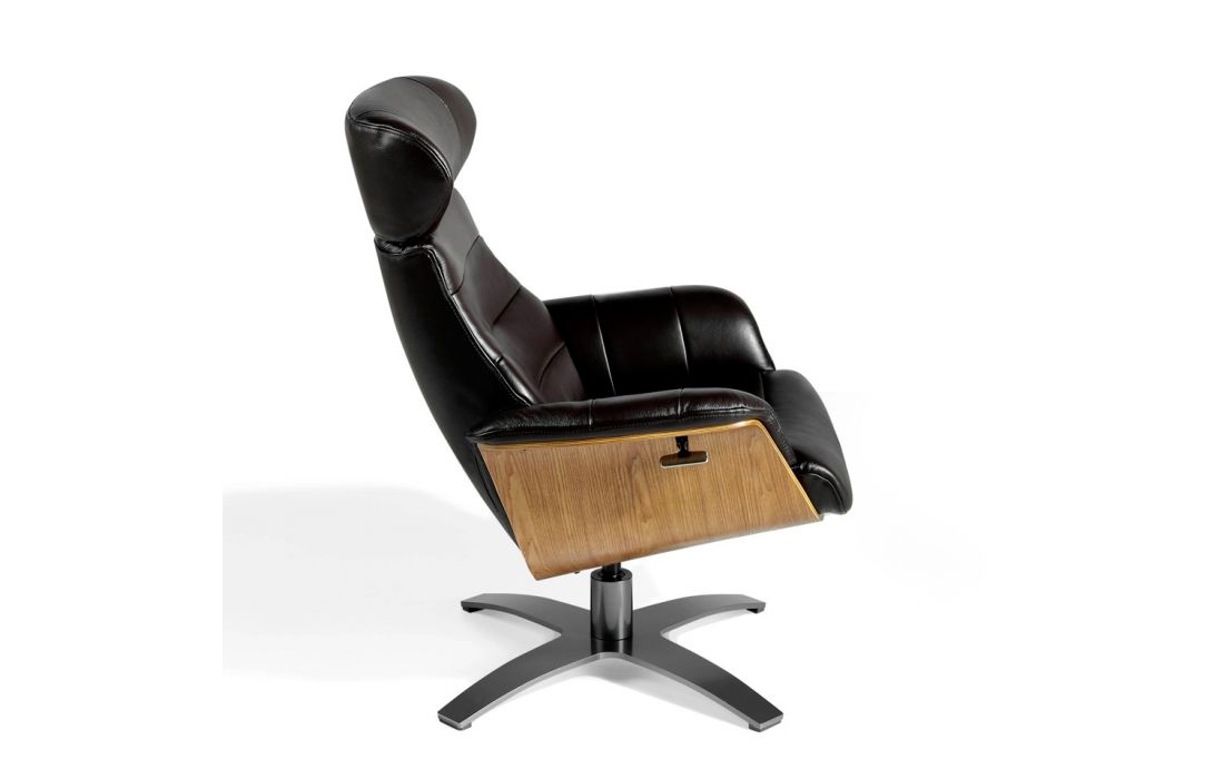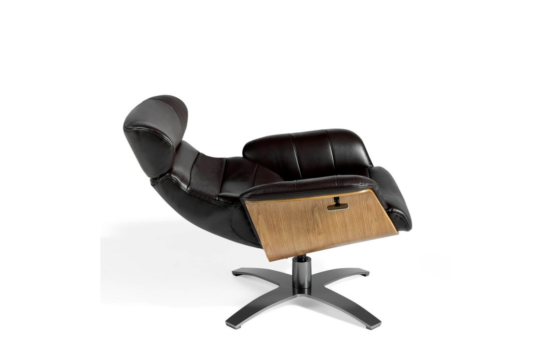 Poltrona giratória estofada nos vários revestimentos, com estrutura em nogueira e pés em aço inoxidável polido. Mecanismo de encosto dobrável.