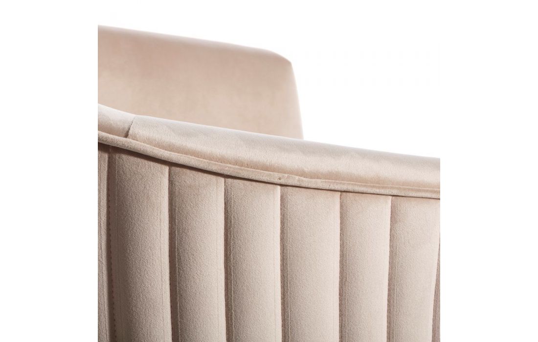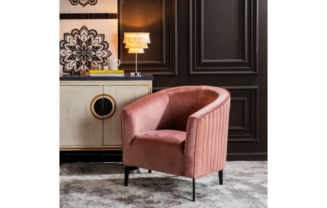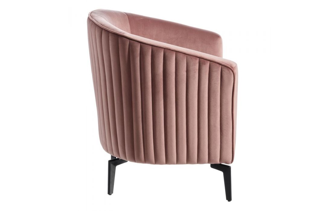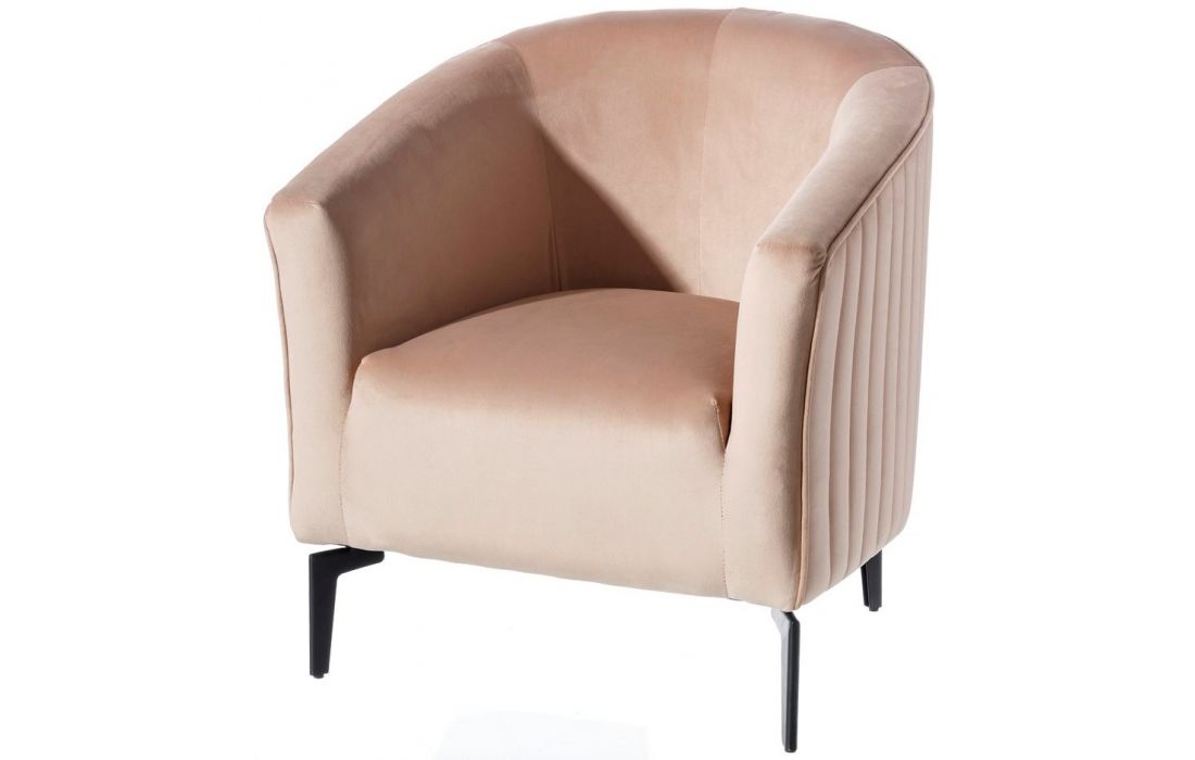 Poltrona estofada em tecido de cor beige, rosa ou verde escuro, com pernas em metal de 19cm altura