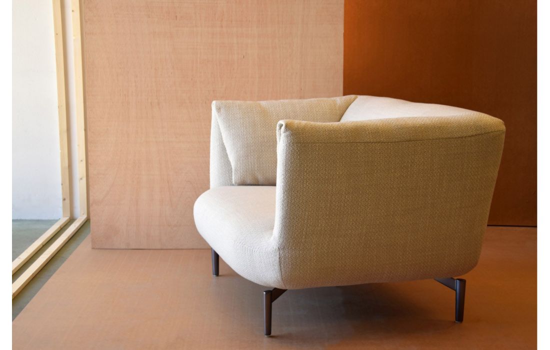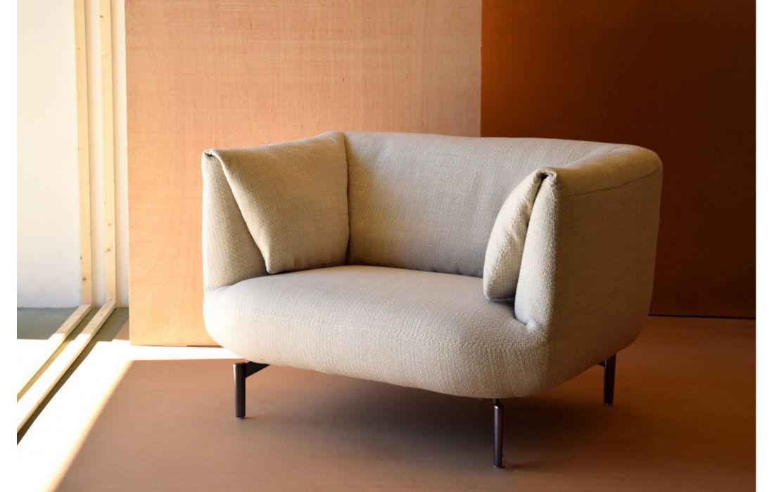 Poltrona com pés em metal de cor preta, estofada nos vários revestimentos possiveis.