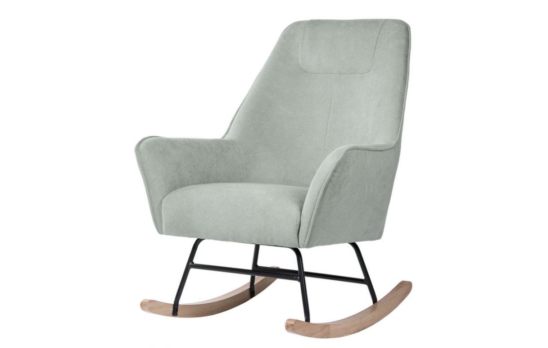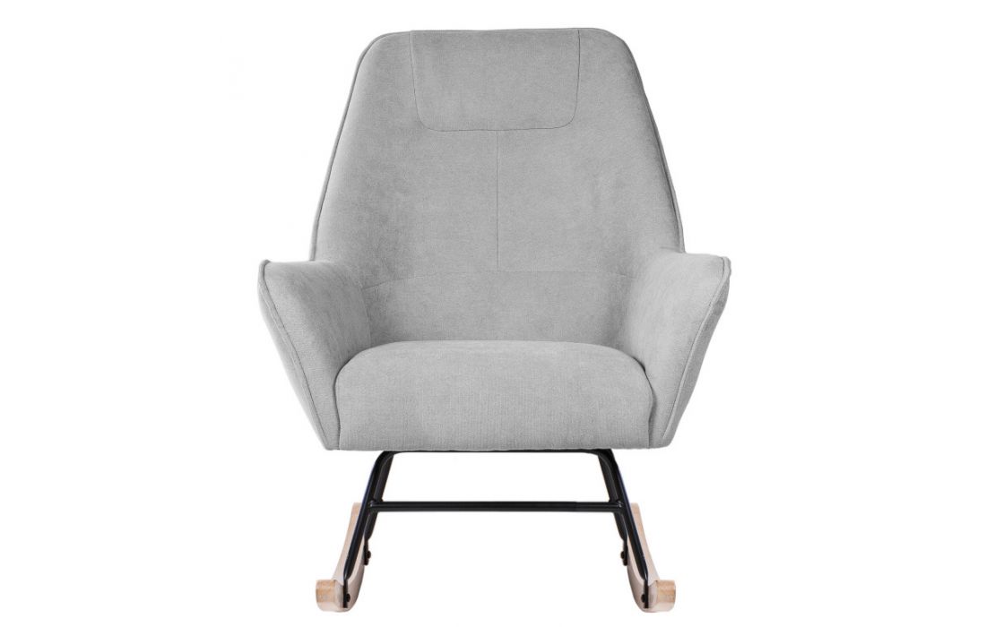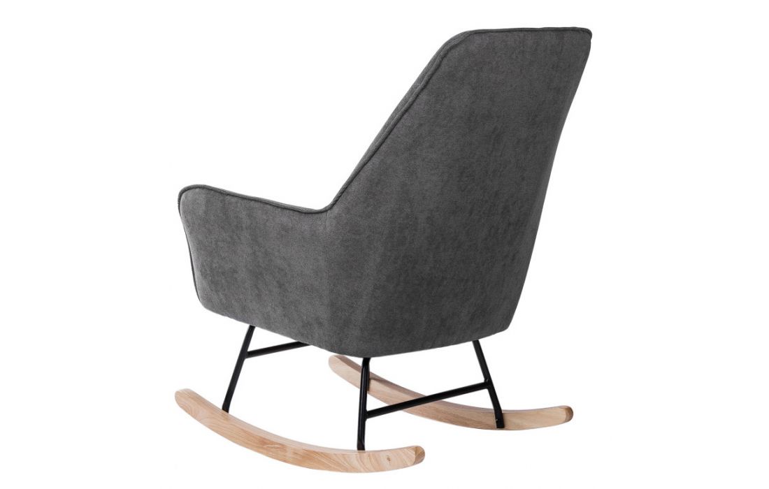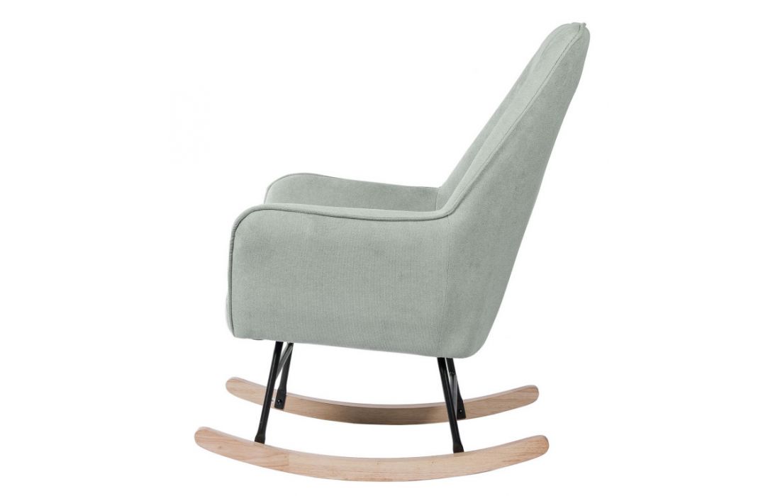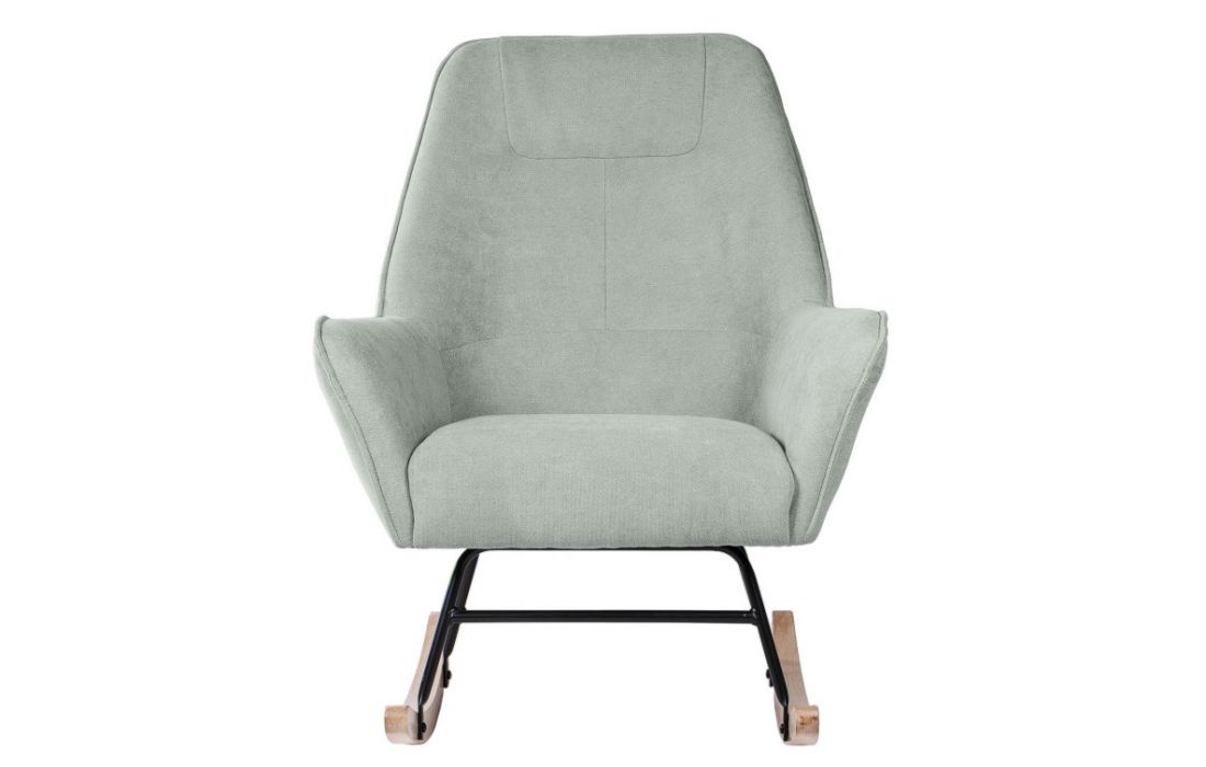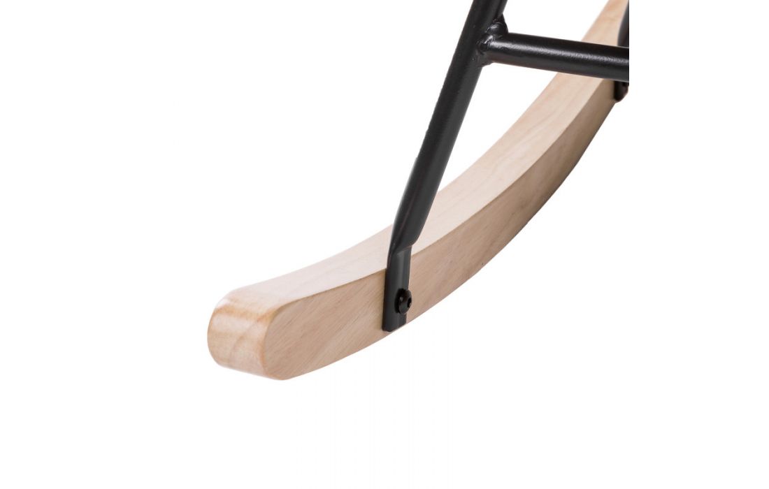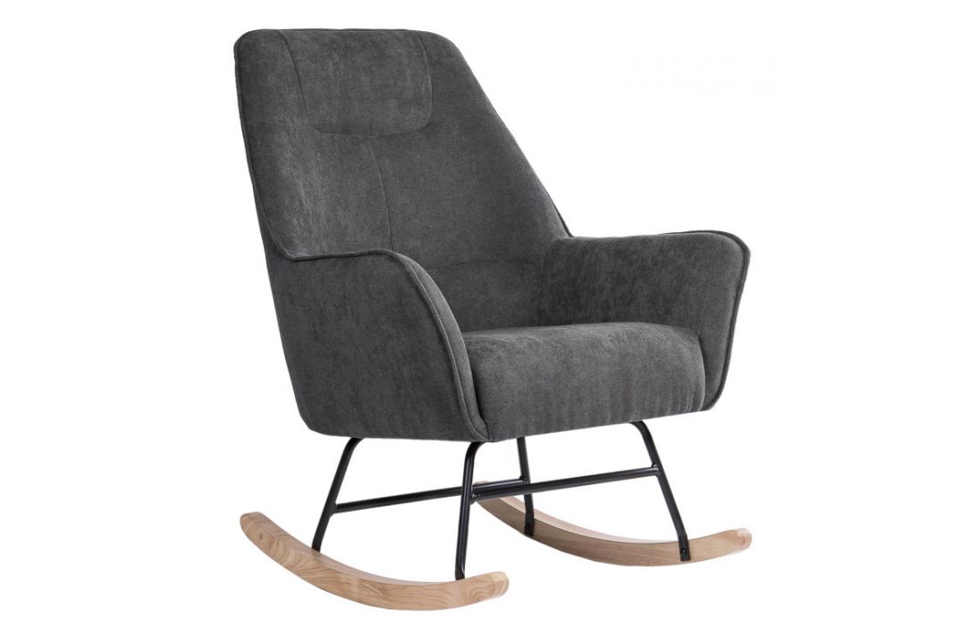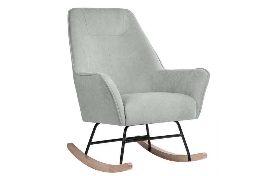 Cadeirão de baloiço com pés em aço preto e trenó de madeira com acabamento natural, estofo em tecido cinza claro, cinza escuro, mostarda e menta