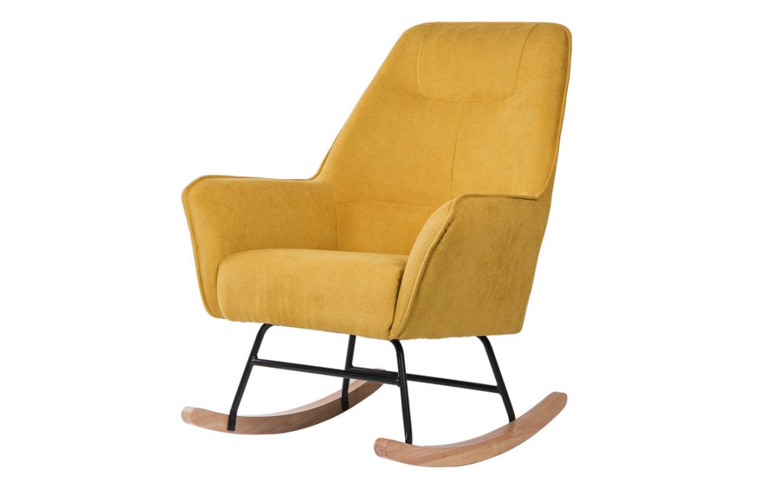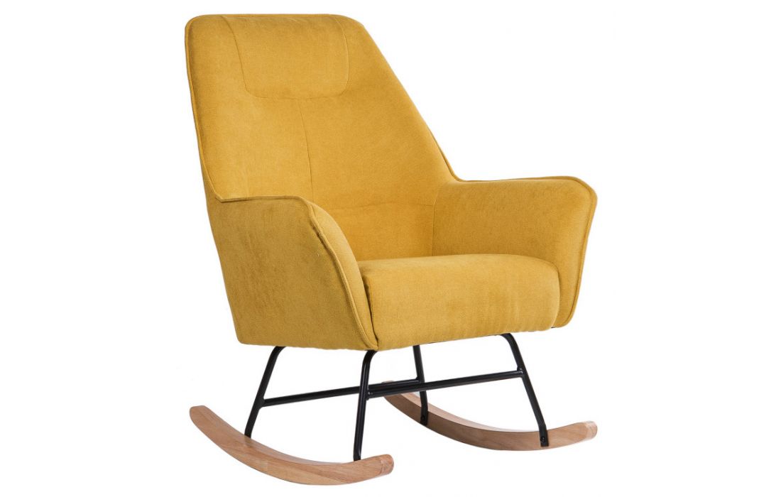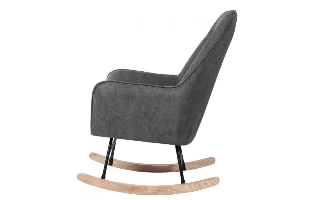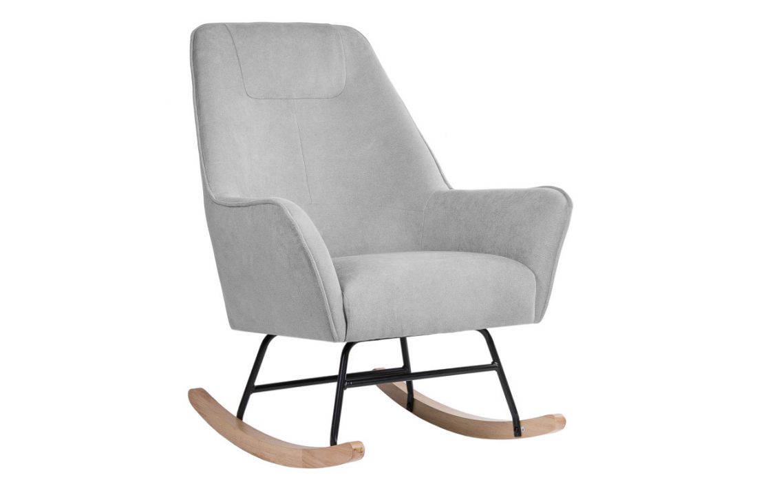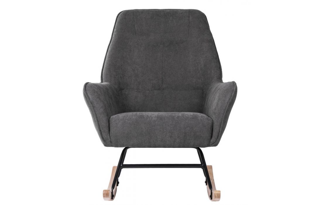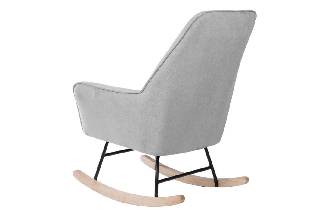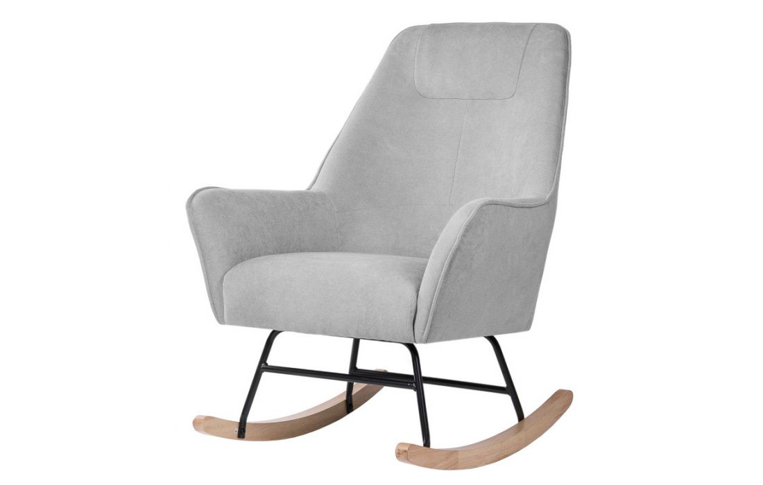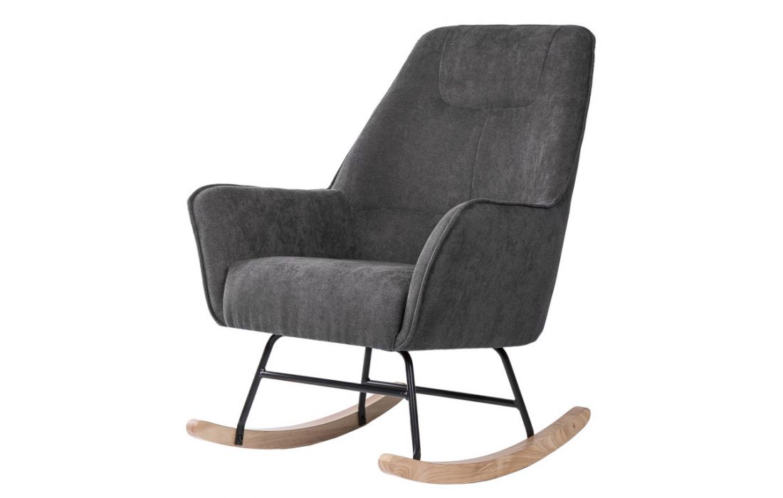 Cadeirão de baloiço com pés em aço preto e trenó de madeira com acabamento natural, estofo em tecido cinza claro, cinza escuro, mostarda e menta
