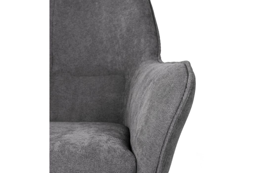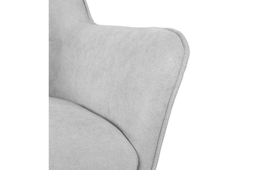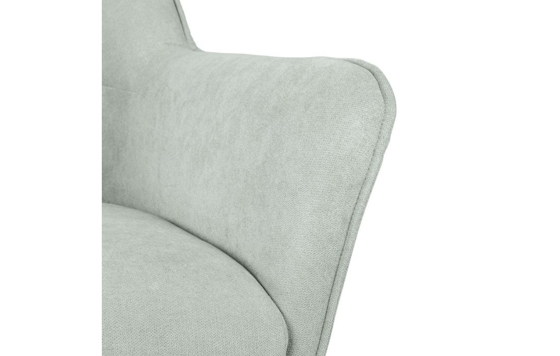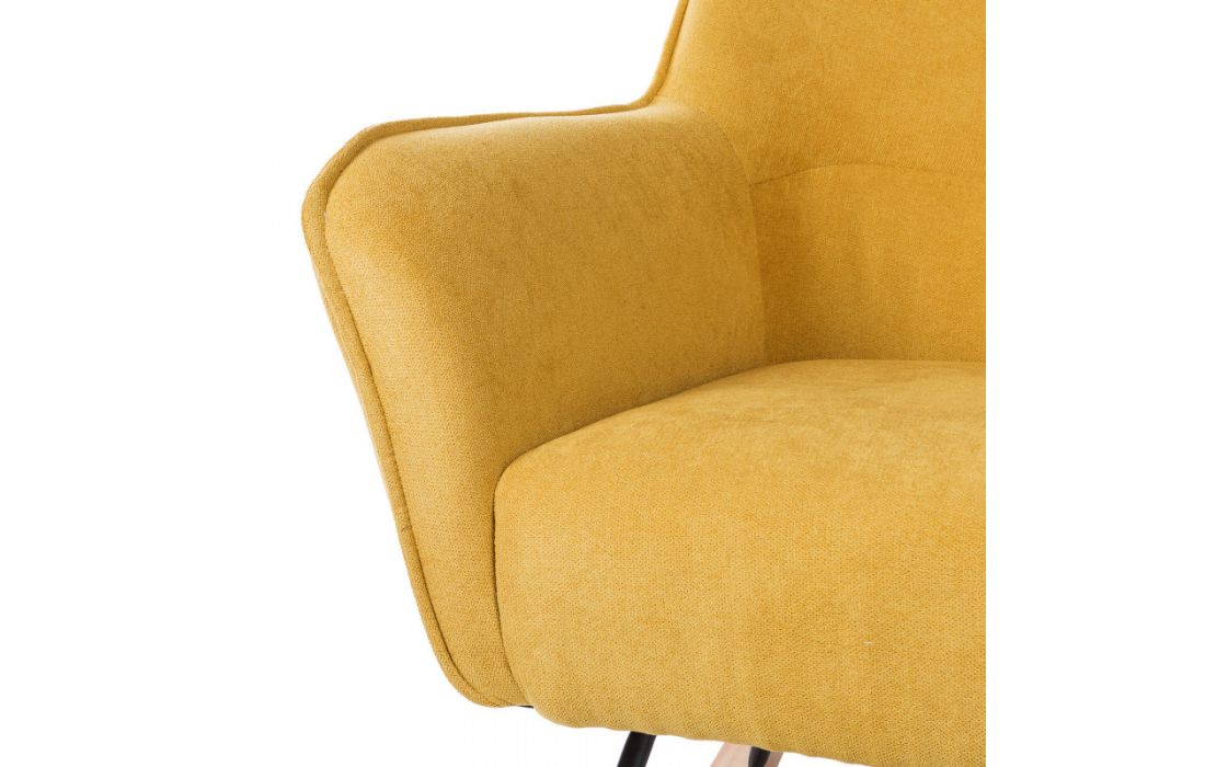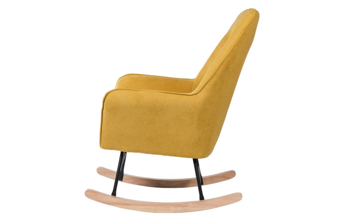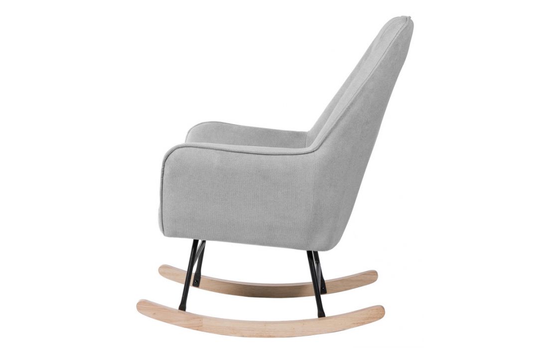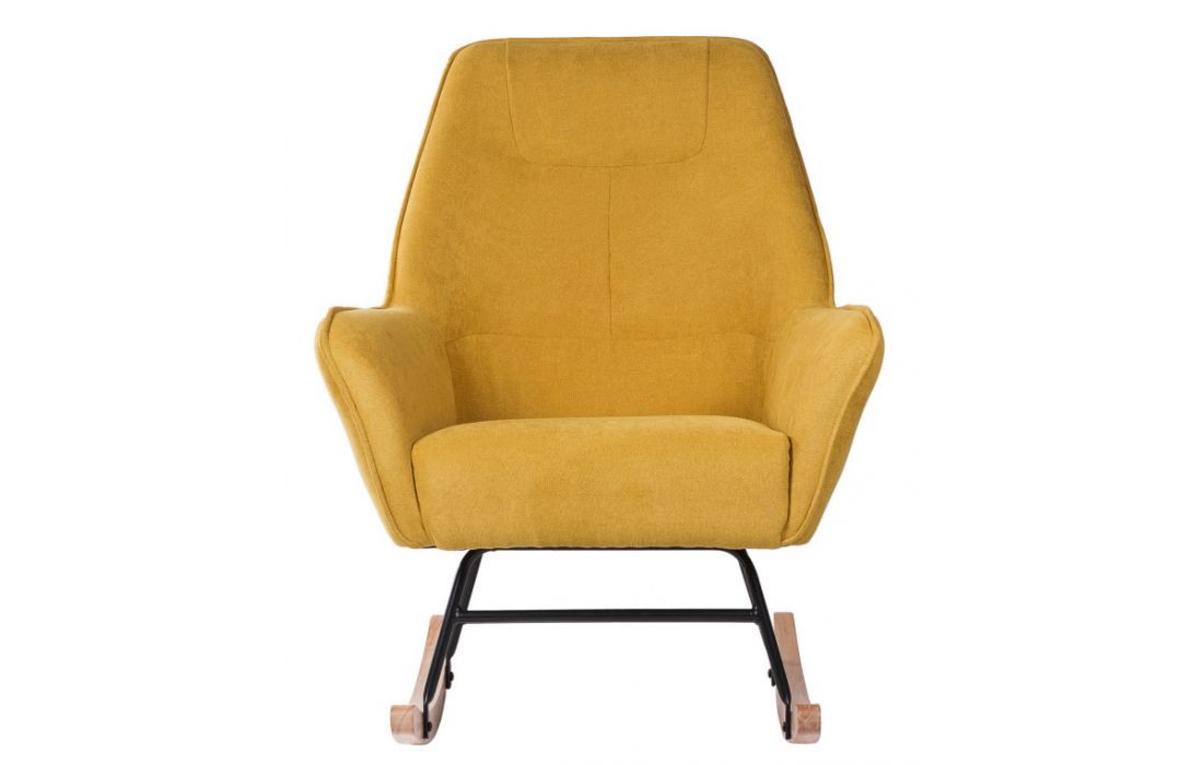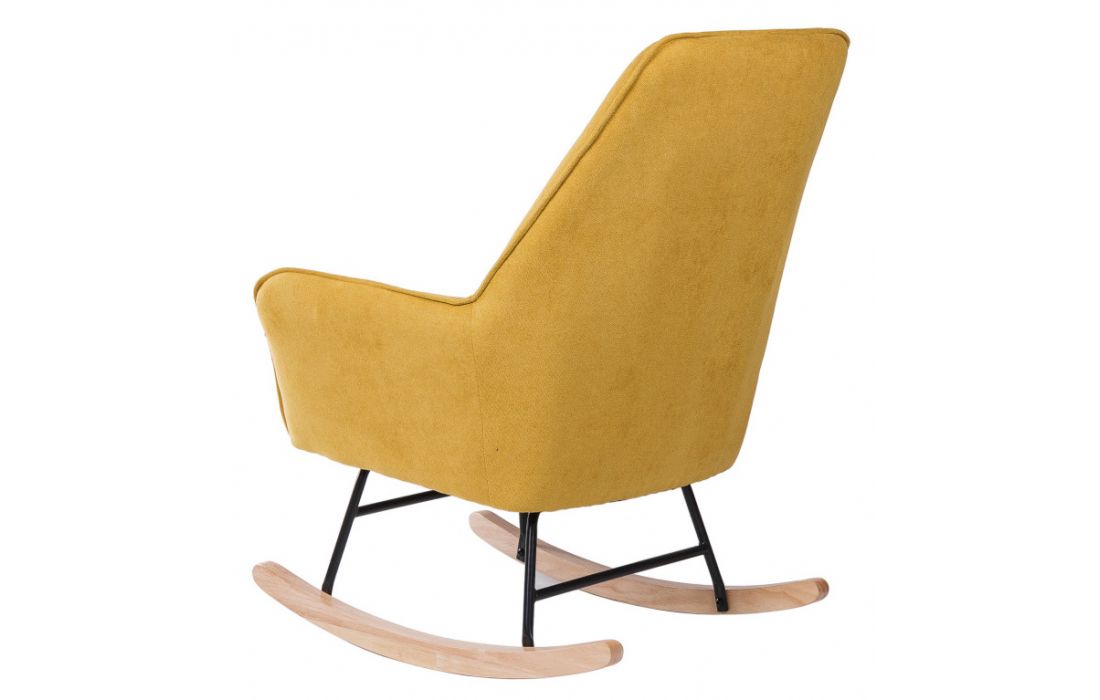 Cadeirão de baloiço com pés em aço preto e trenó de madeira com acabamento natural, estofo em tecido cinza claro, cinza escuro, mostarda e menta