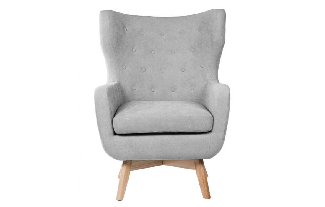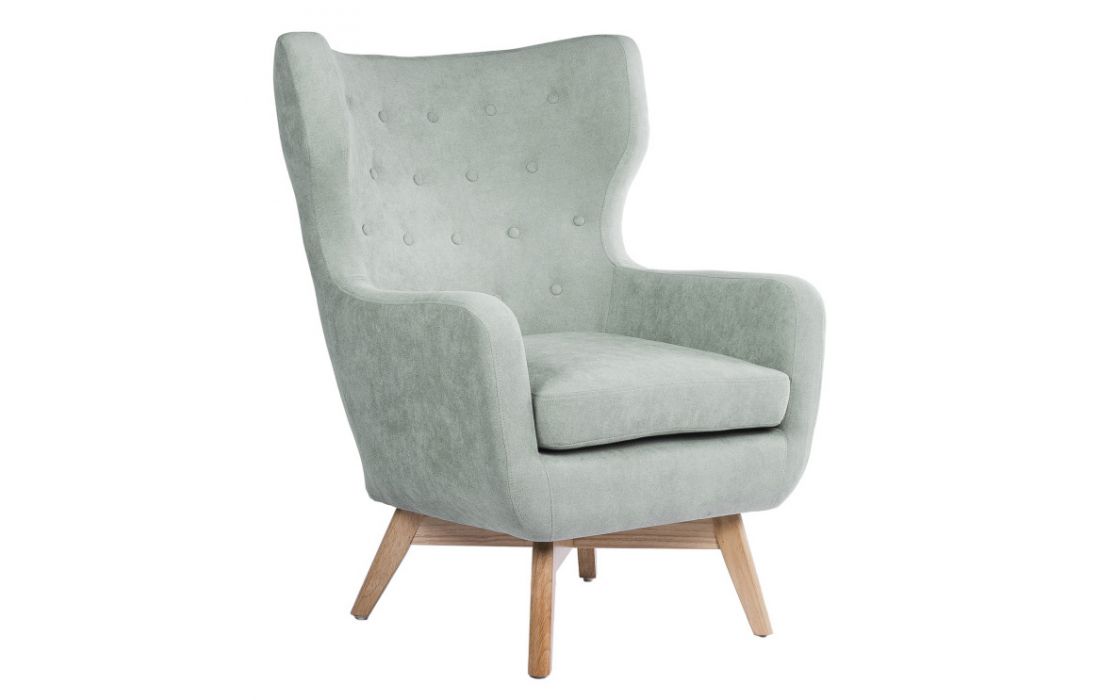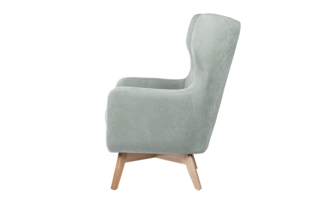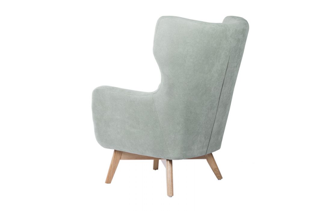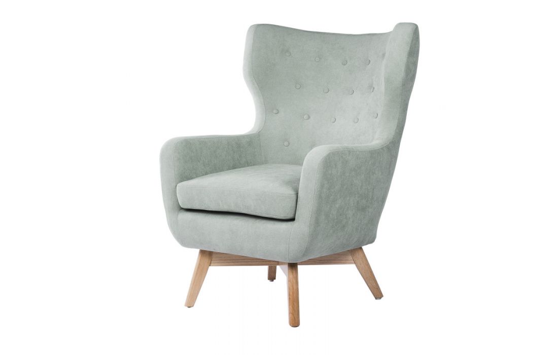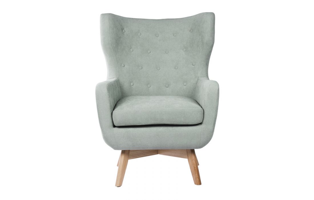Cadeirão com pés em madeira cor natural e estofo em tecido cinza claro, cinza escuro, mostarda e menta