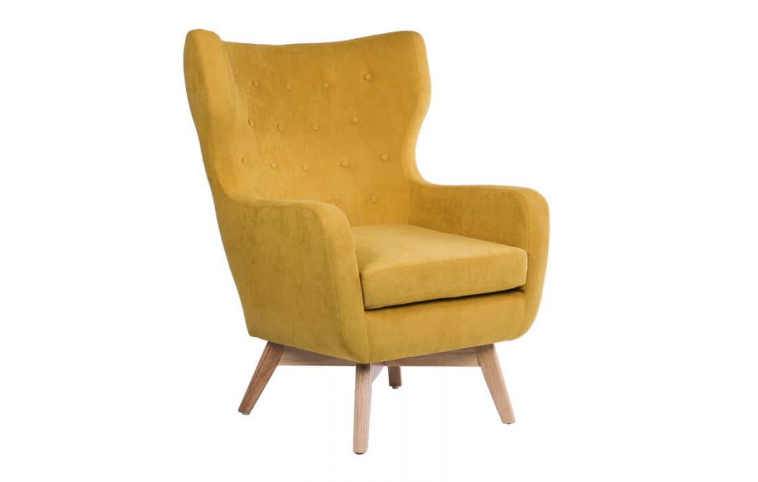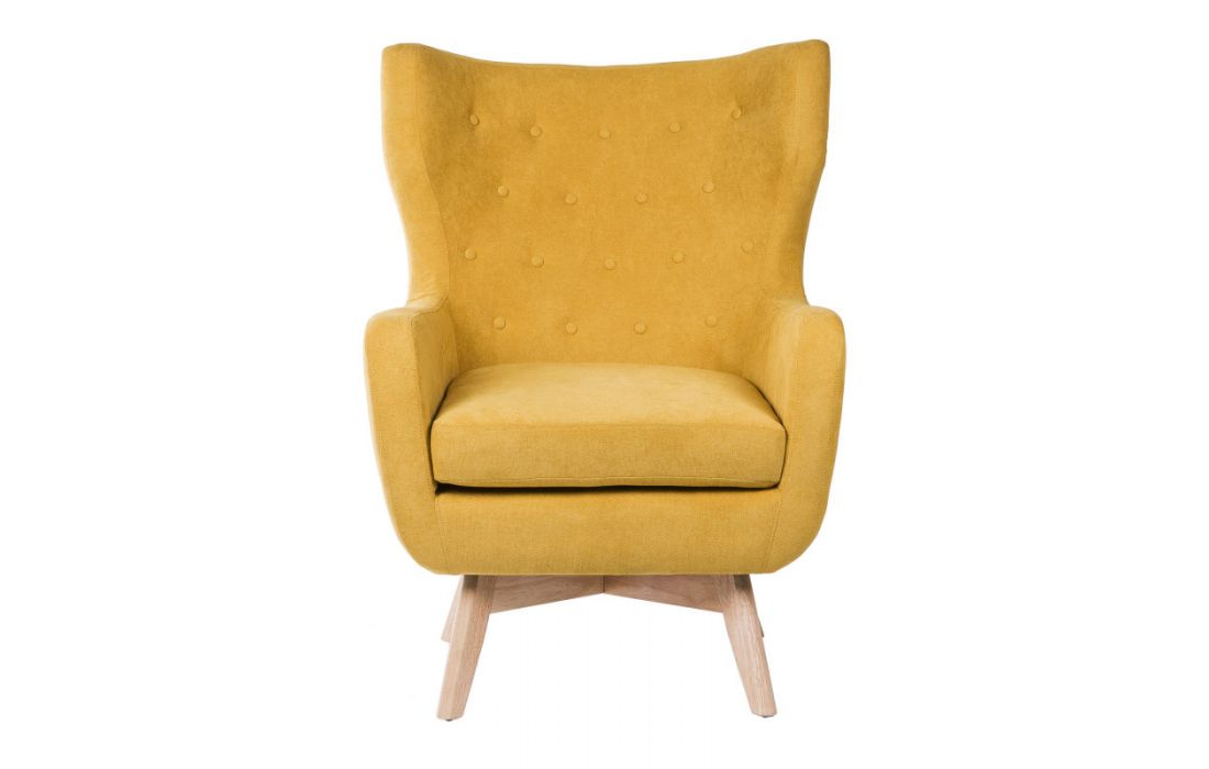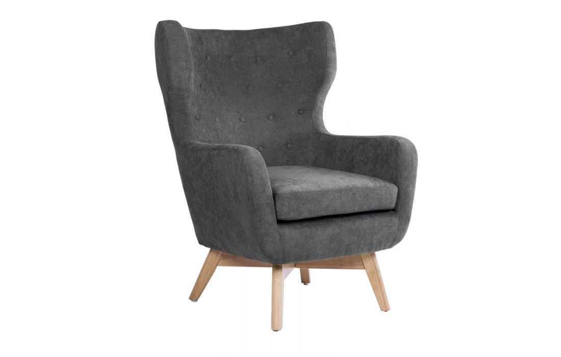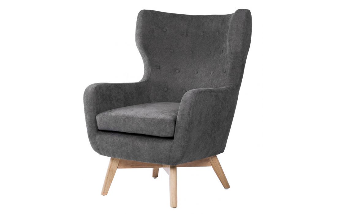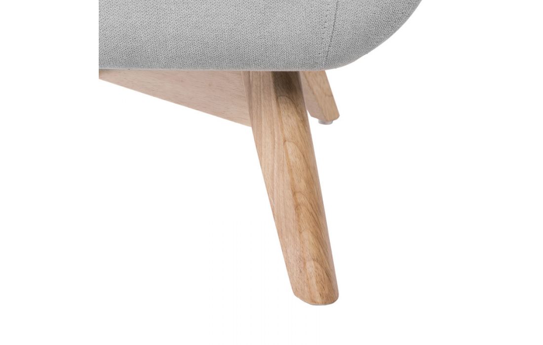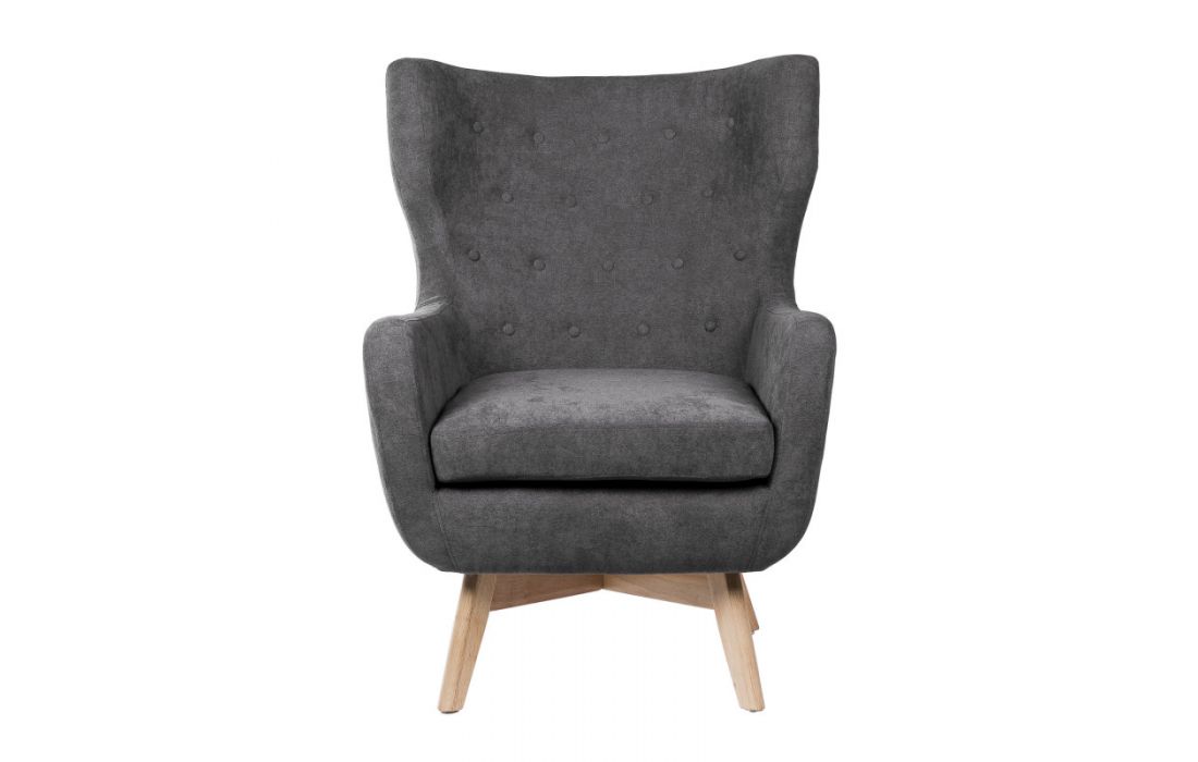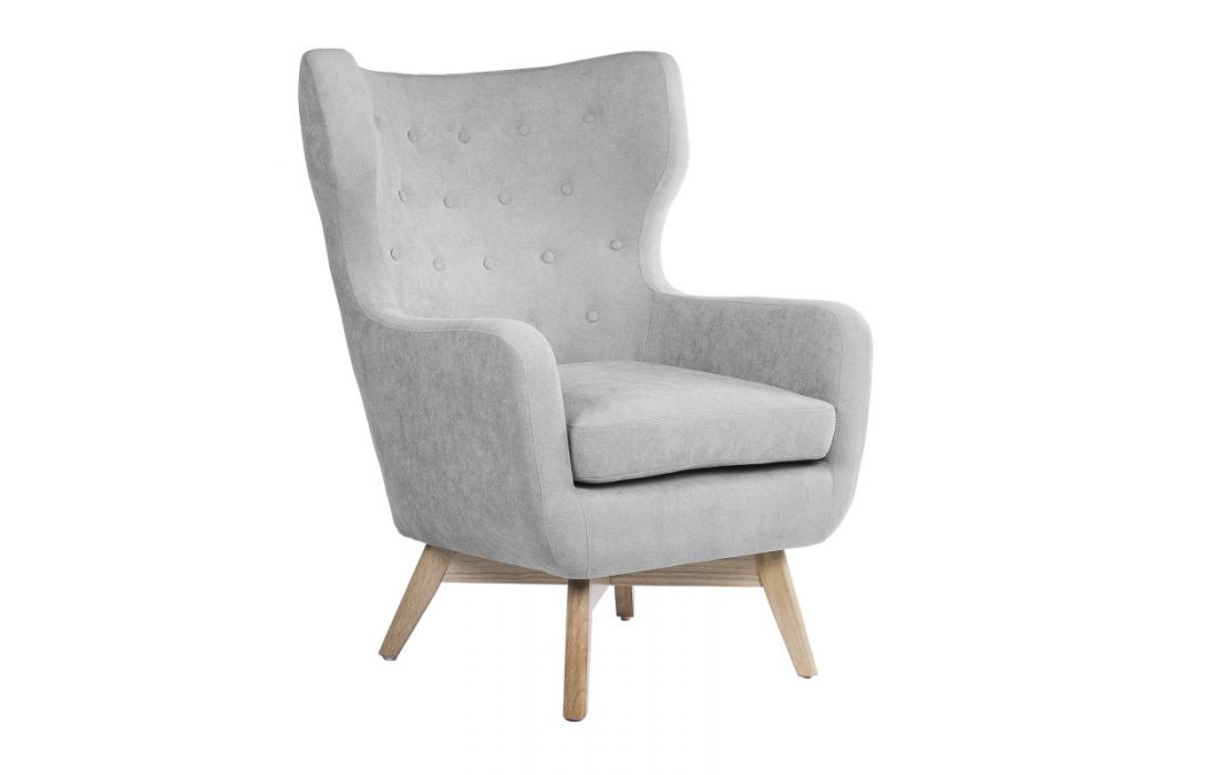 Cadeirão com pés em madeira cor natural e estofo em tecido cinza claro, cinza escuro, mostarda e menta