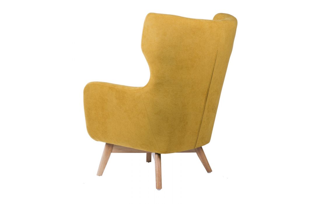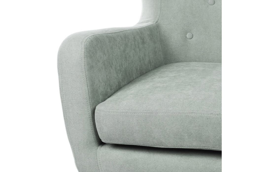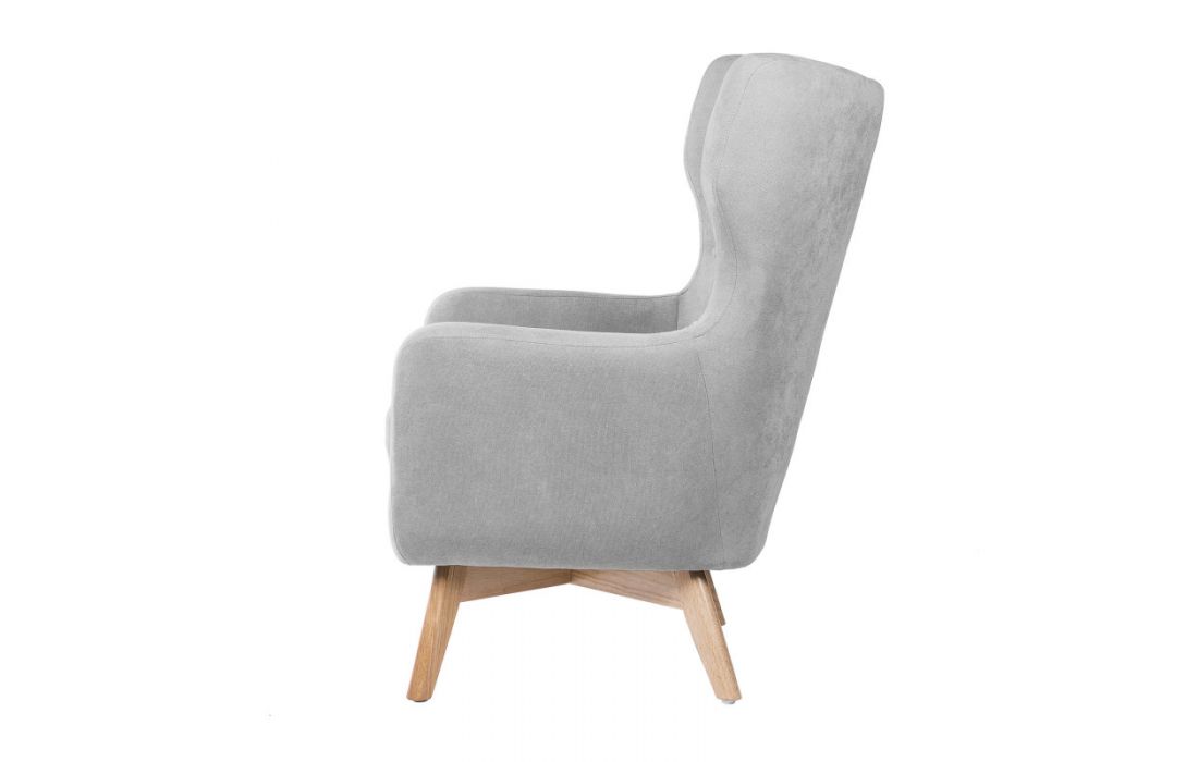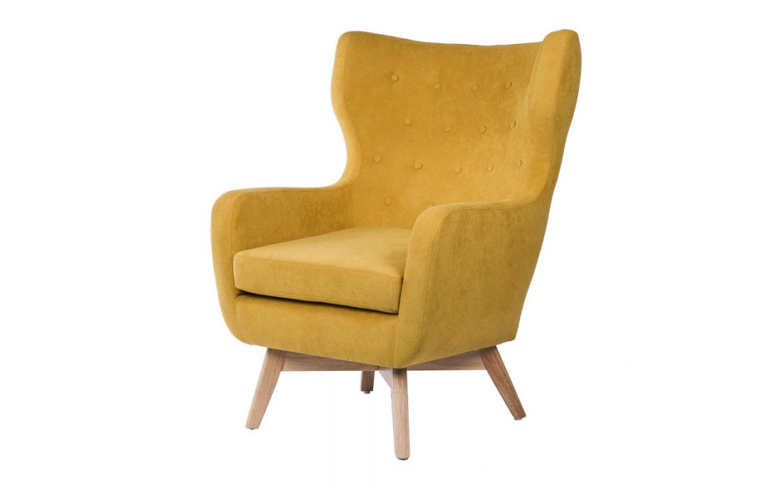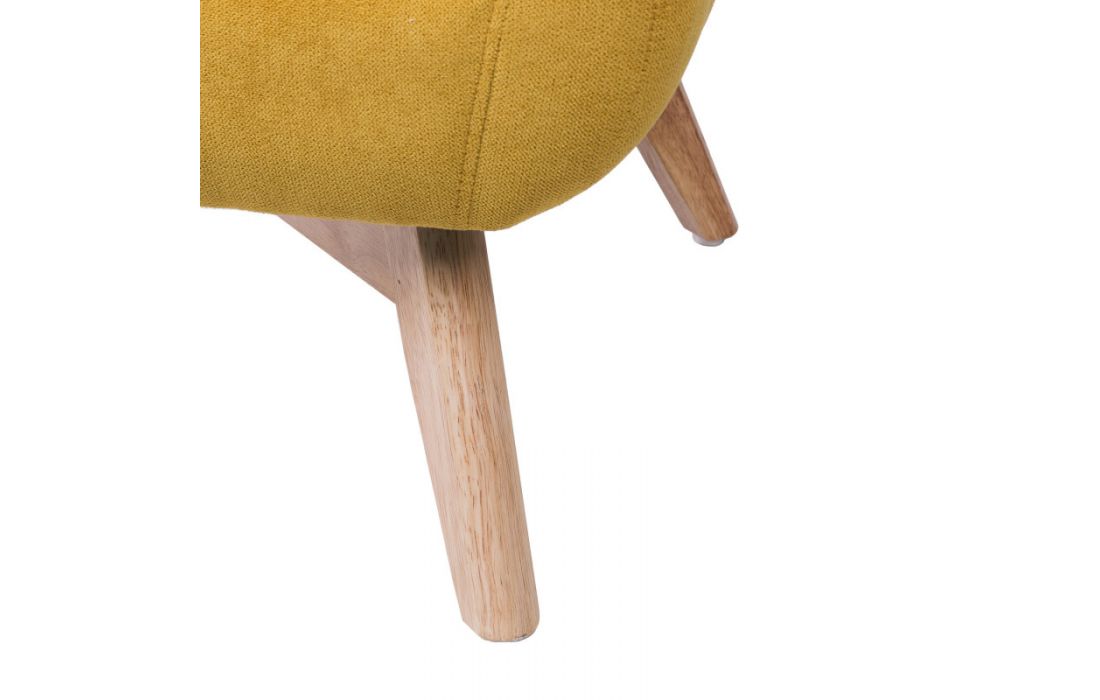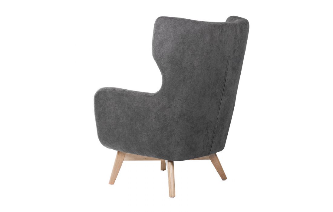 Cadeirão com pés em madeira cor natural e estofo em tecido cinza claro, cinza escuro, mostarda e menta
