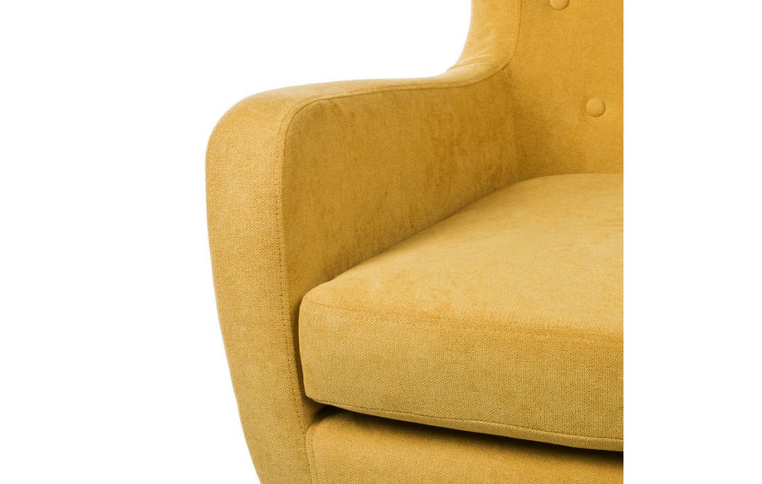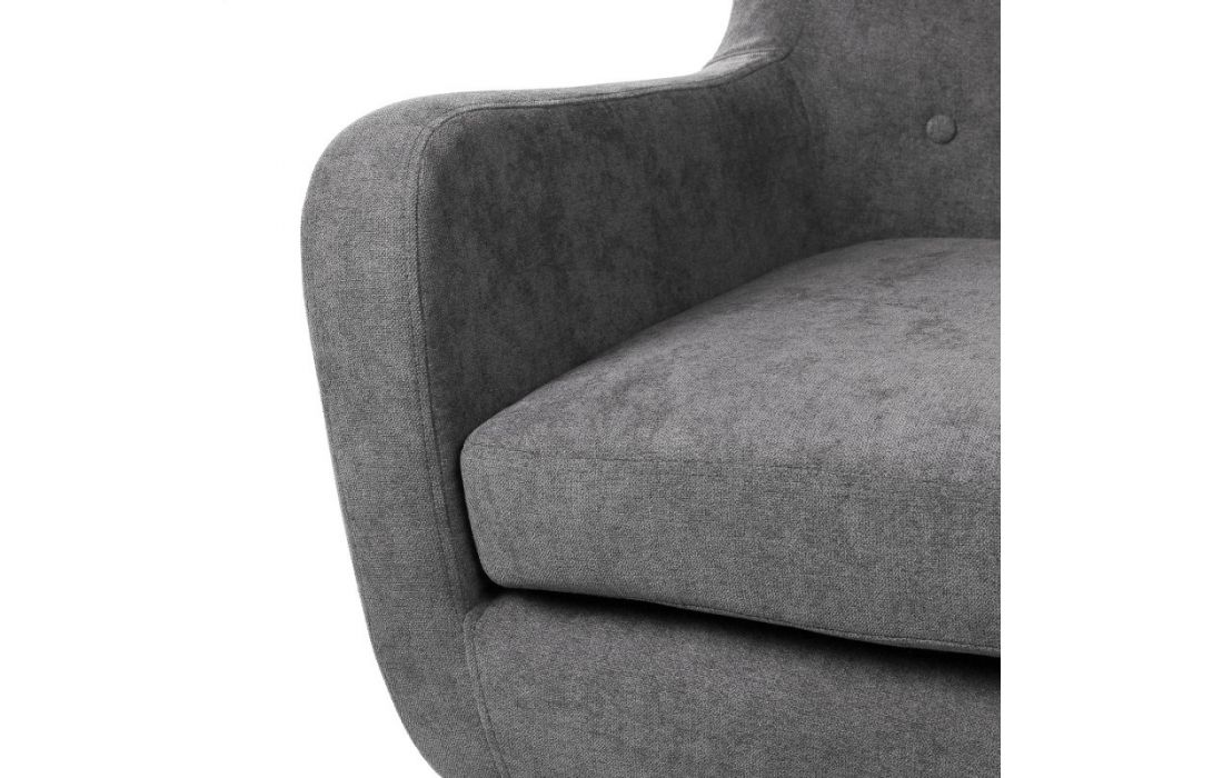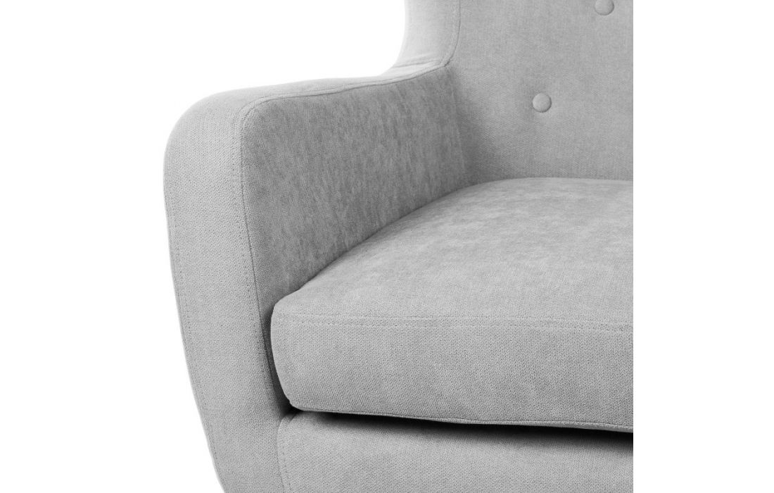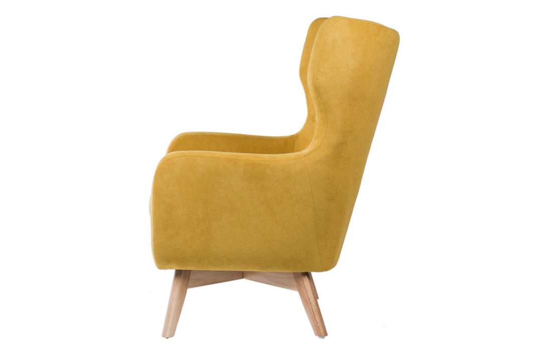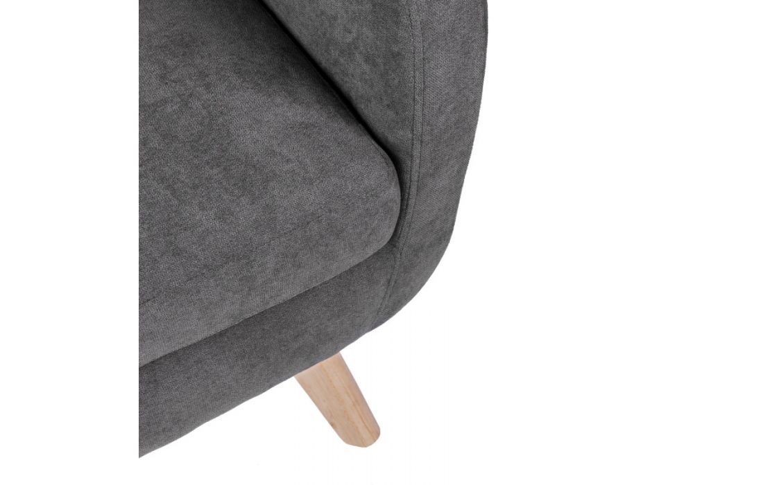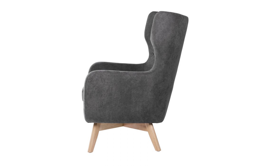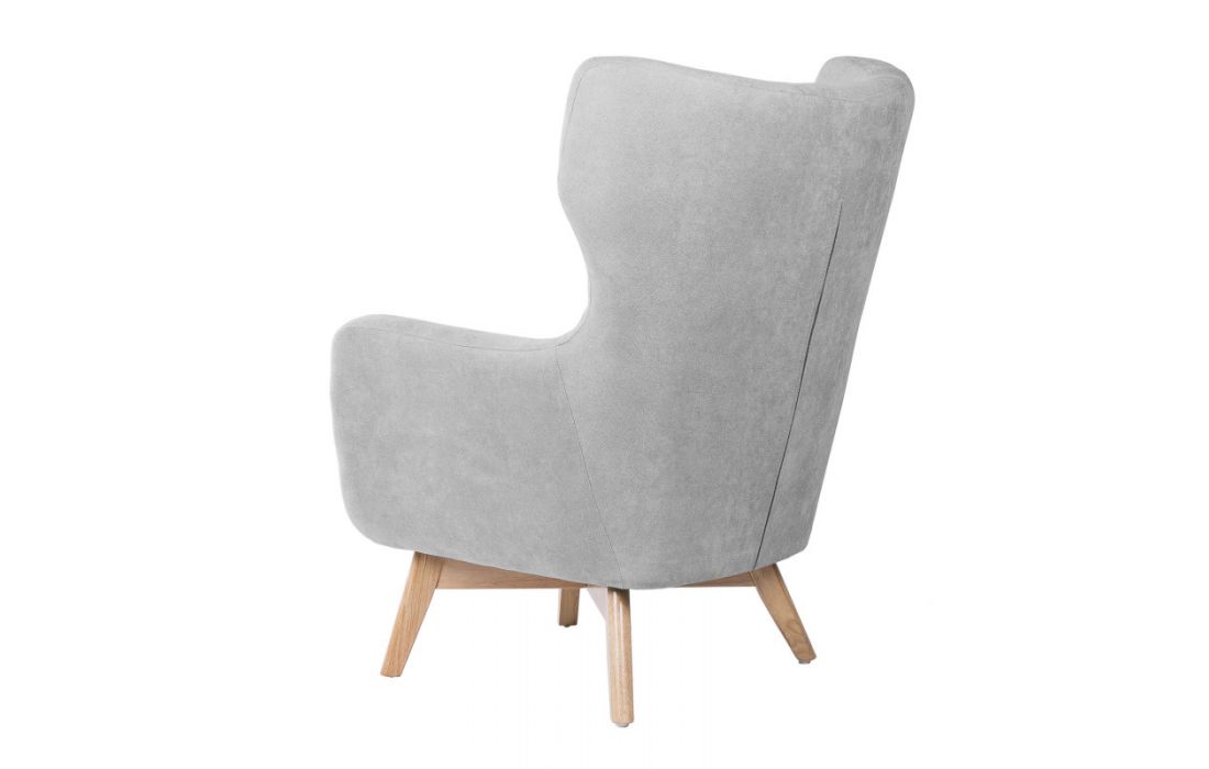 Cadeirão com pés em madeira cor natural e estofo em tecido cinza claro, cinza escuro, mostarda e menta