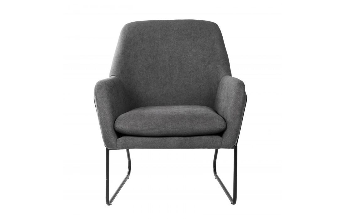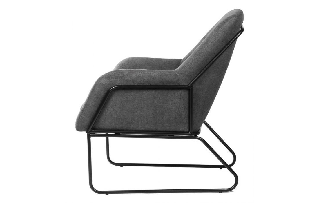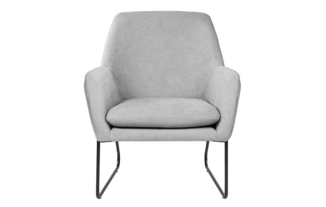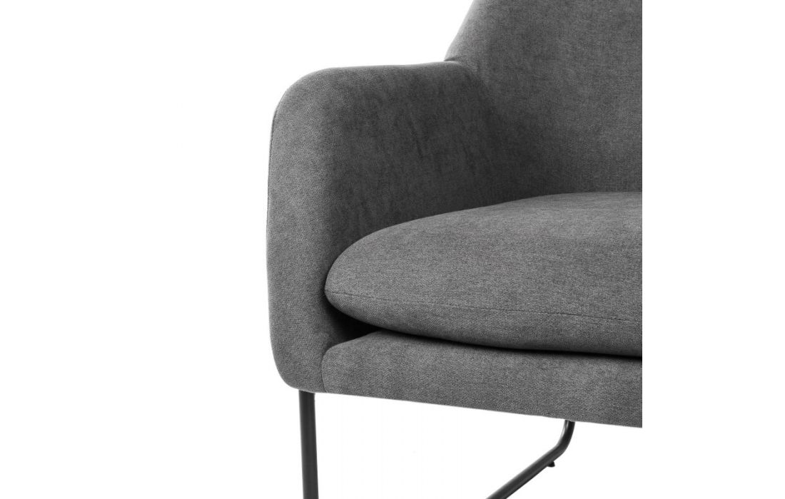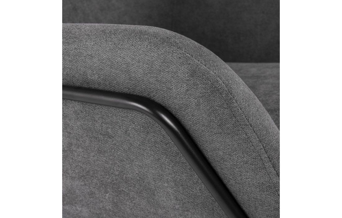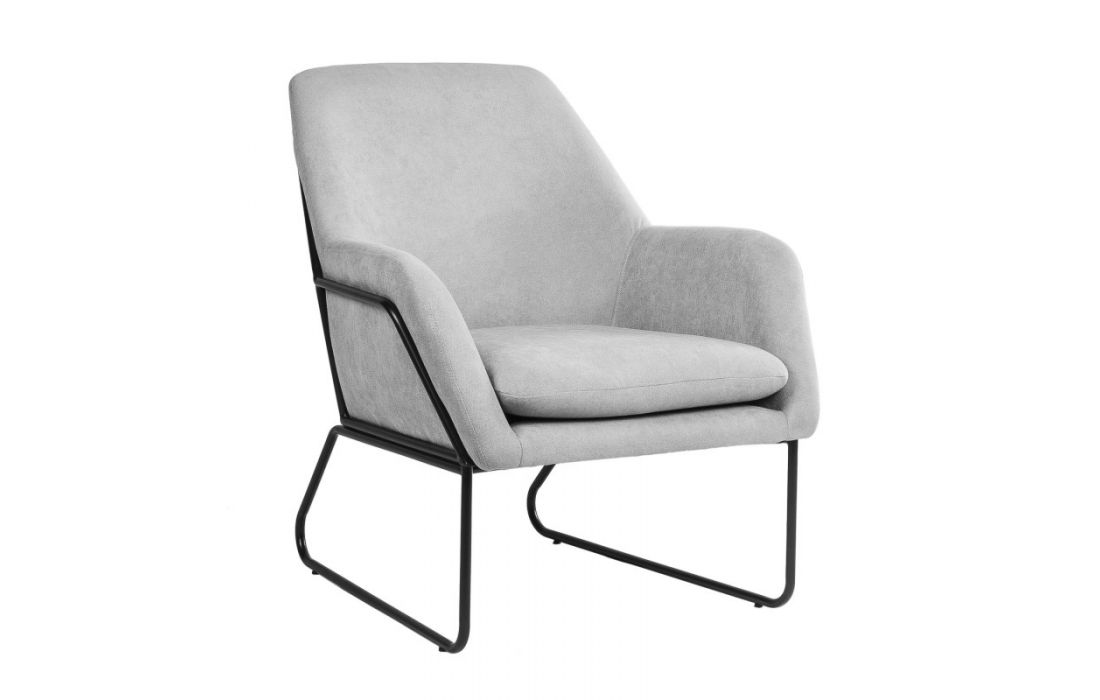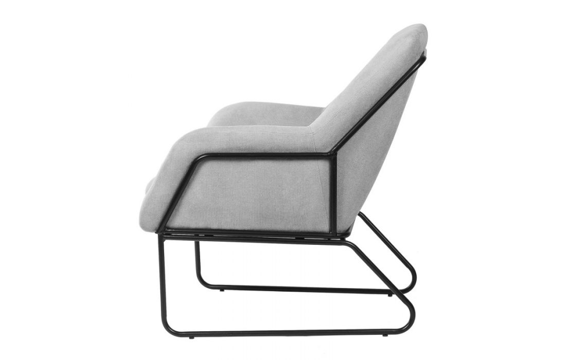Cadeirão com estrutura em metal de cor preta e estofo nas cores cinza claro, cinza escuro, menta e lilás