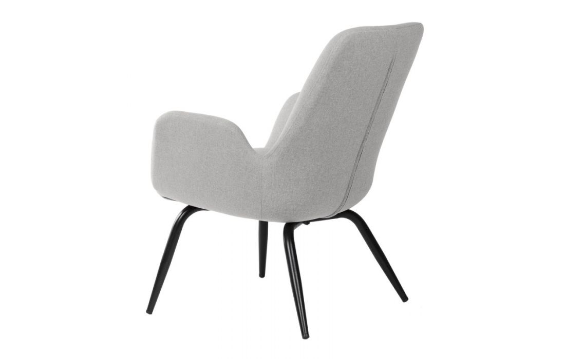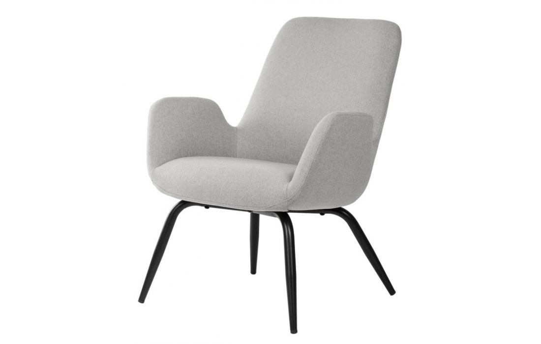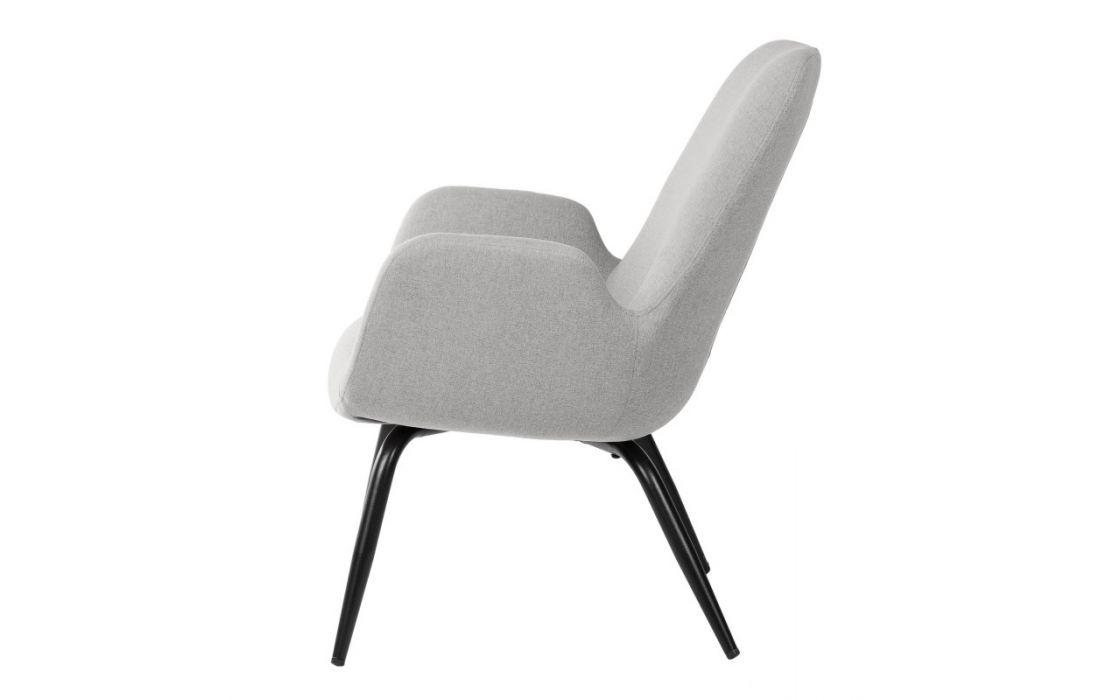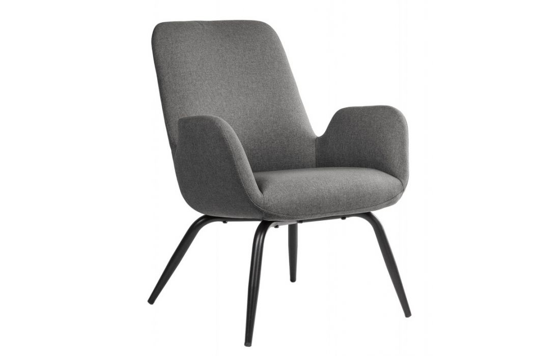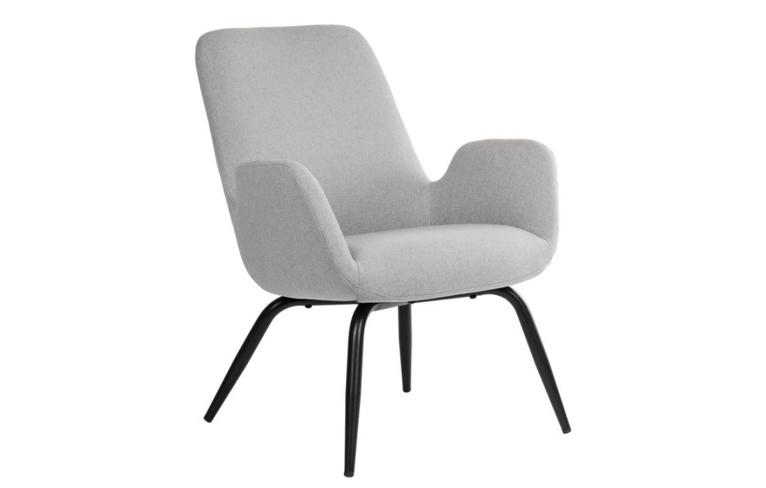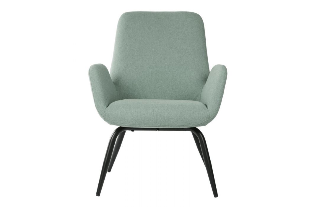 Cadeirão com pés de metal cor preta mate e estofo em tecido nas cores cinza claro, cinza escuro, menta e rosa