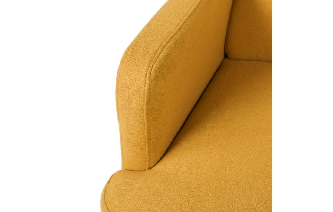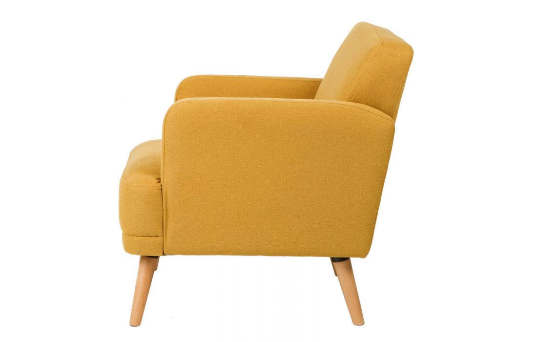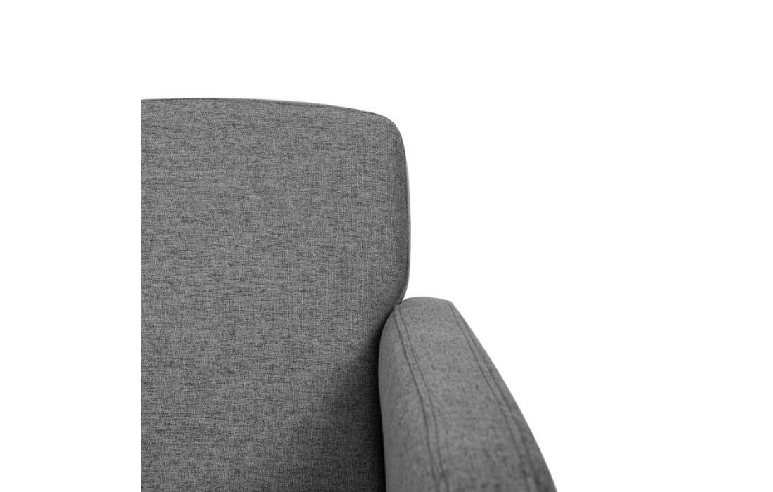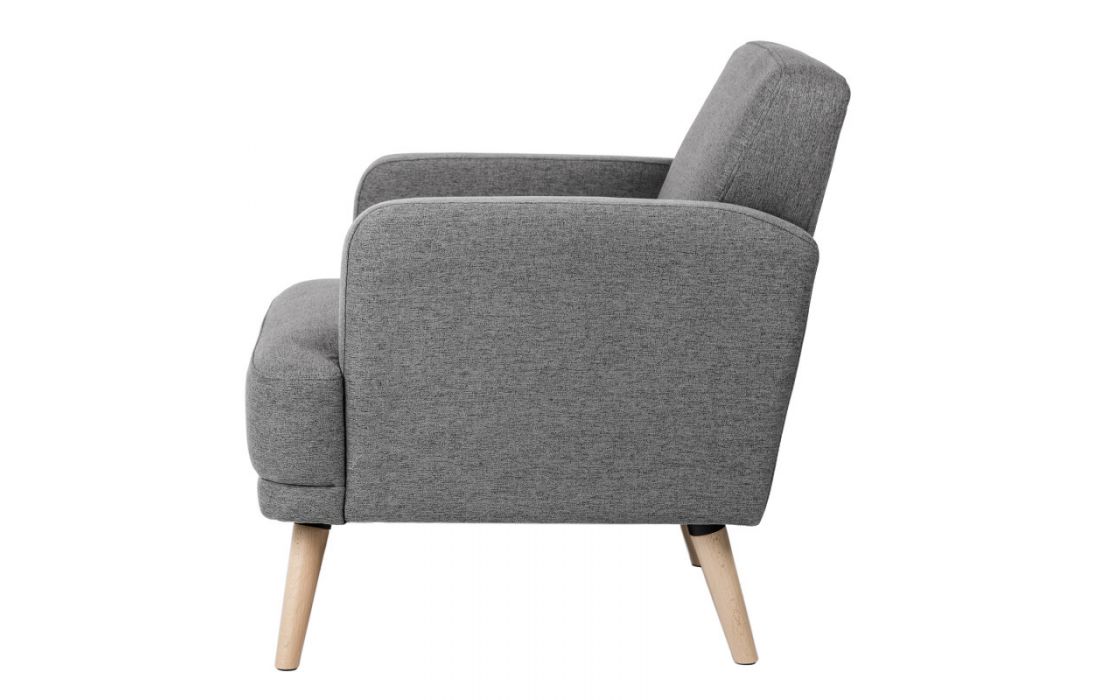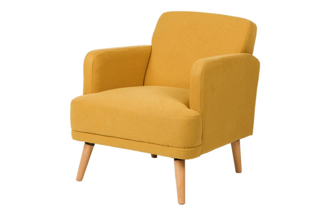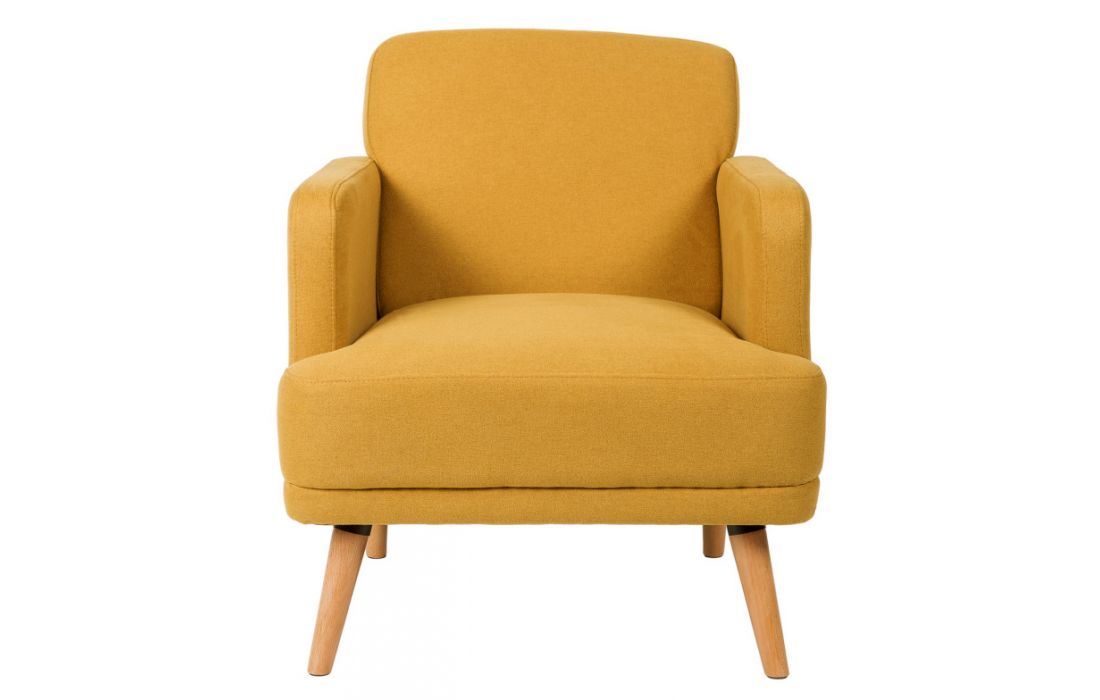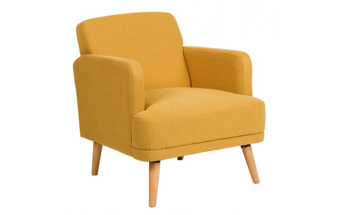 Cadeirão com pés de madeira cor natural e estofo em tecido nas cores cinza claro, cinza escuro e mostarda