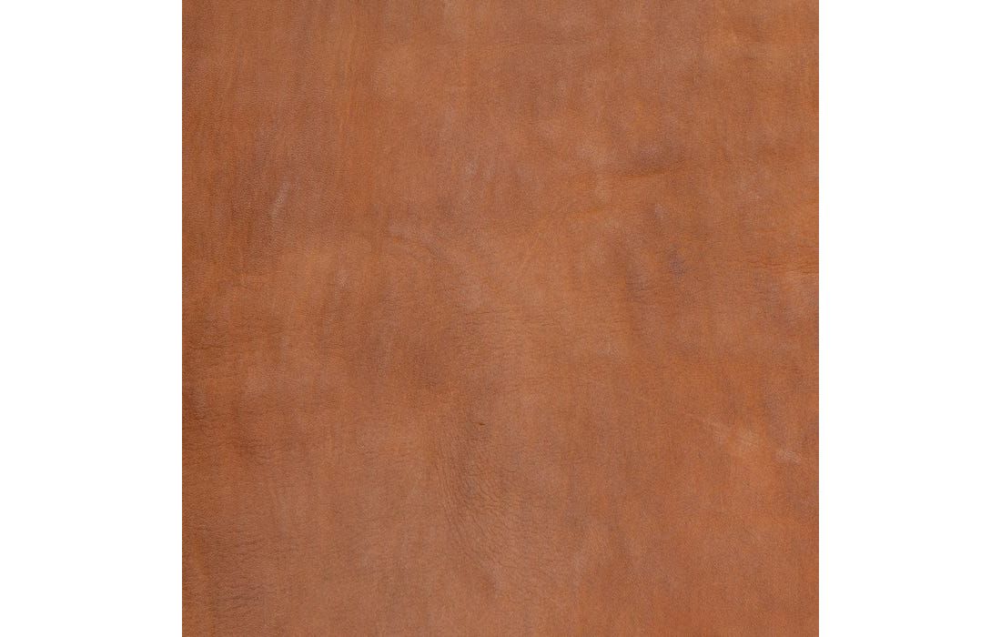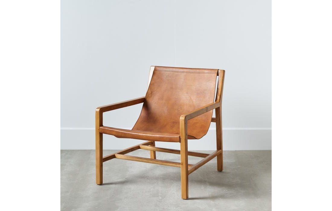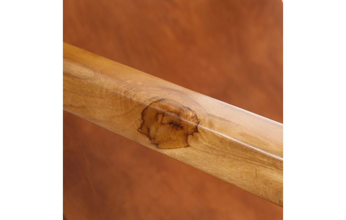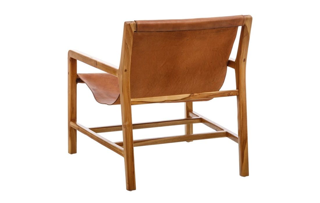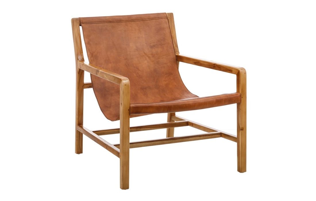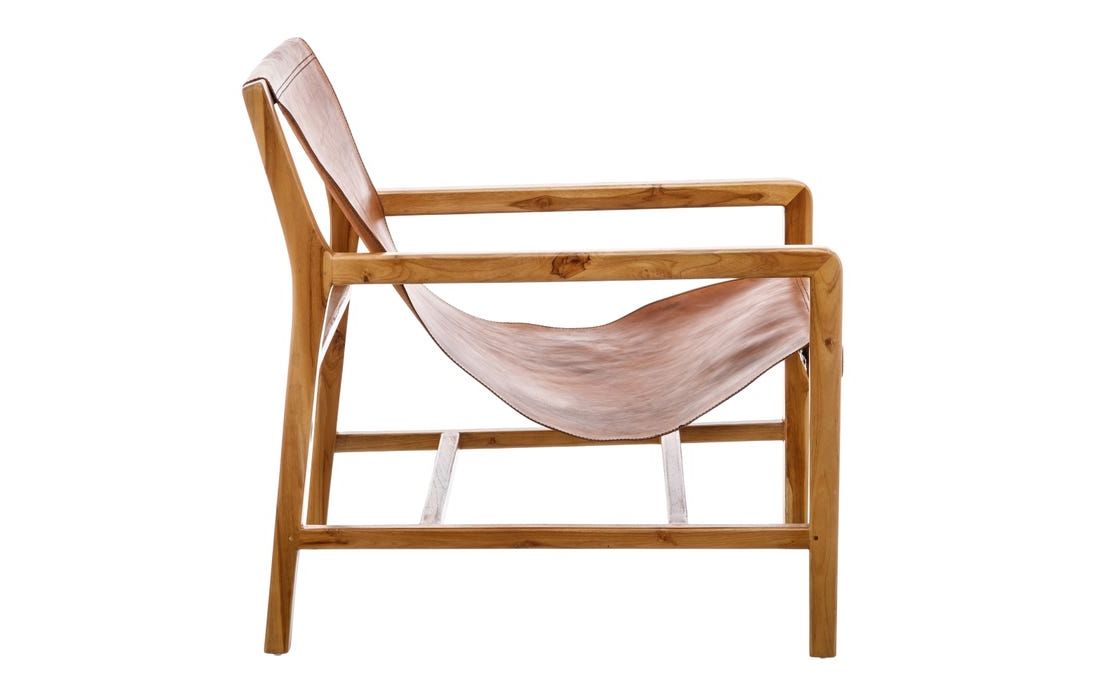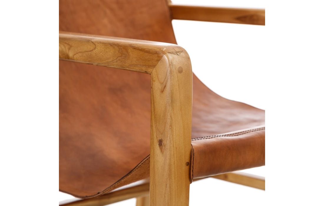 Poltrona estofada em couro de bovino e com estrutura em madeira teca.