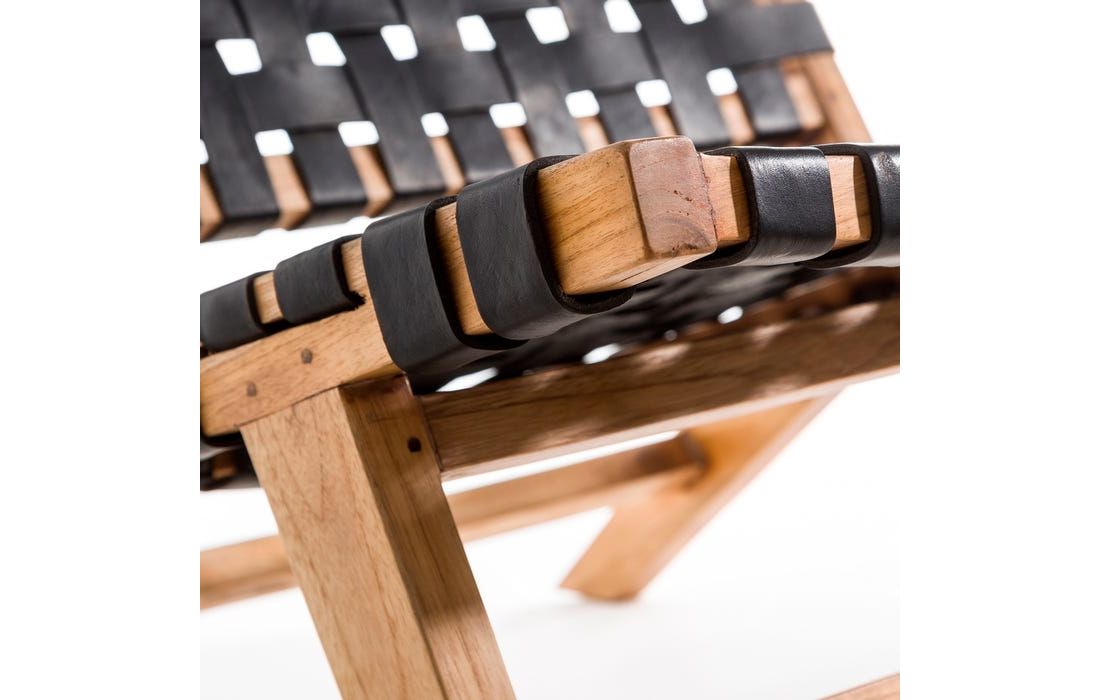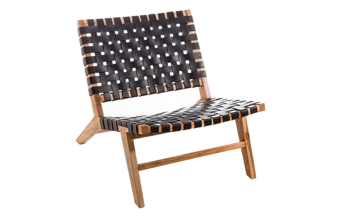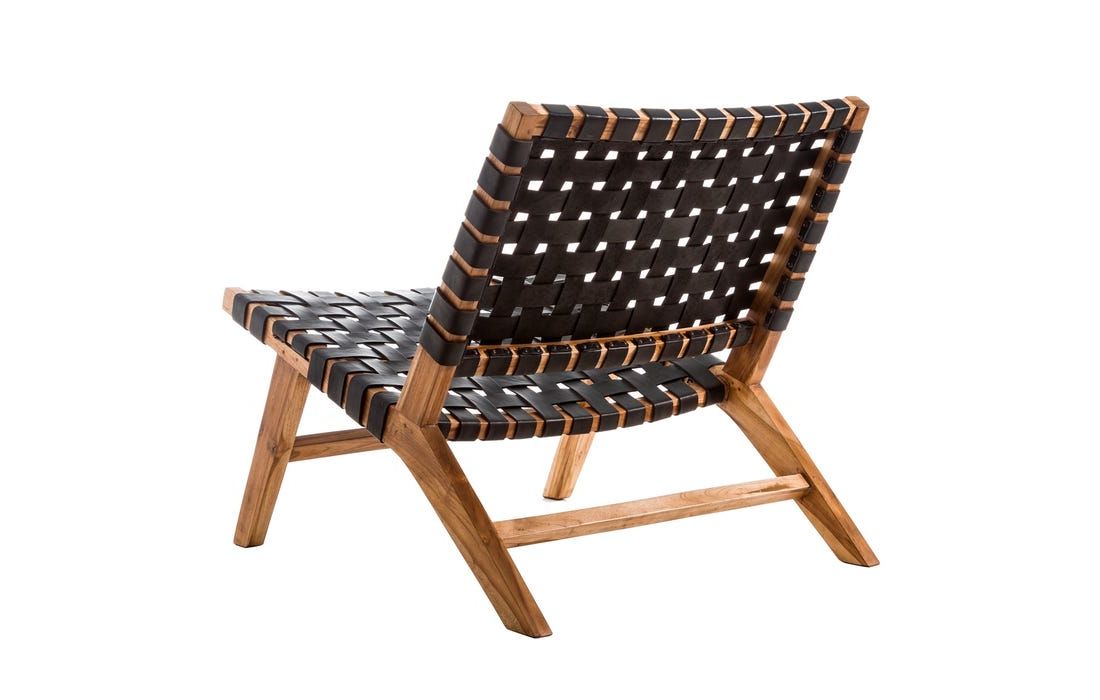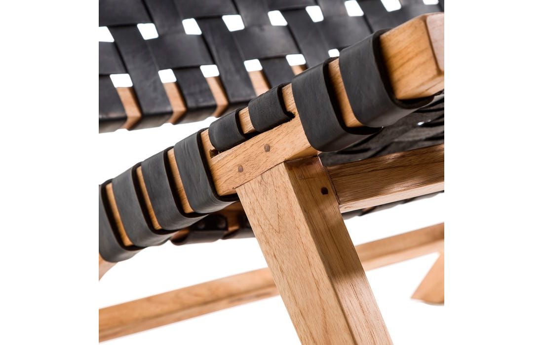Poltrona em couro trançado à mão com acabamento preto e estrutura em madeira teca macica com acabamento natural.