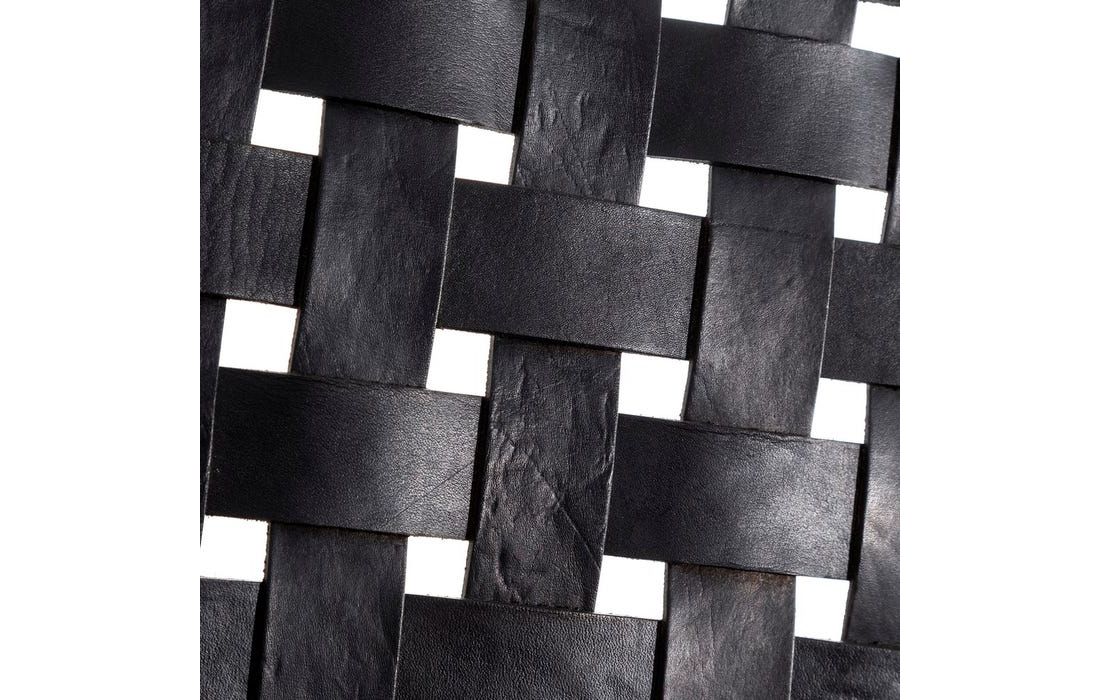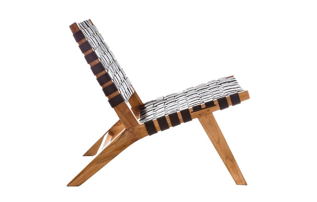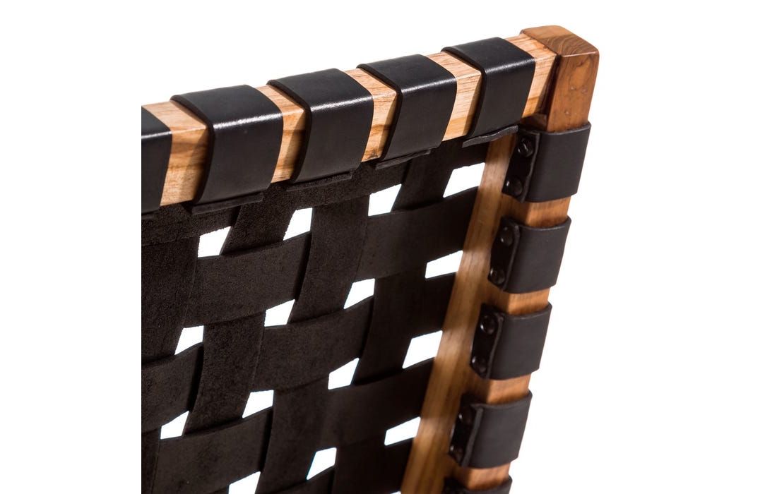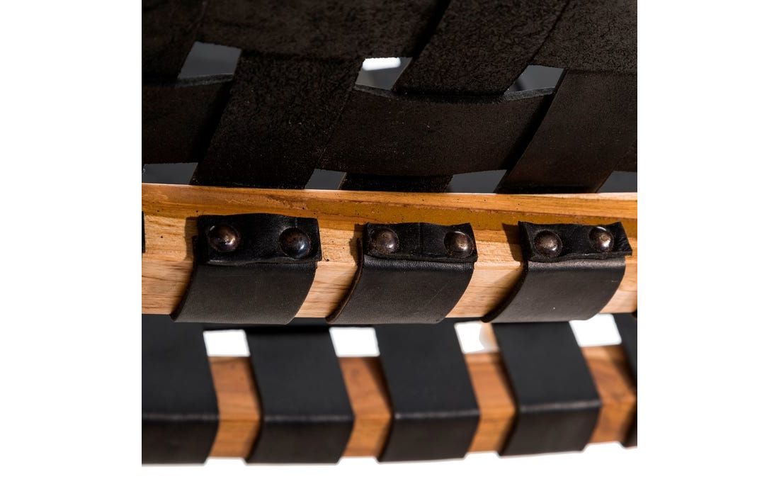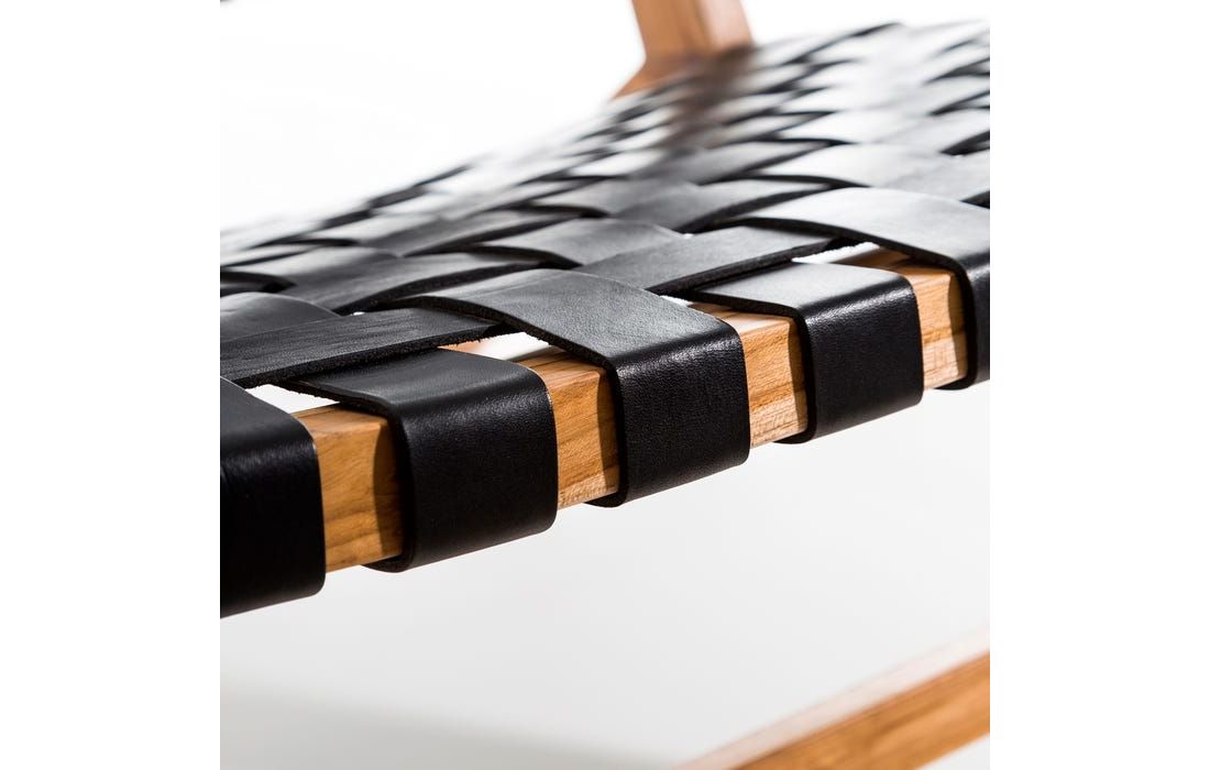 Poltrona em couro trançado à mão com acabamento preto e estrutura em madeira teca macica com acabamento natural.
