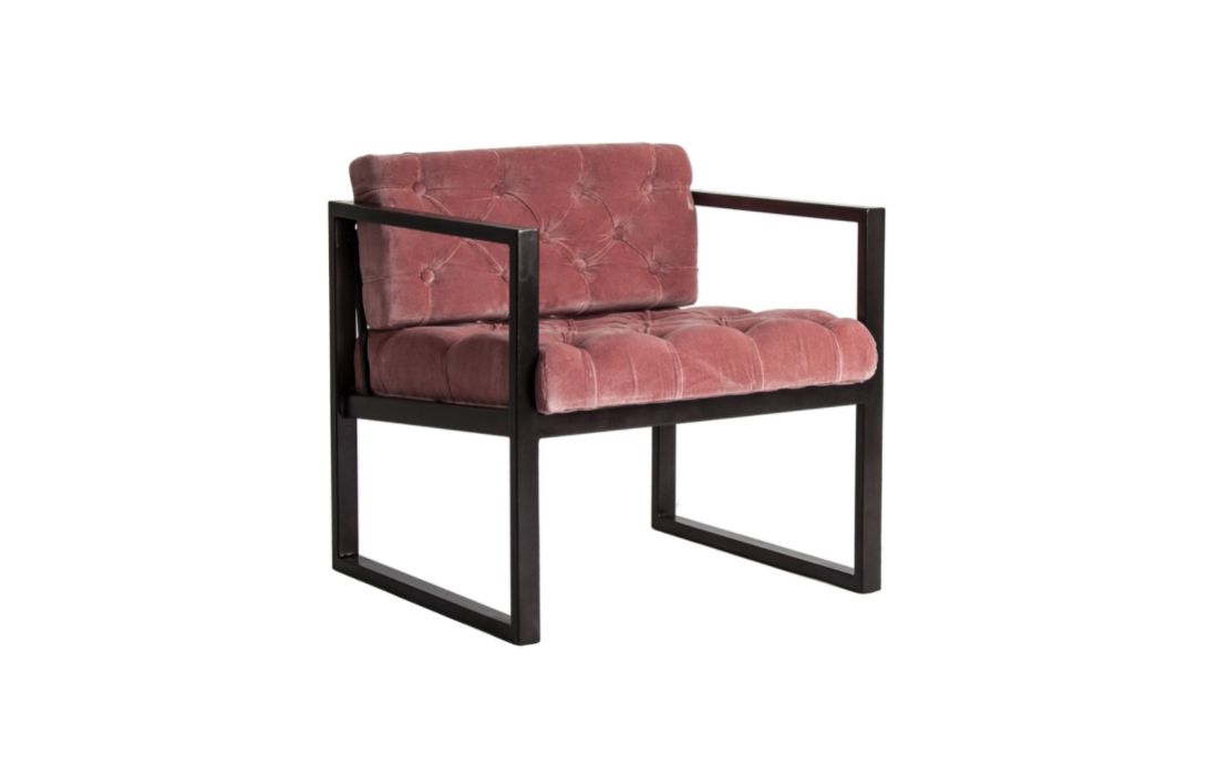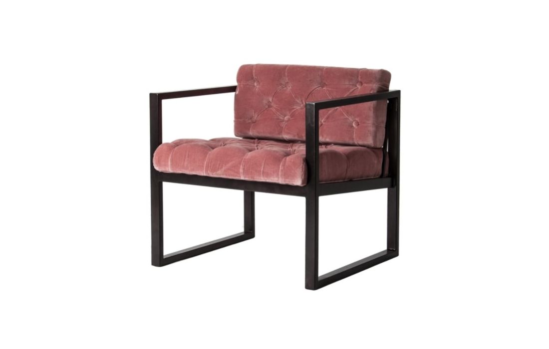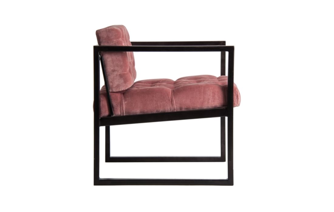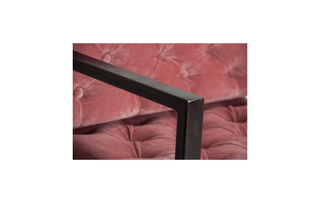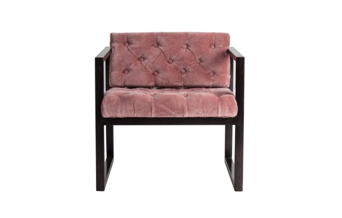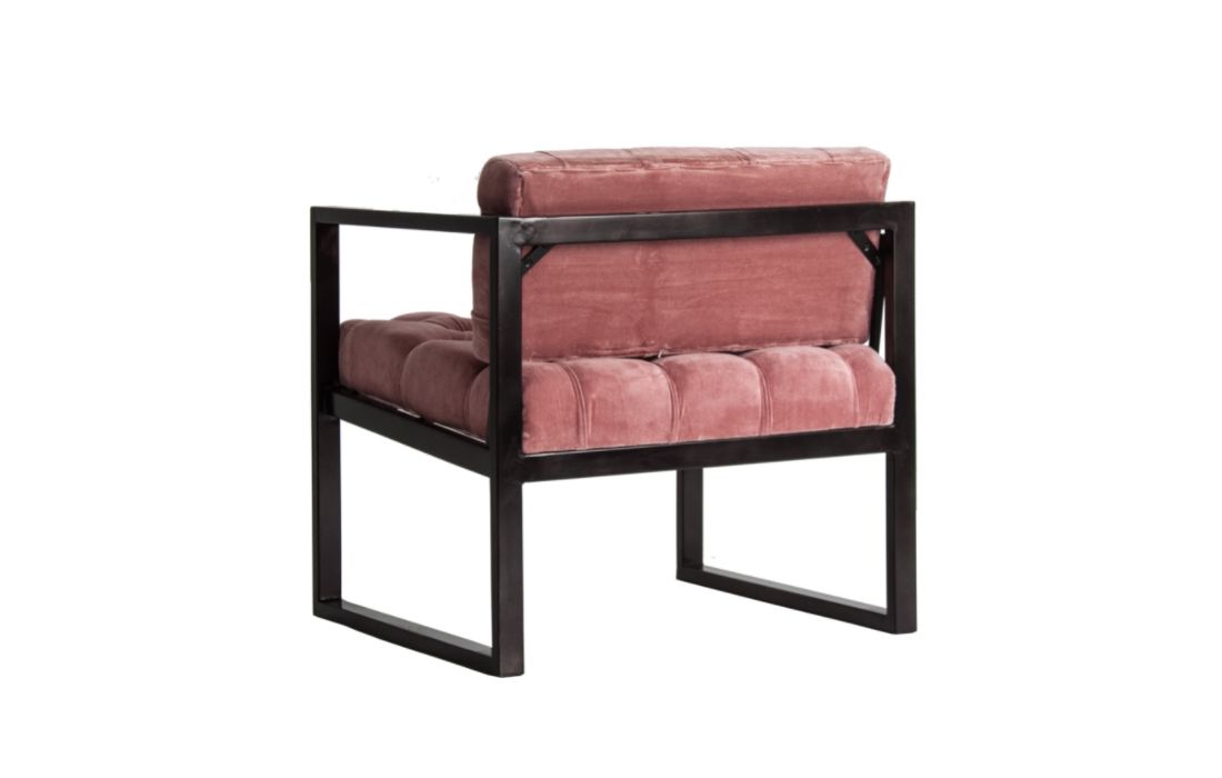 Poltrona estilo shabby chic feito de ferro e veludo na cor rosa.