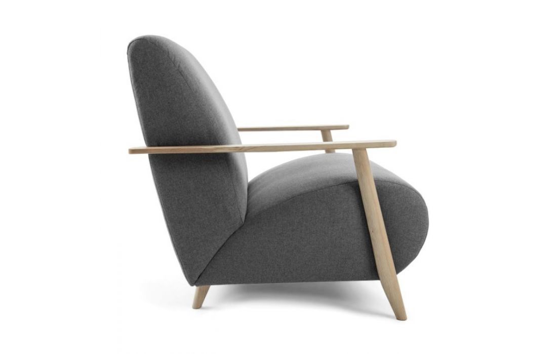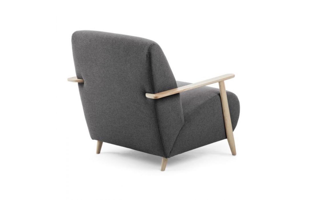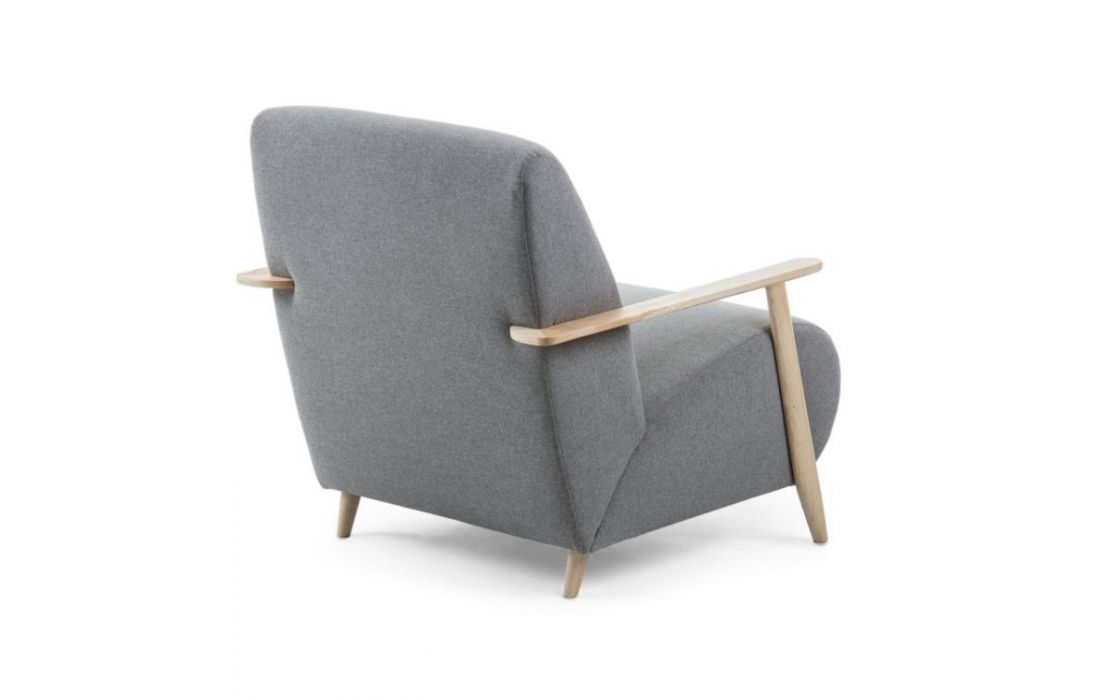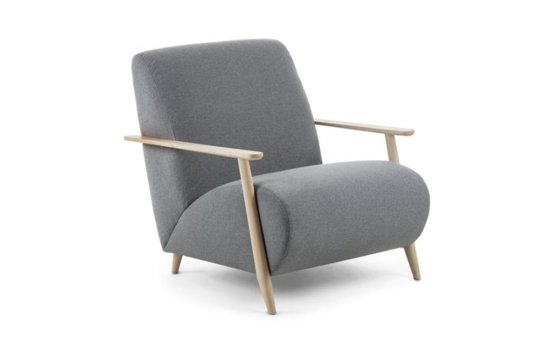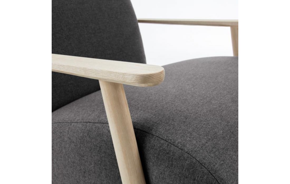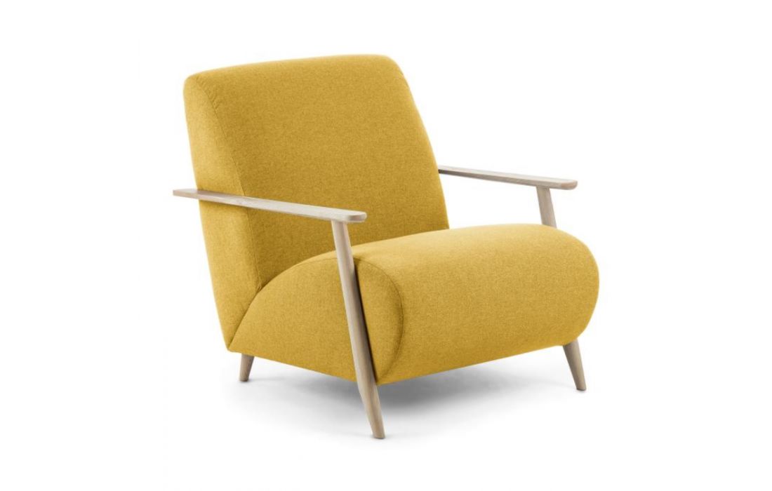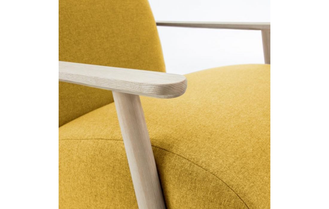 Cadeirão estofado em tecido e braços em madeira de freixo. Disponível em várias cores.Destinatário :