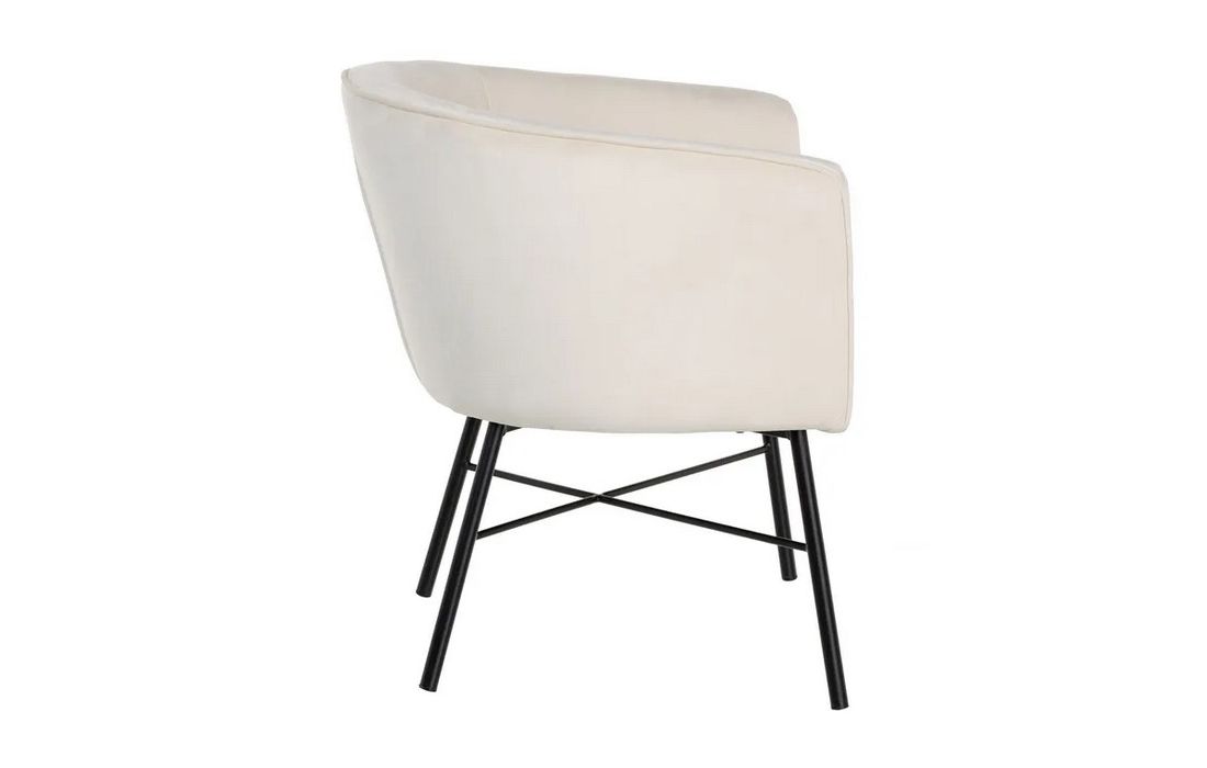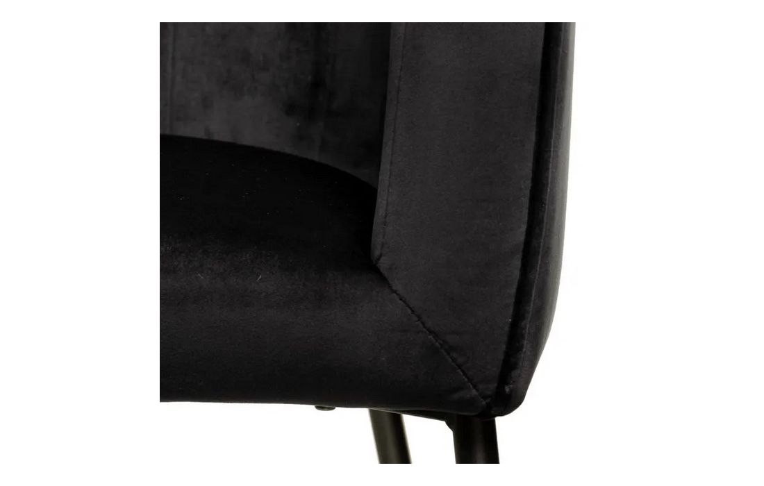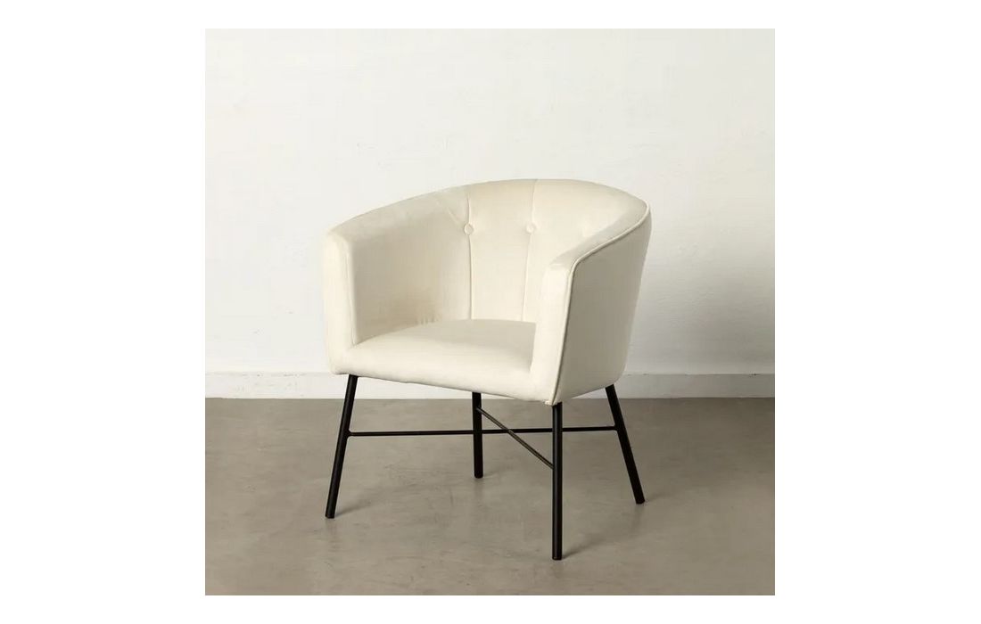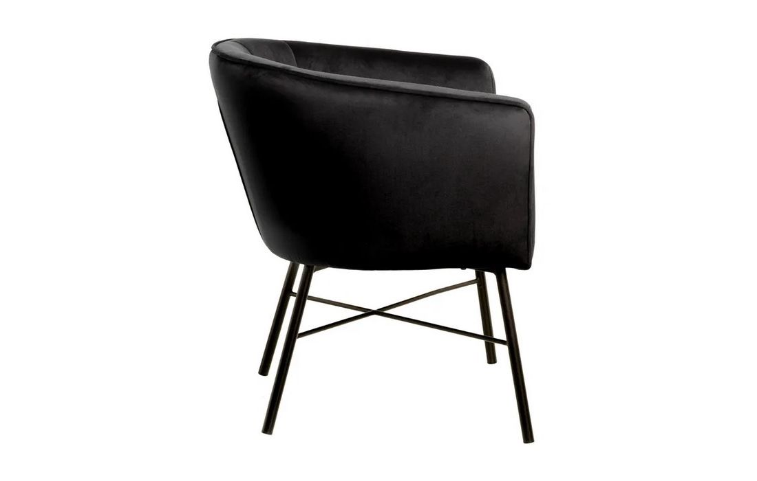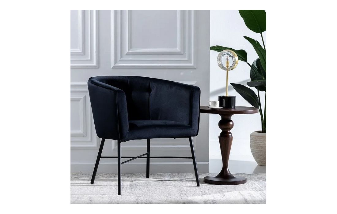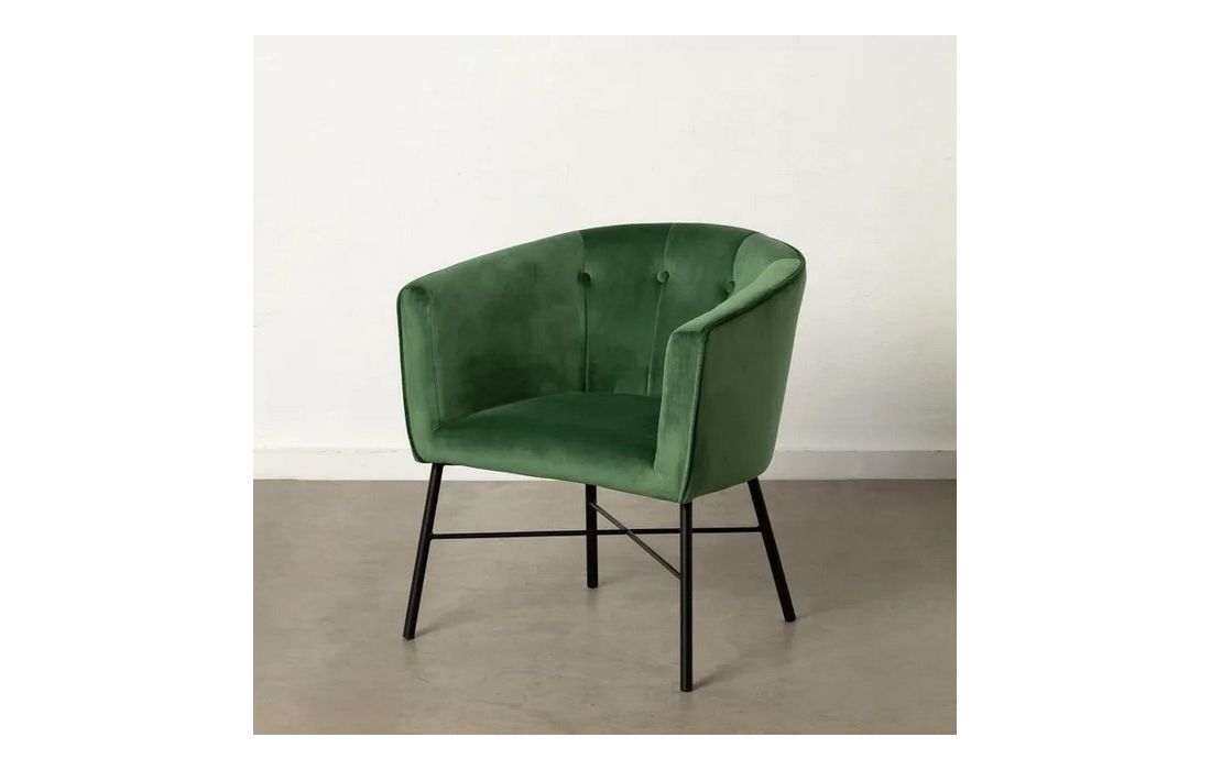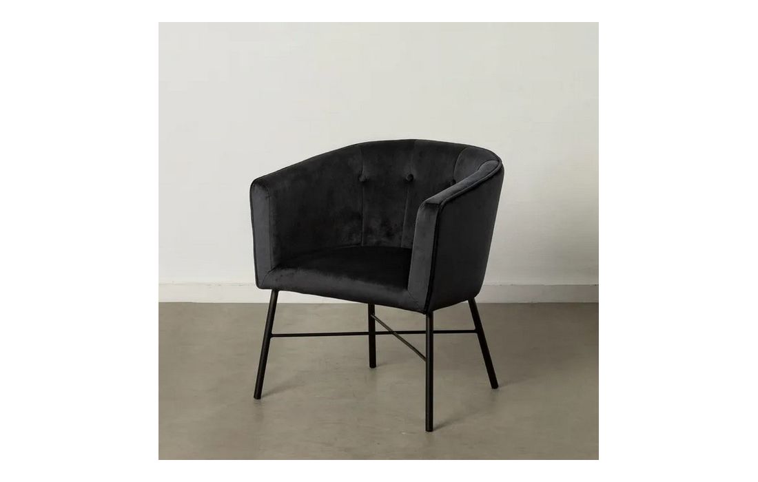 Poltrona com pé de aço preto estofada em tecido de veludo.