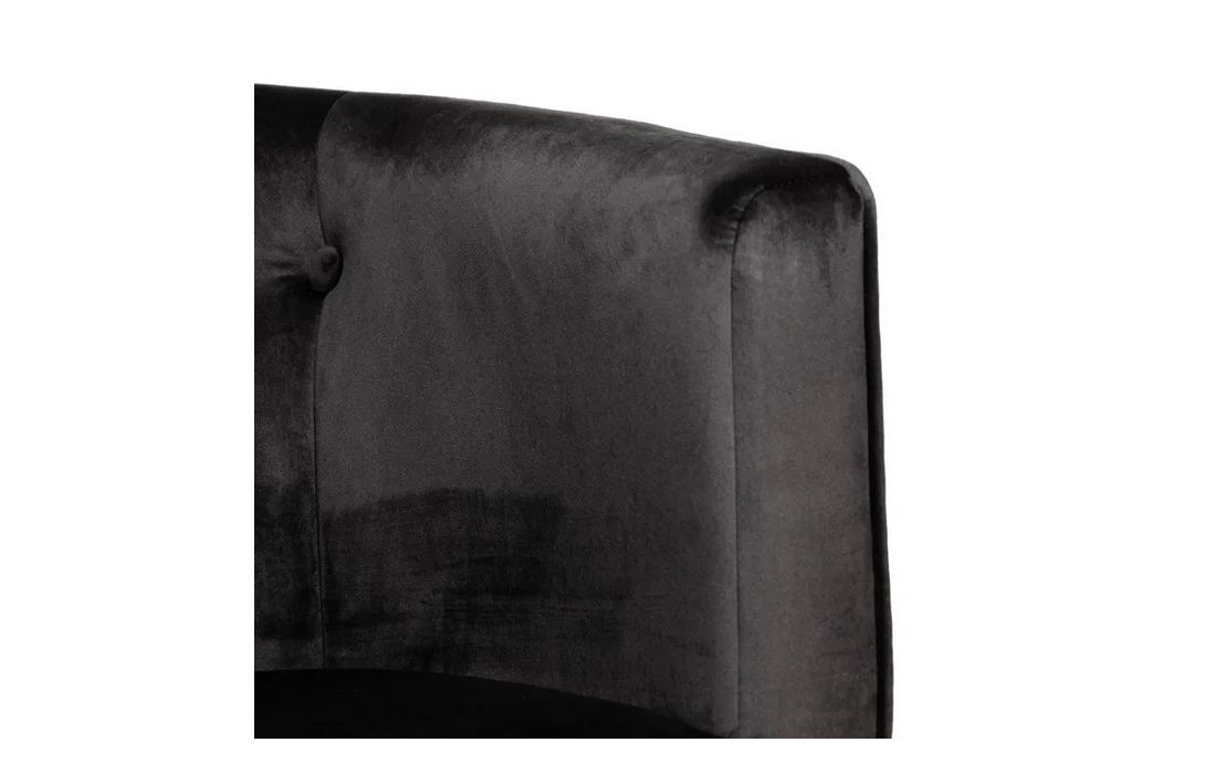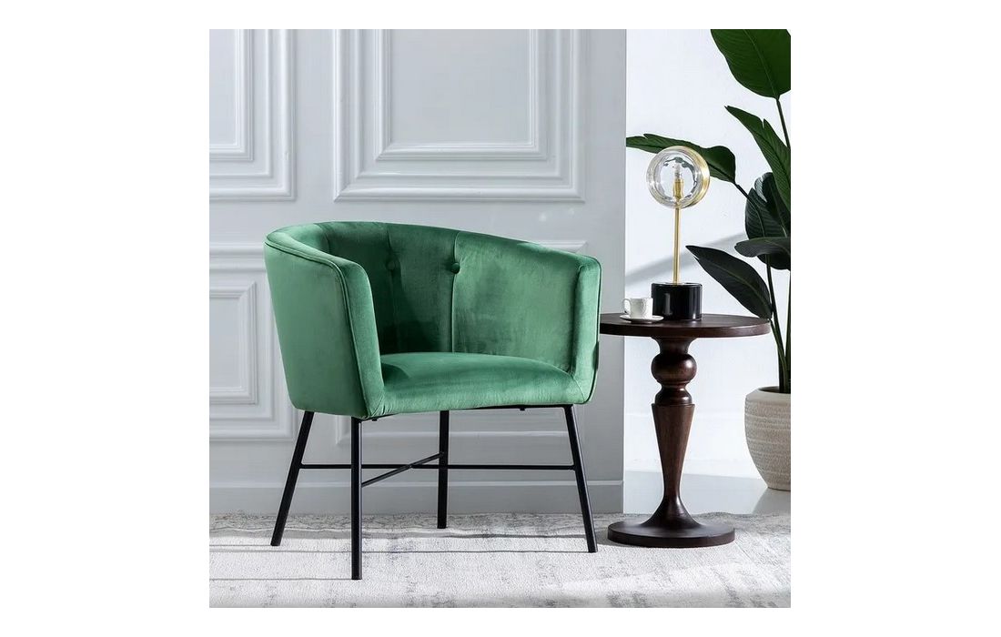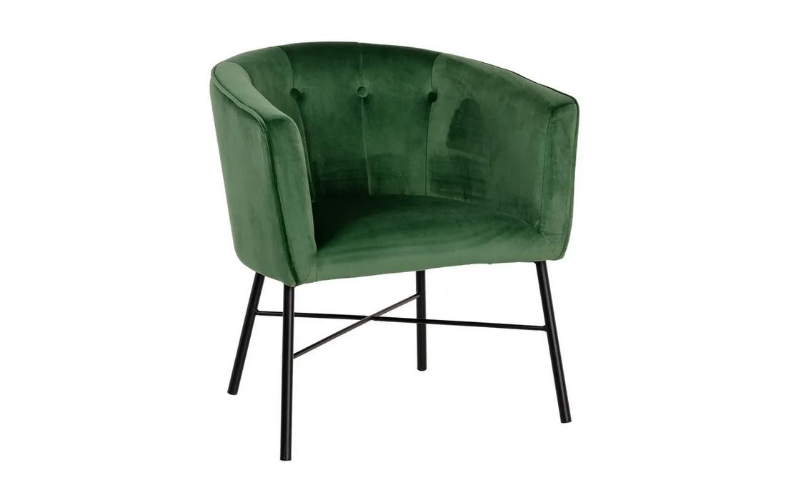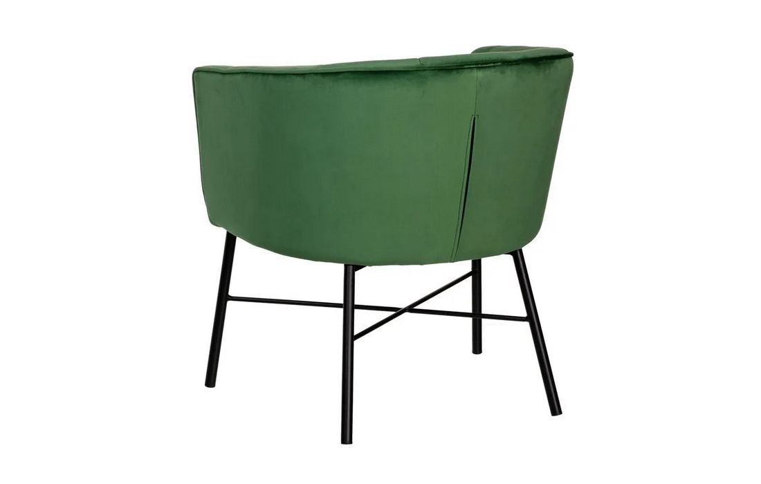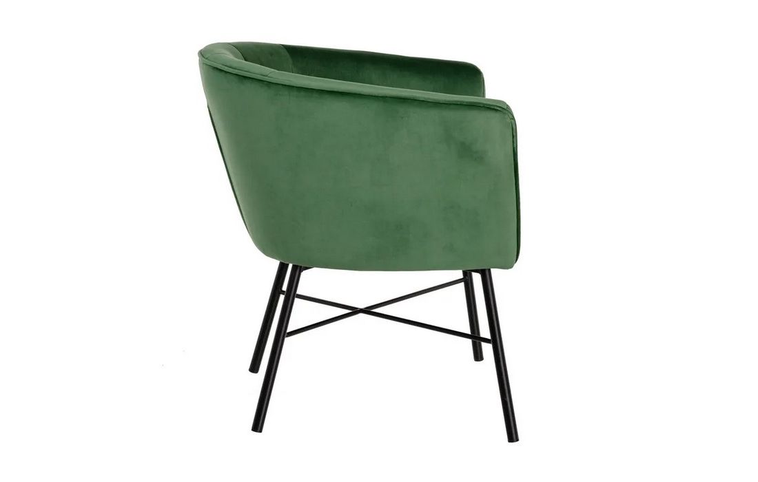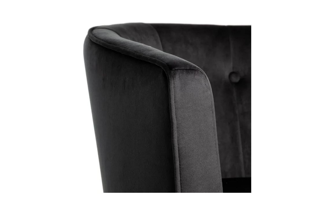 Poltrona com pé de aço preto estofada em tecido de veludo.