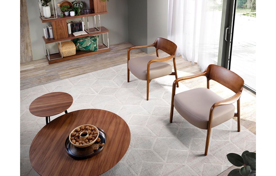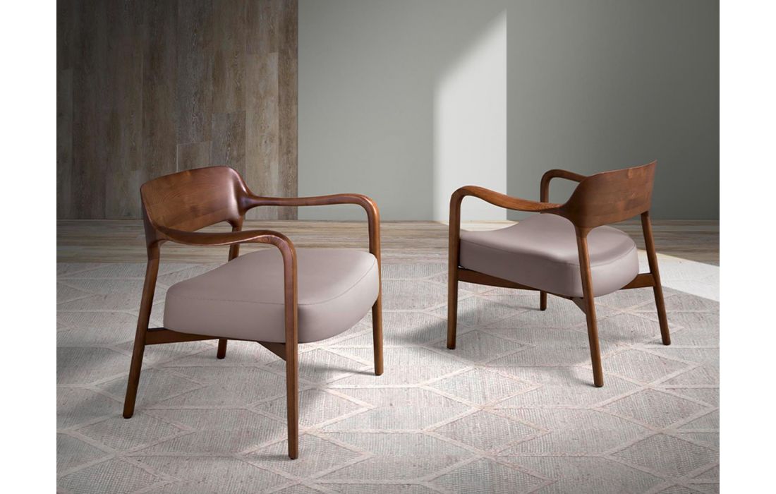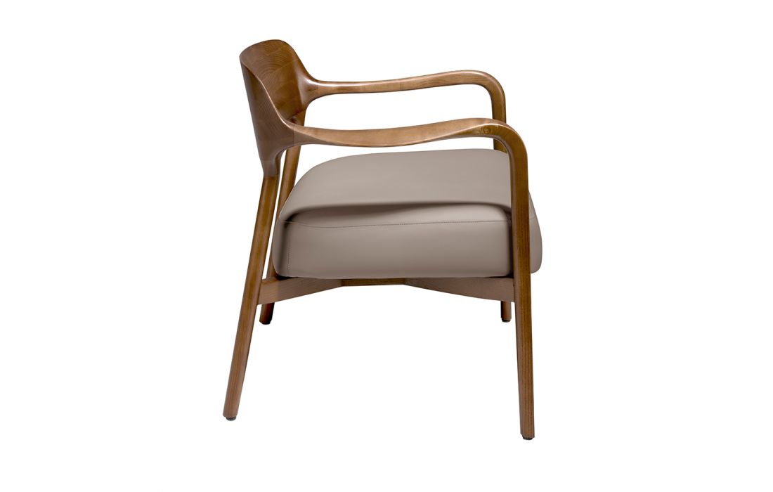 Poltrona estofada em pele sintética com estrutura em madeira maciça de freixo, pintada na cor nogueira.