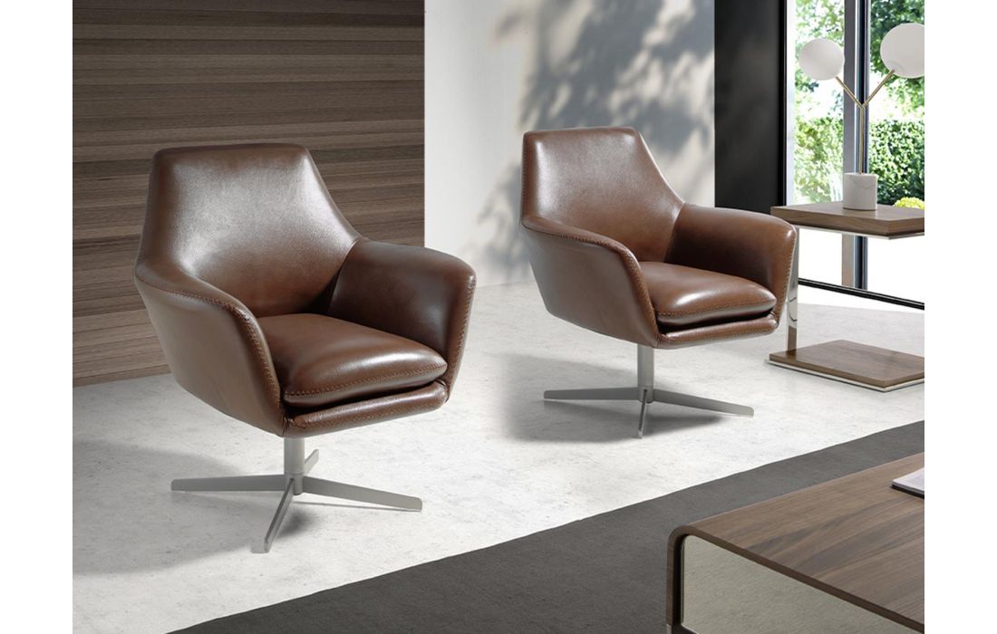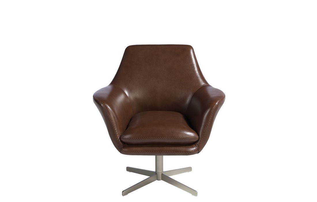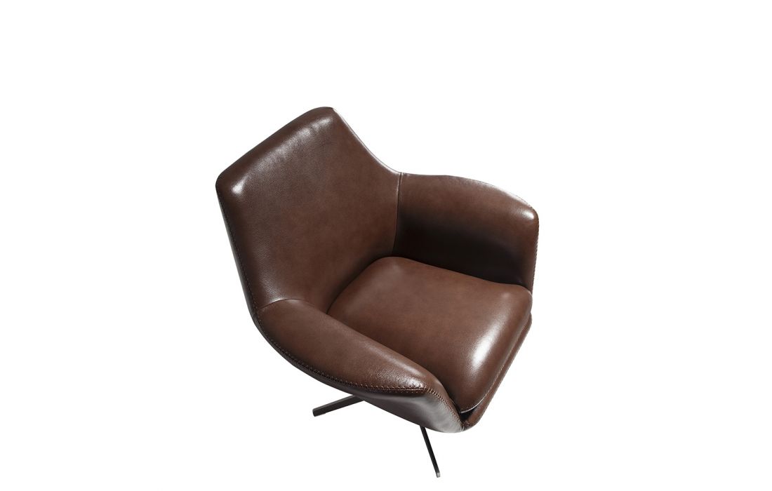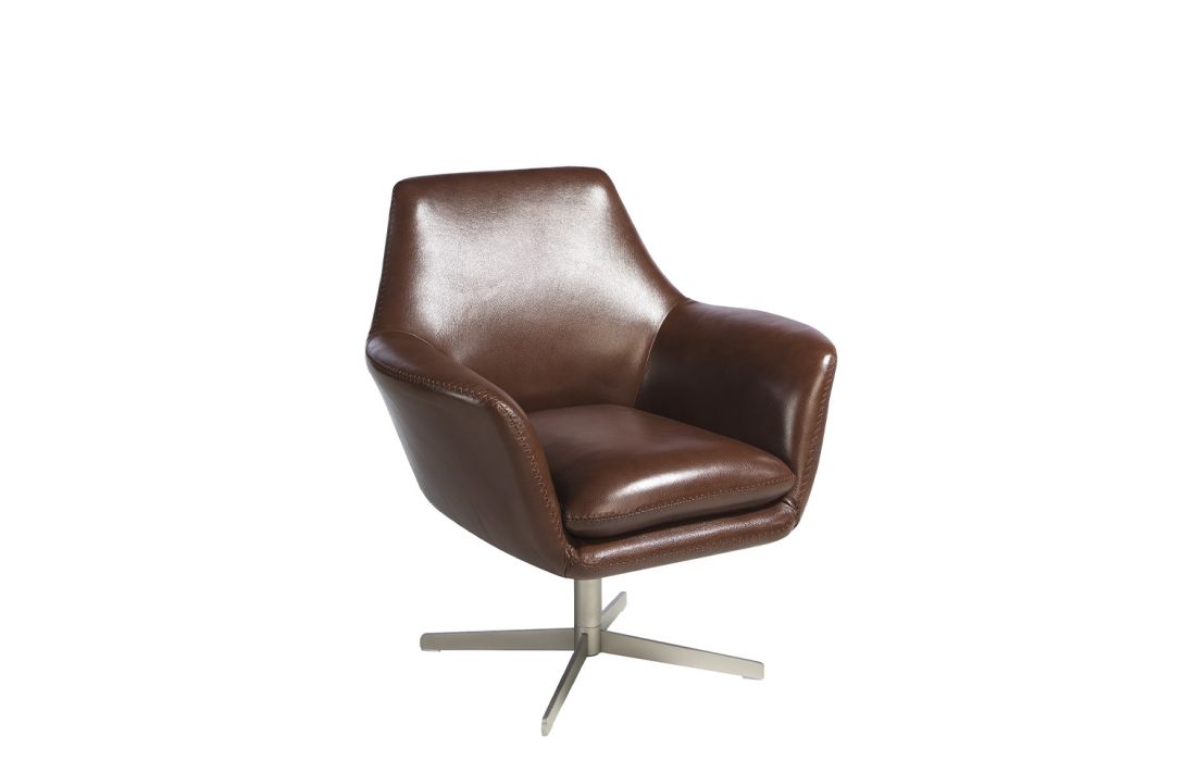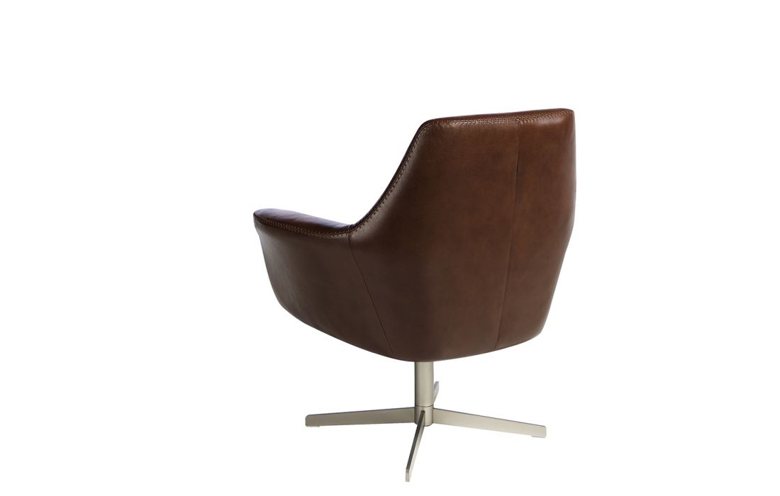 Poltrona giratória estofada em couro e pernas em aço inoxidável polido.