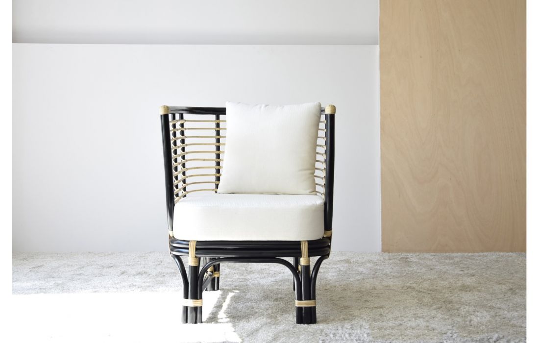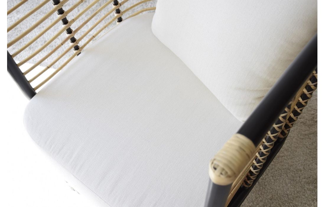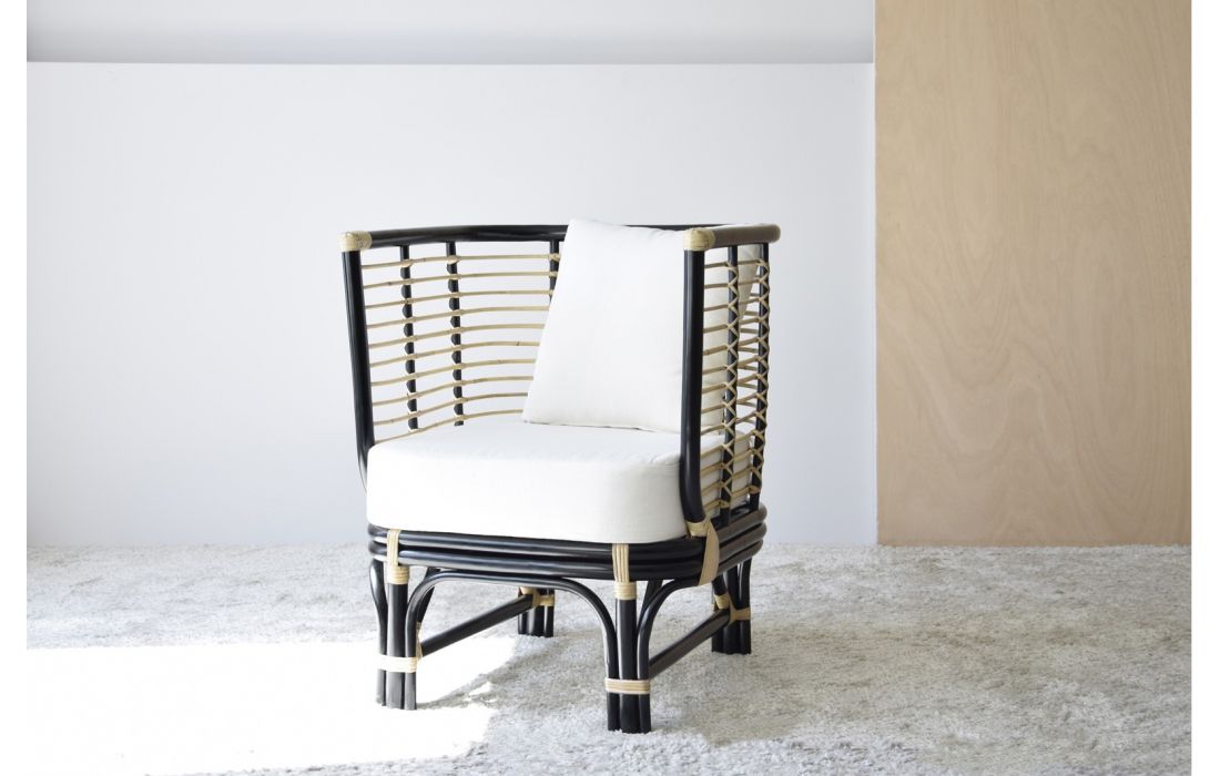 Poltrona feita em ratan na cor natural e preto, palhinha. Inclui almofada de tecido 100% algodão no tom creme.