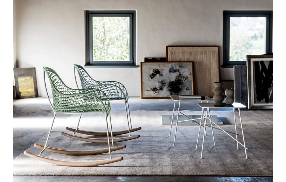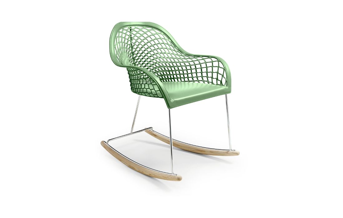 Poltrona baloiço com estrutura em metal com assento e encosto em couro.